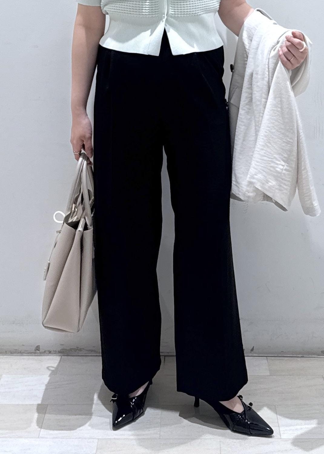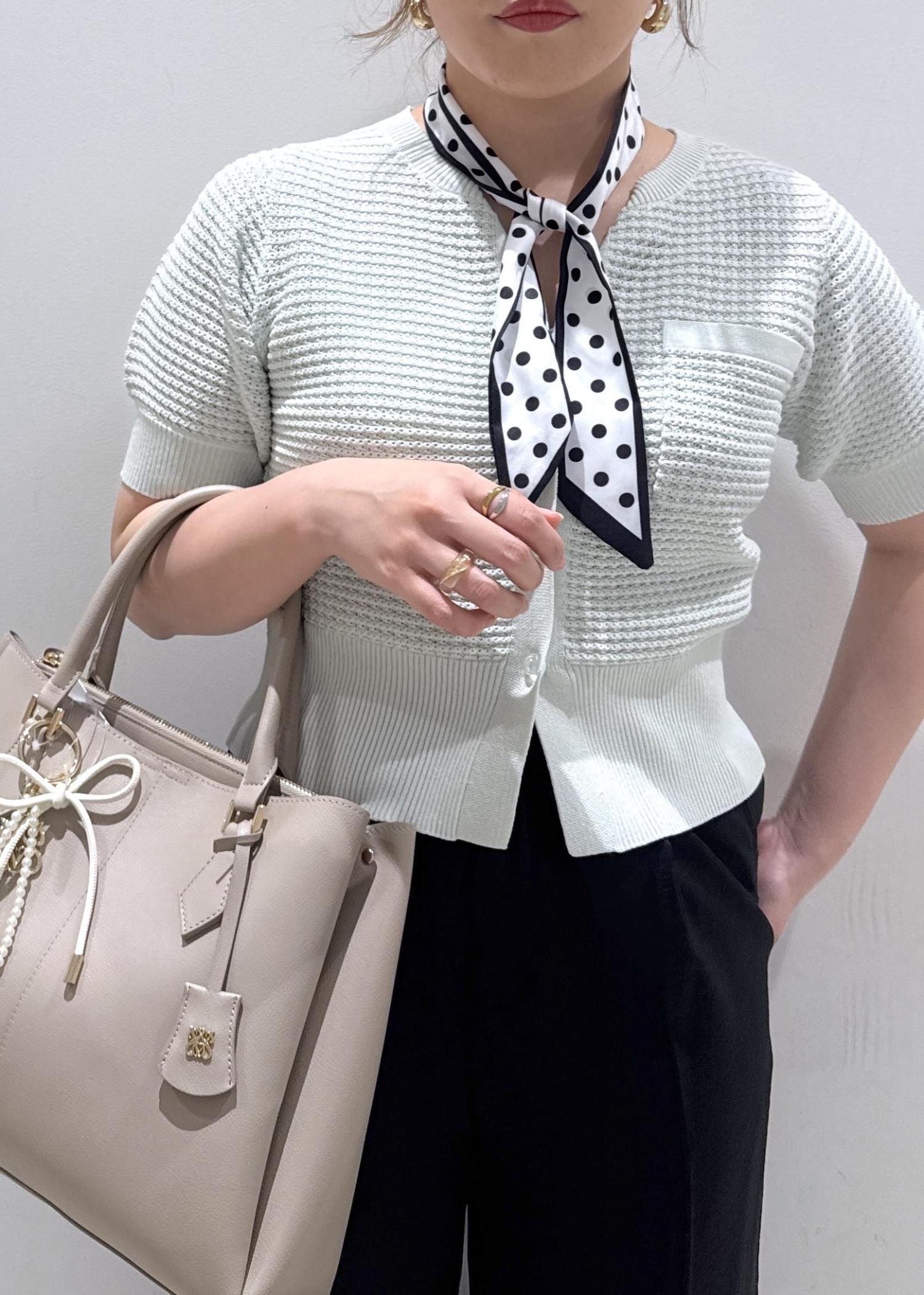 今回は新作で入荷しました、メッシュ素材の夏物パールカーディガンに美easyリネンライクワイドパンツと合わせてお仕事でも使える綺麗めなコーディネートにしてみました♪