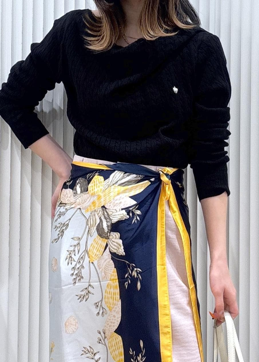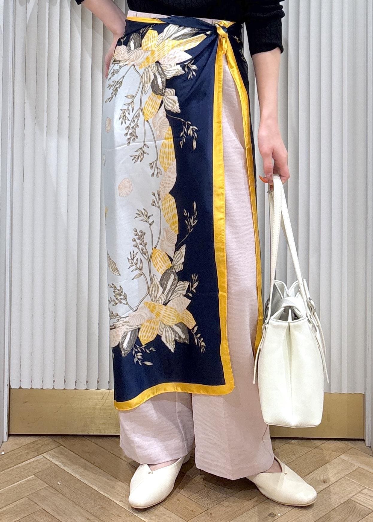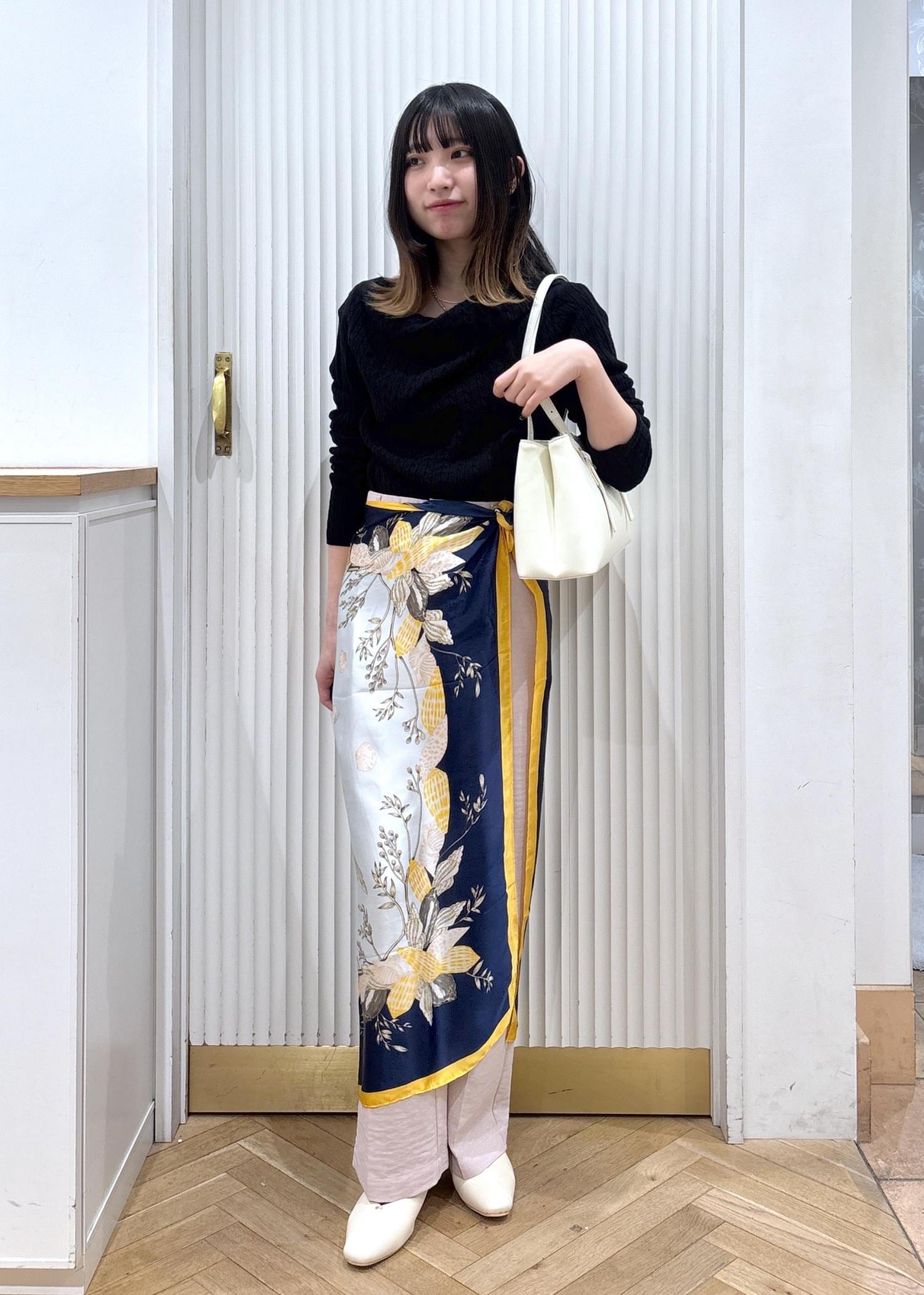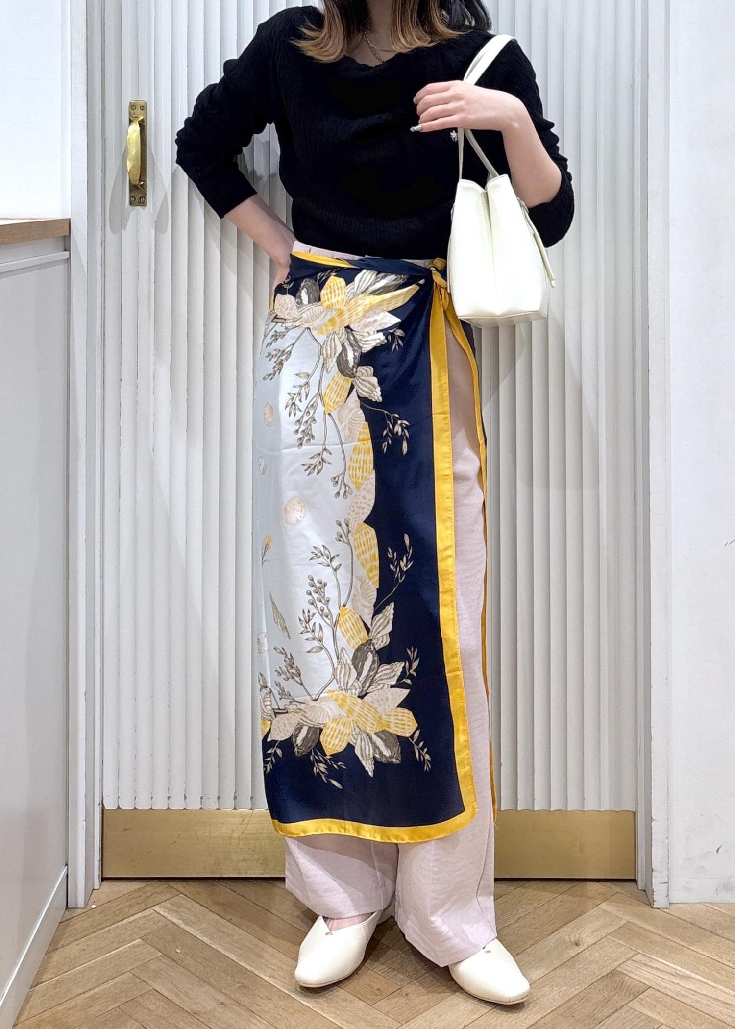 ドレープニットを使った春コーデです!パンツとニットだけではシンプルすぎますがスカーフを巻くことで華やかさもアップします!レイヤードが苦手な方や一枚でドレープニットを着たい方おすすめです!靴やバッグを白にすることで華やかさもアップします☺︎