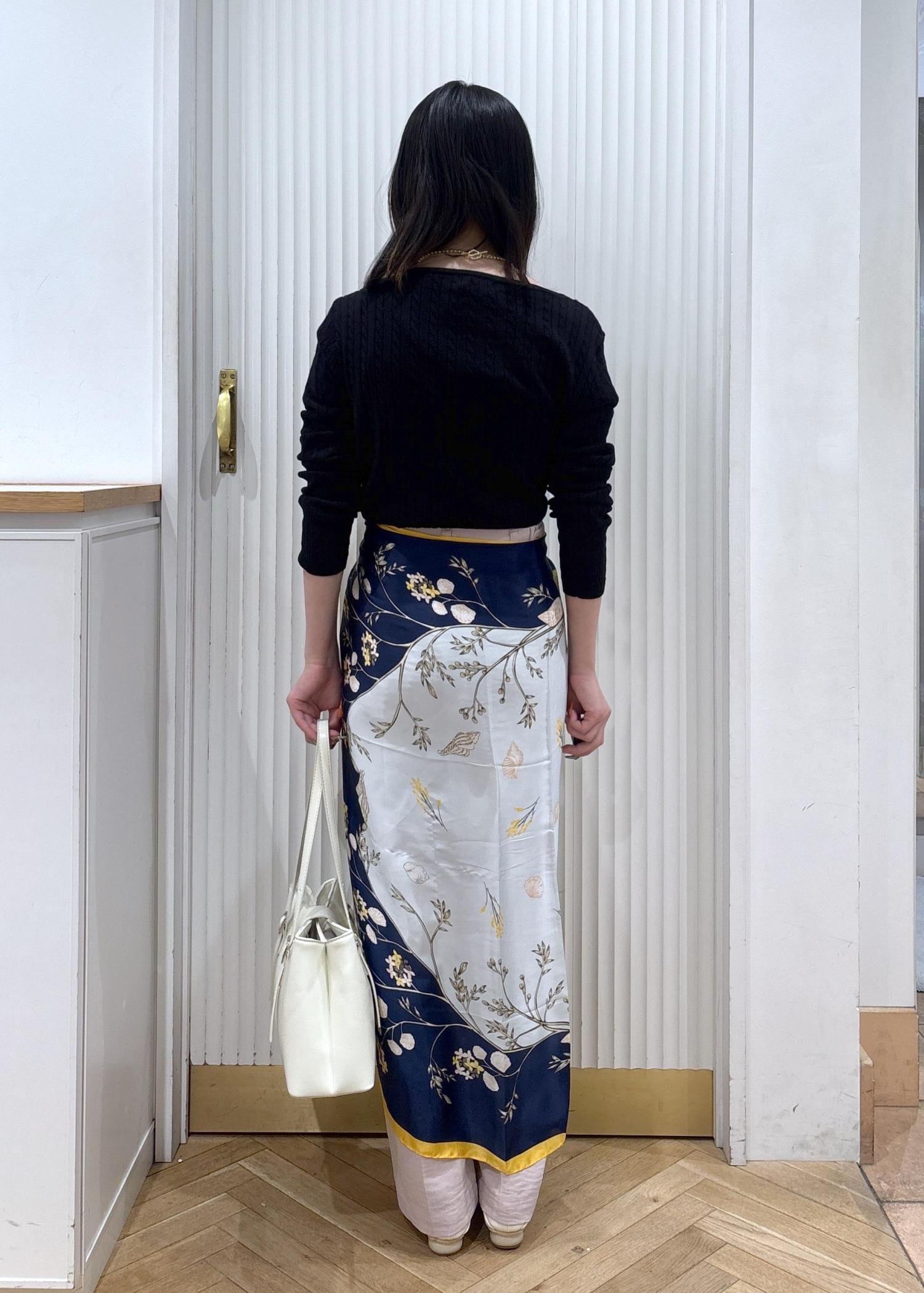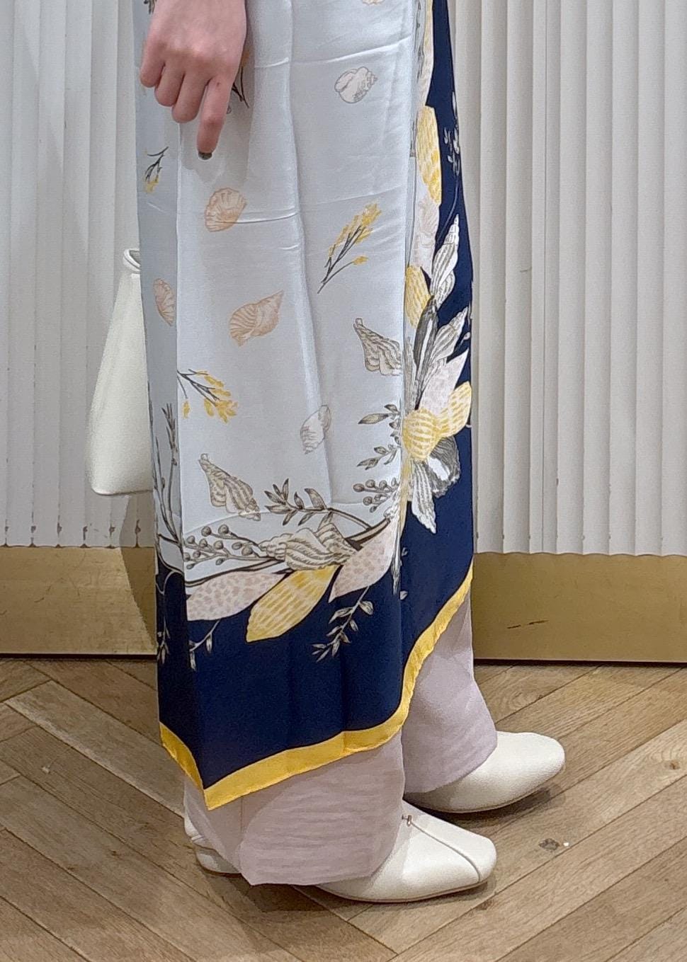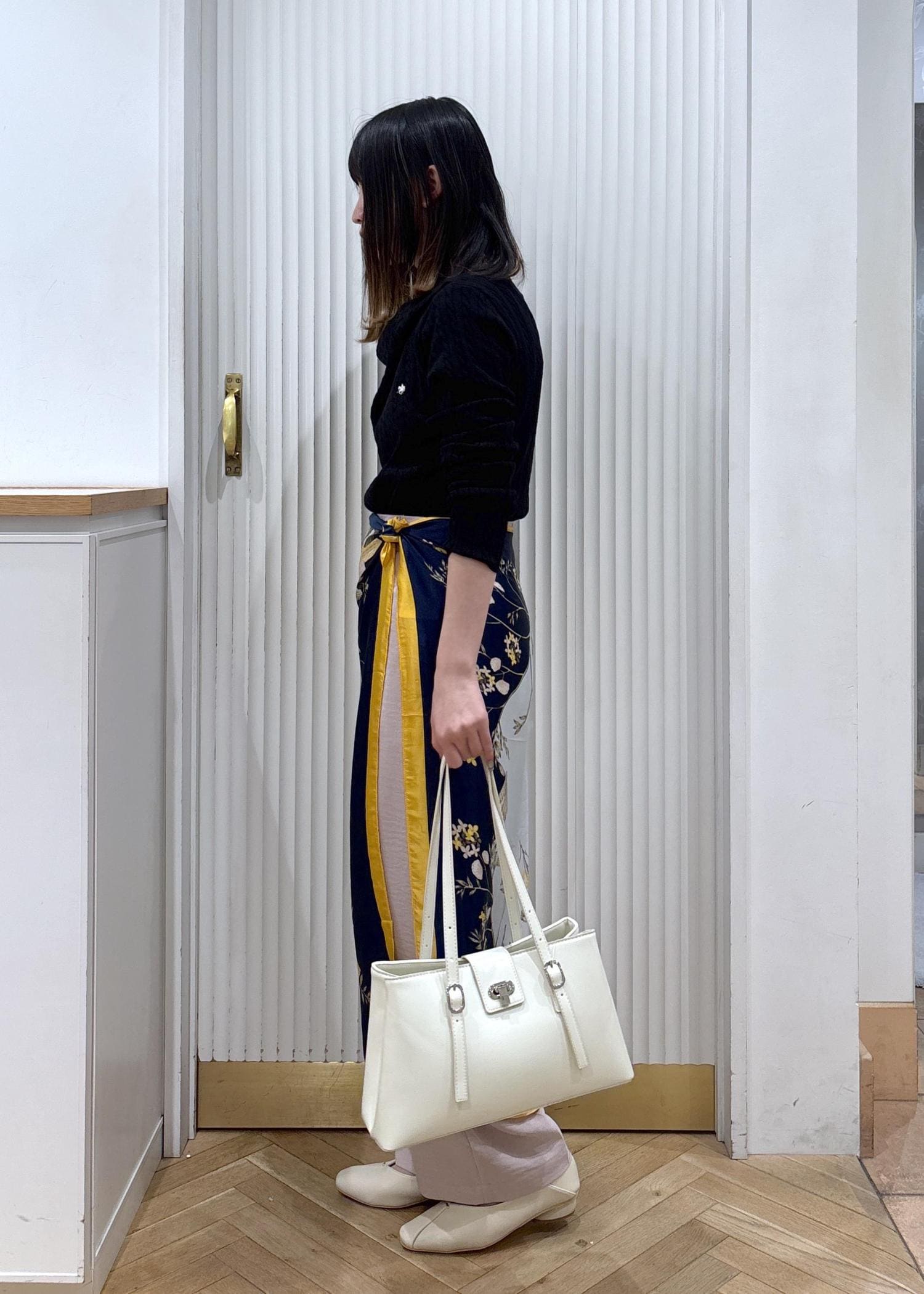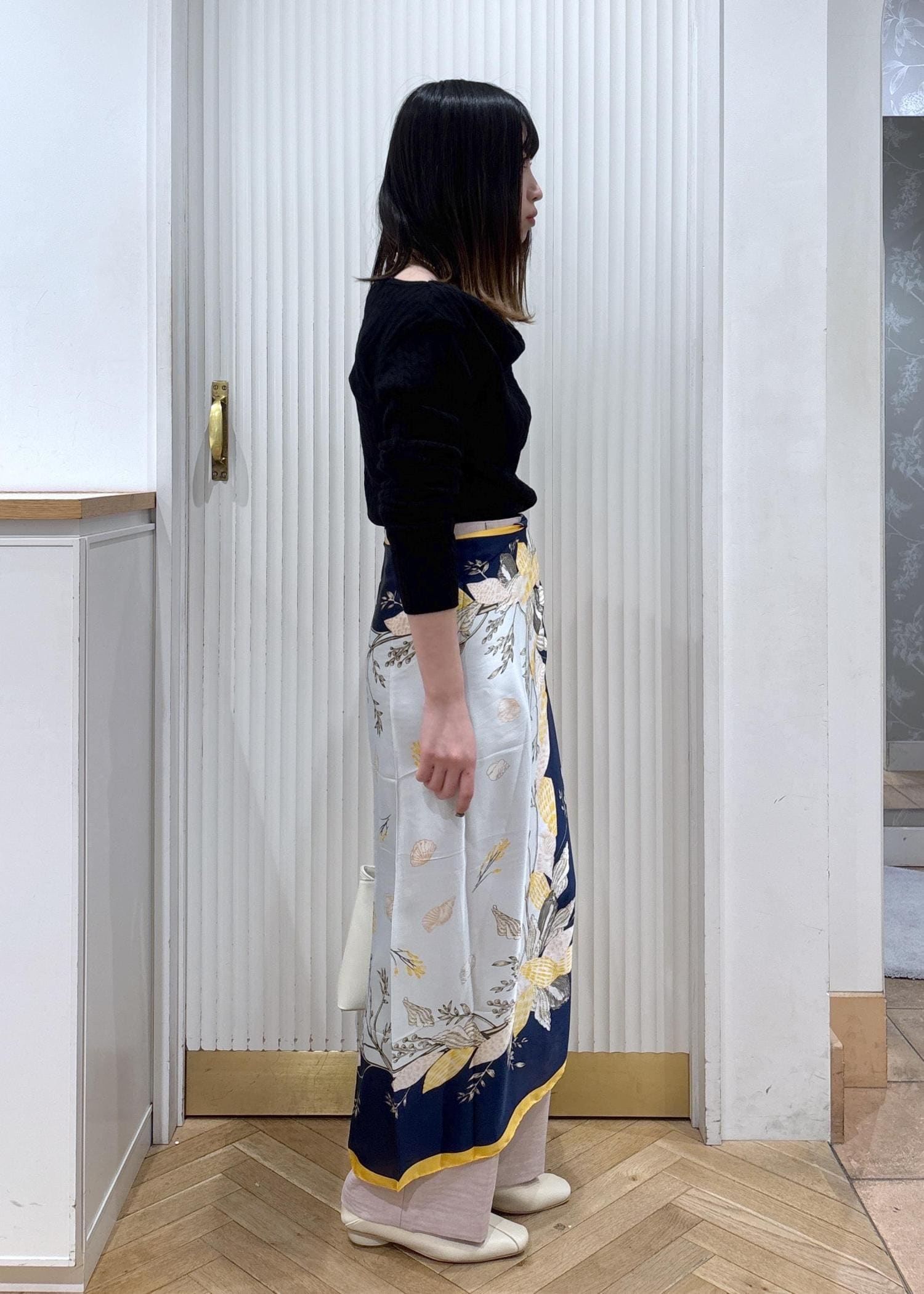 ドレープニットを使った春コーデです!パンツとニットだけではシンプルすぎますがスカーフを巻くことで華やかさもアップします!レイヤードが苦手な方や一枚でドレープニットを着たい方おすすめです!靴やバッグを白にすることで華やかさもアップします☺︎