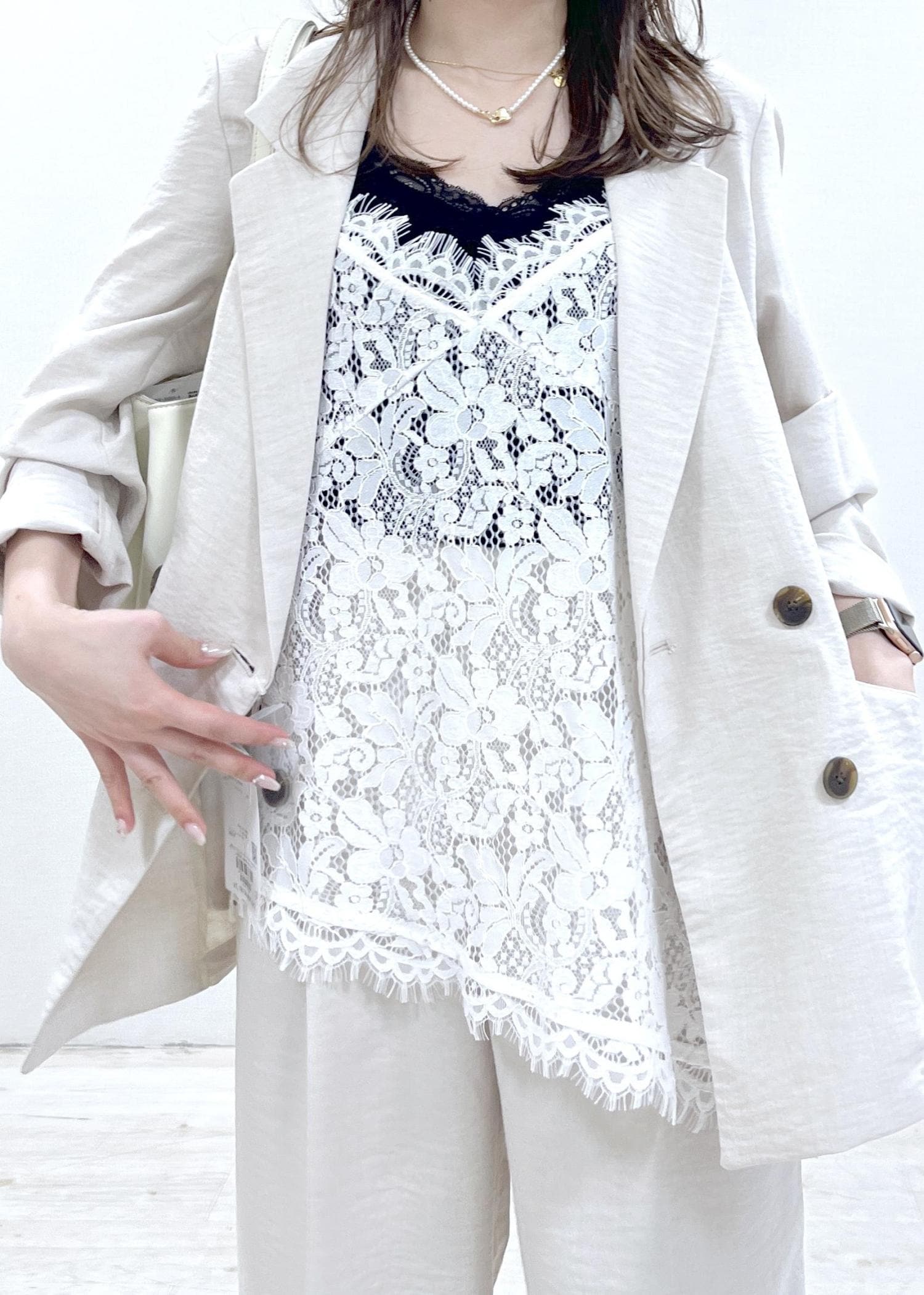 VISレースアシンメトリーキャミソールオフホワイト / F¥6,589レビュー肩紐で着丈が調整できるので、短くてもヒップにかかるくらいになります。