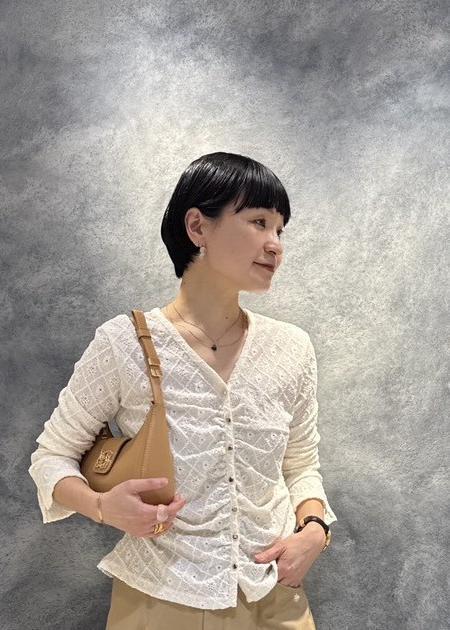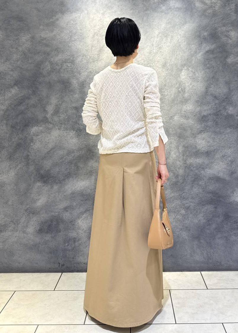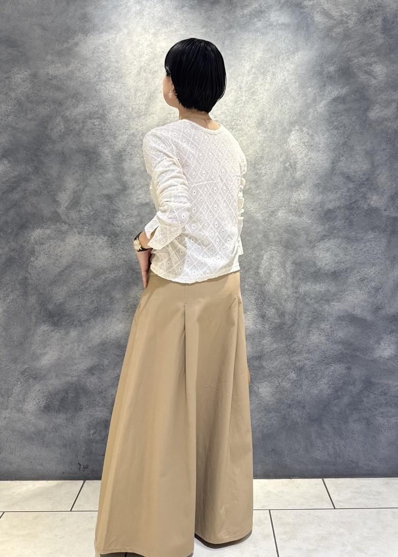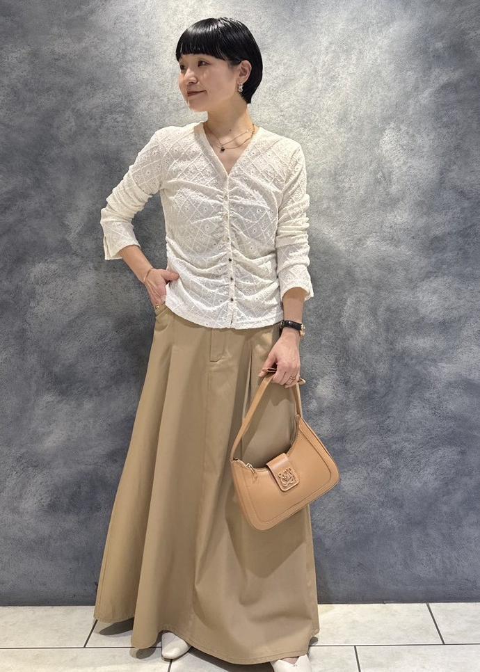 レースのトップスを合わせた春の柔らかなスタイリングです。