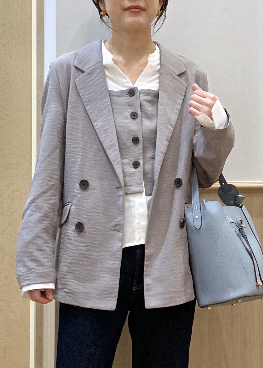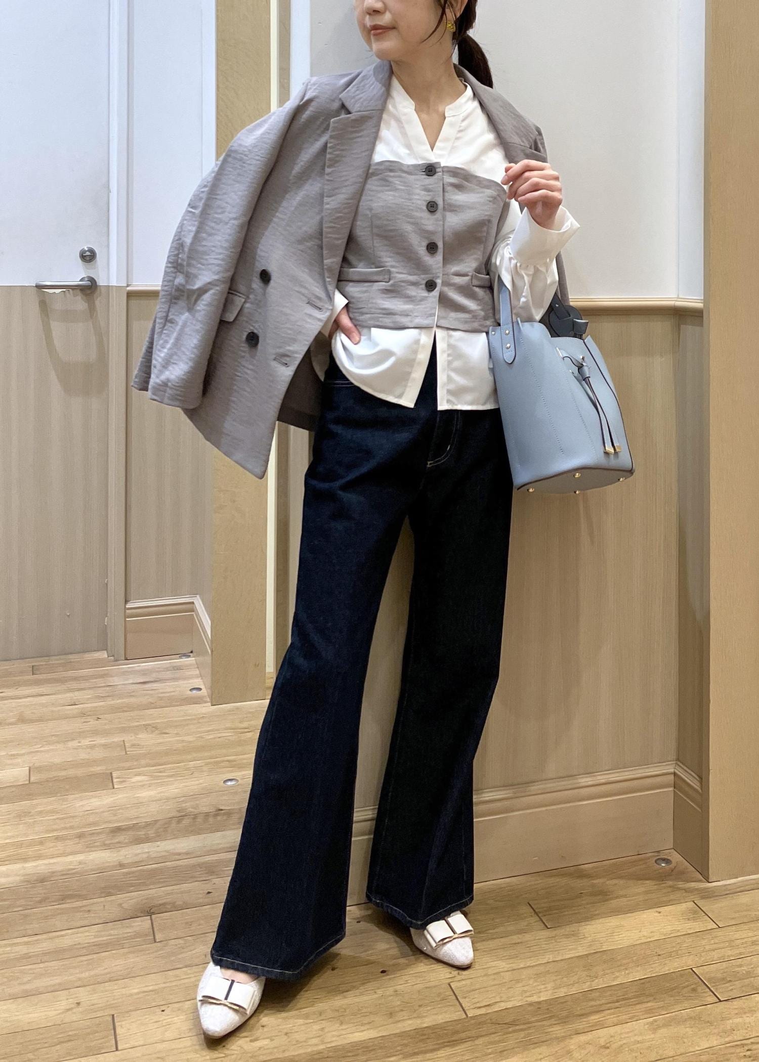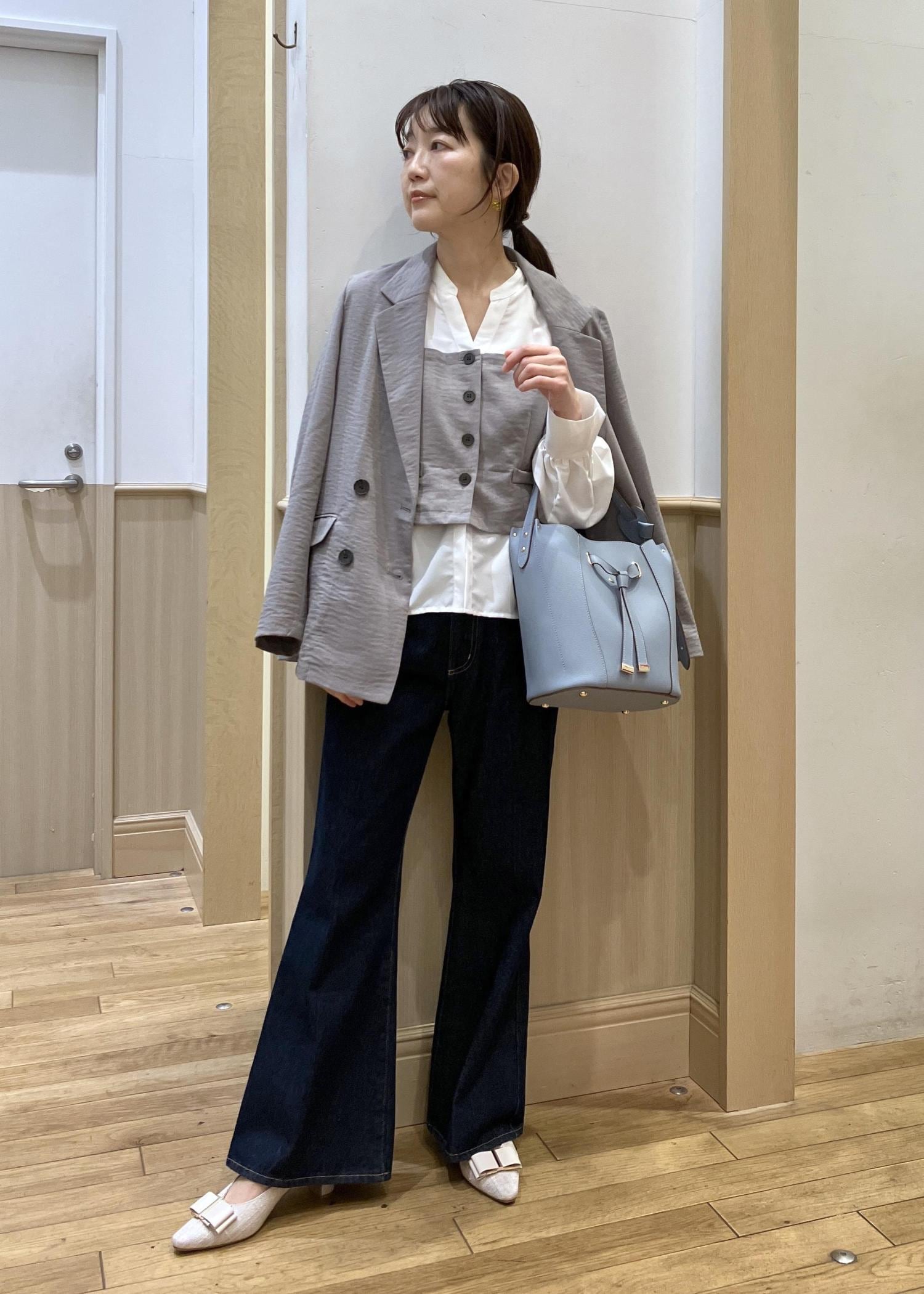 人気の美easyのジャケットとトップスをセットで合わせてみました。やはり計算され尽くしたセットアイテムなので細かいディティールまでキレイに着れるのでオススメです。ボトムはデニム合わせですが色味の濃いタイプを選んでいるので、ややキレイ目をキープ。オフィスカジュアルにも◎