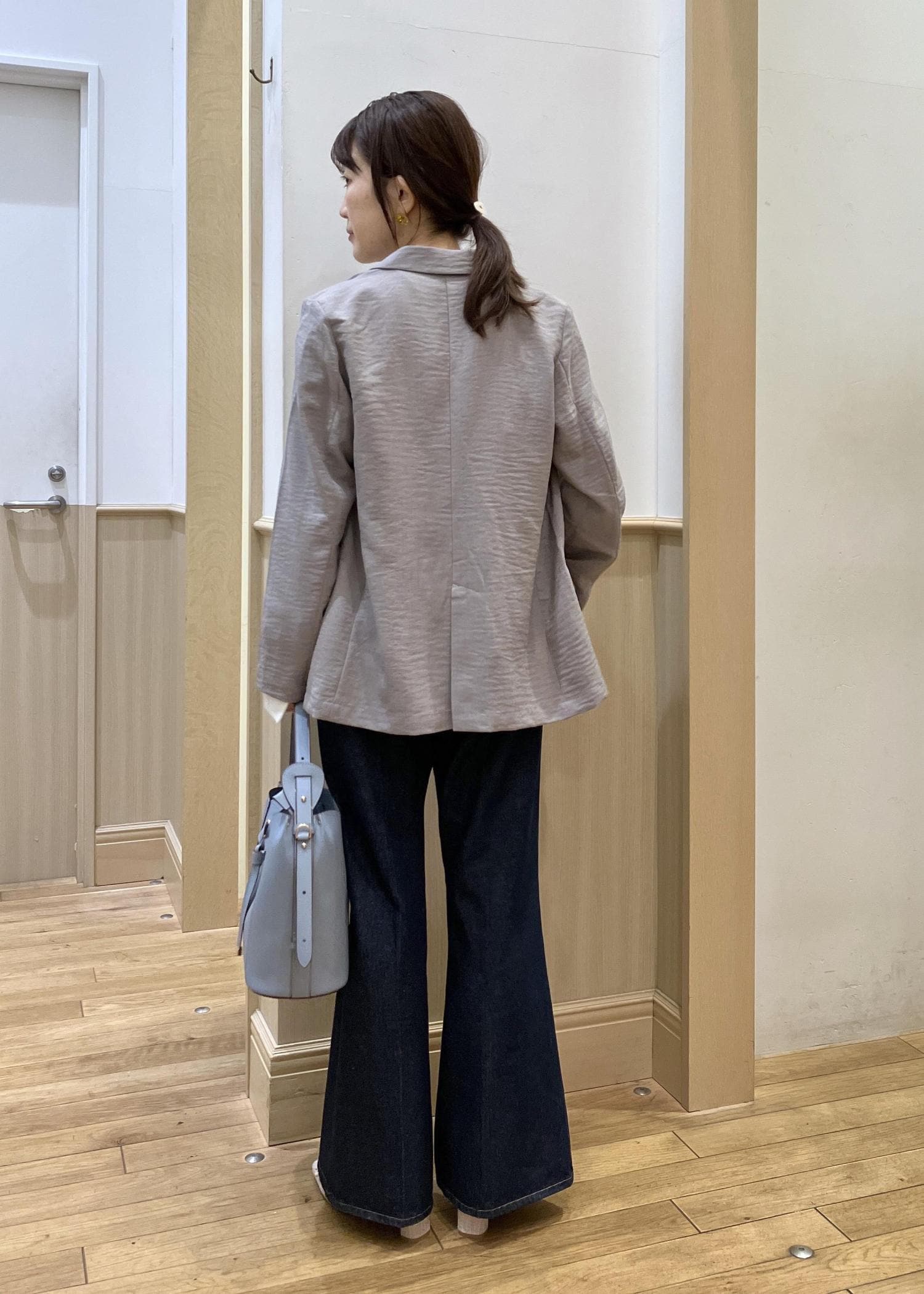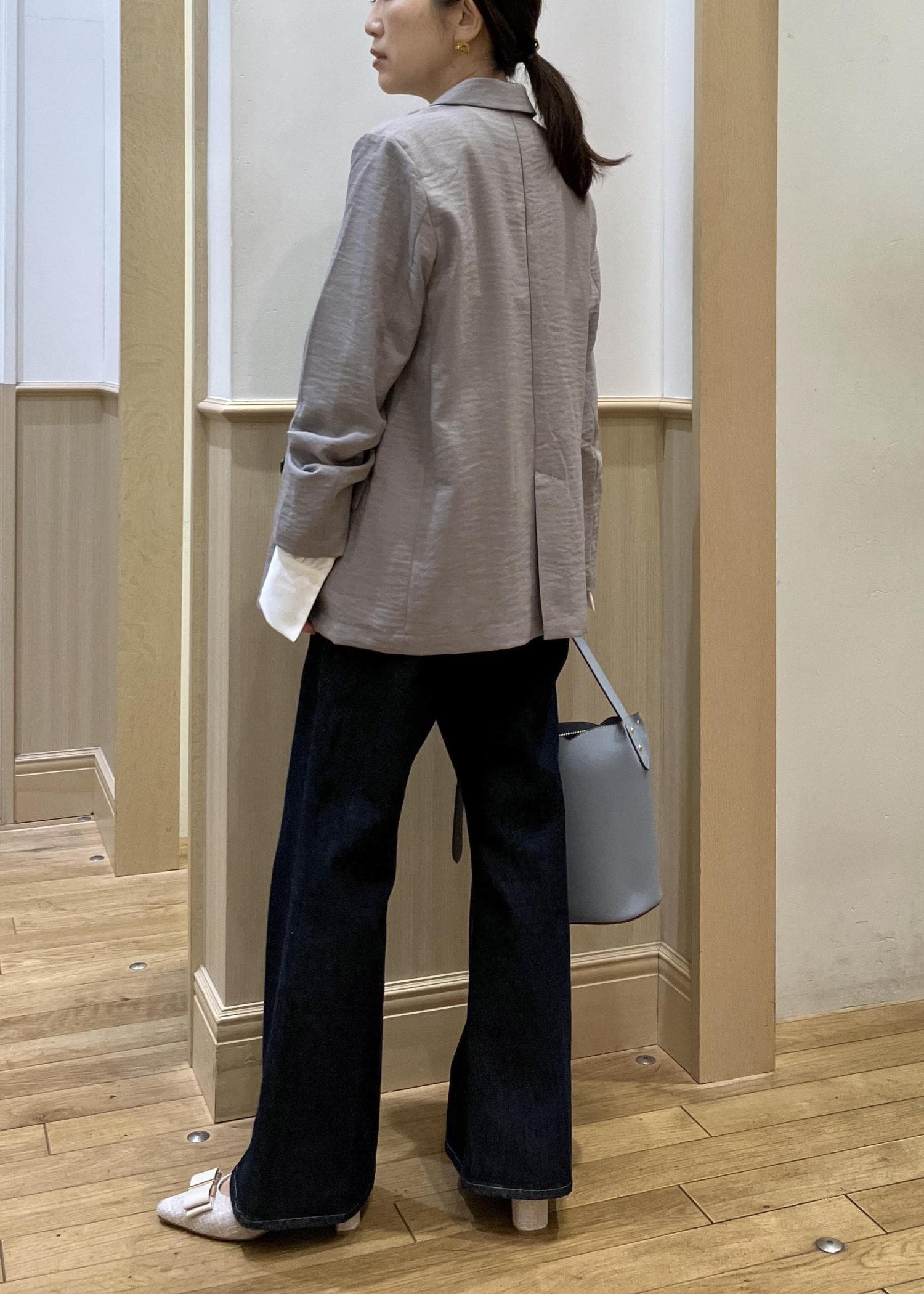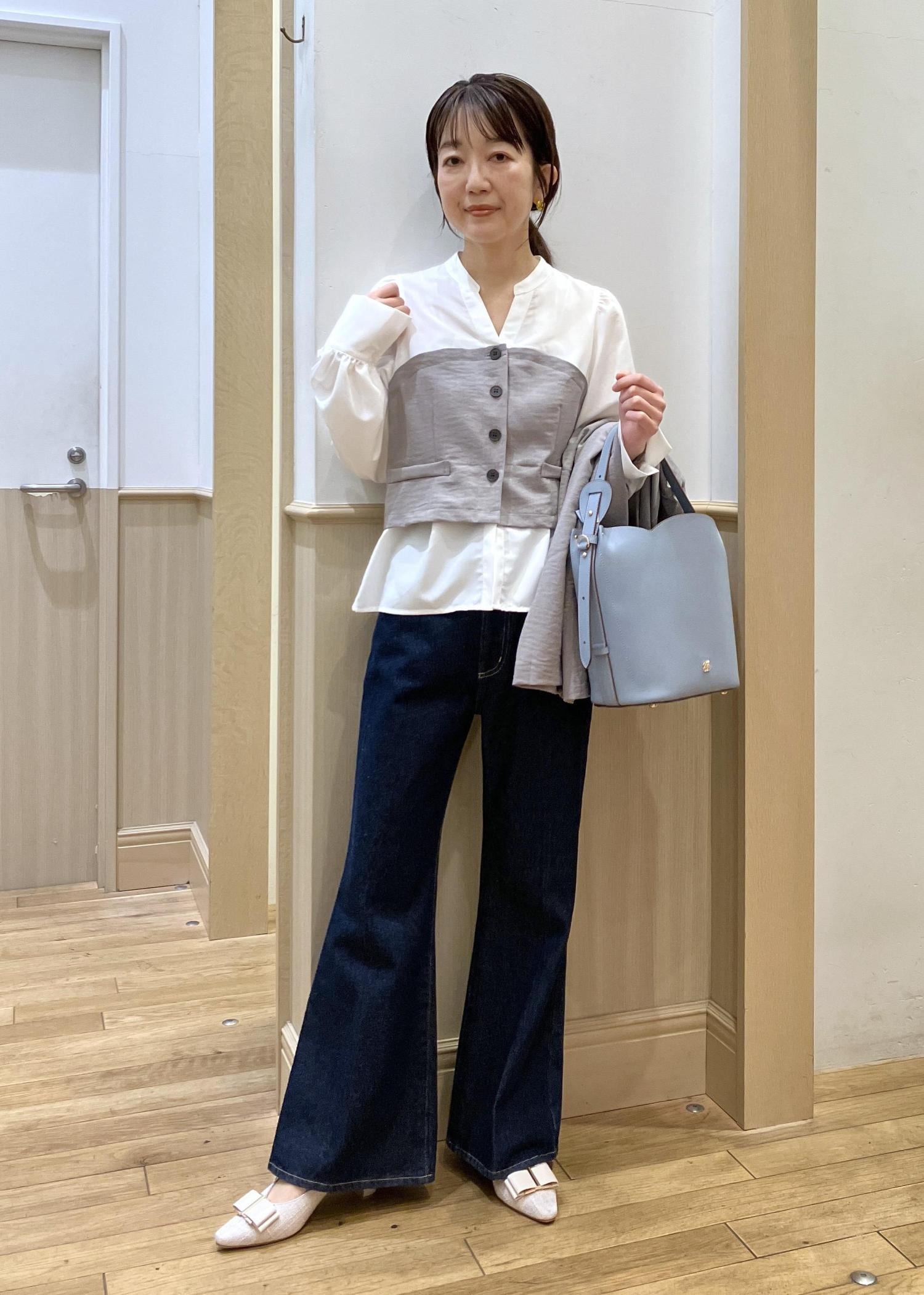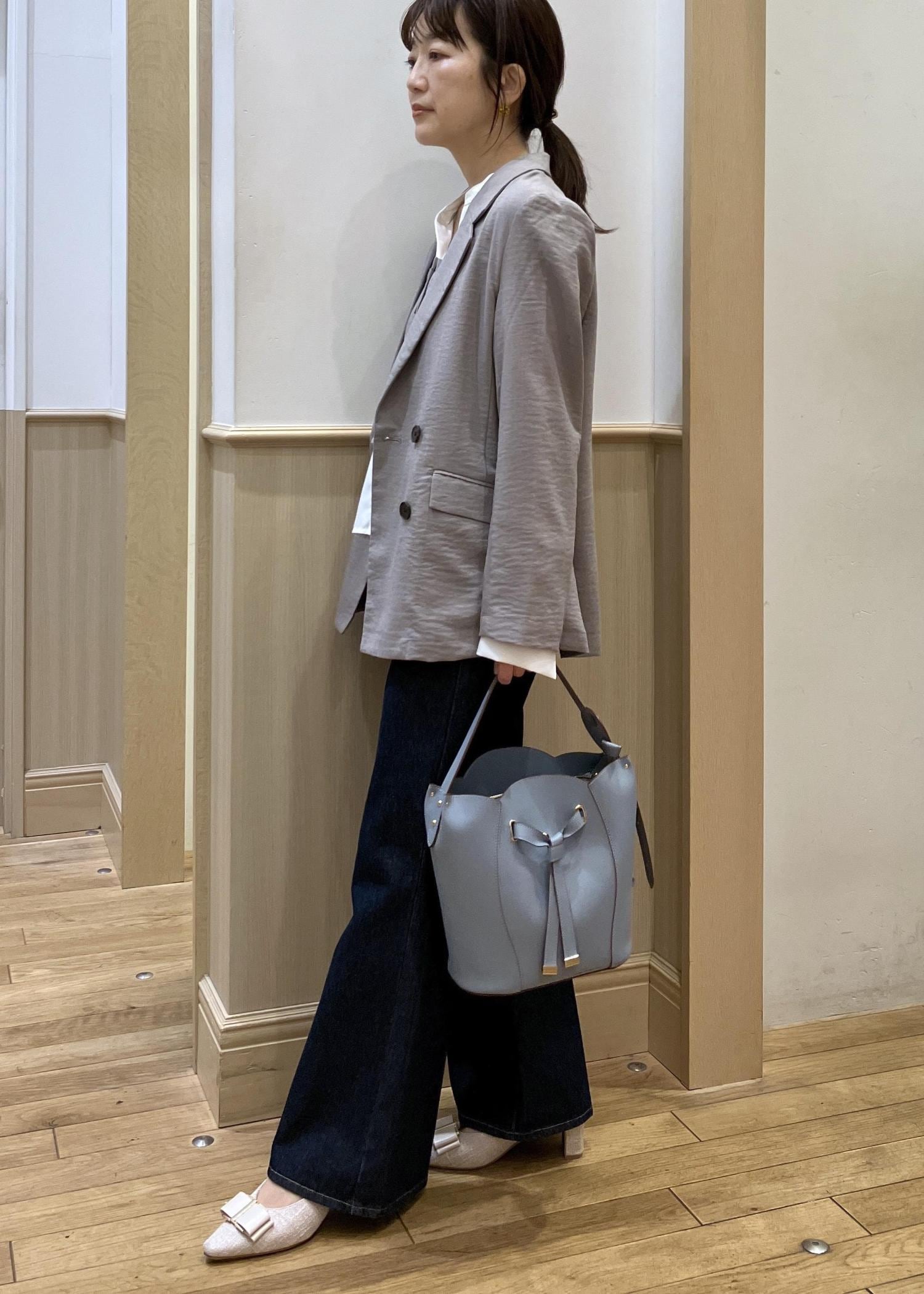 人気の美easyのジャケットとトップスをセットで合わせてみました。やはり計算され尽くしたセットアイテムなので細かいディティールまでキレイに着れるのでオススメです。ボトムはデニム合わせですが色味の濃いタイプを選んでいるので、ややキレイ目をキープ。オフィスカジュアルにも◎