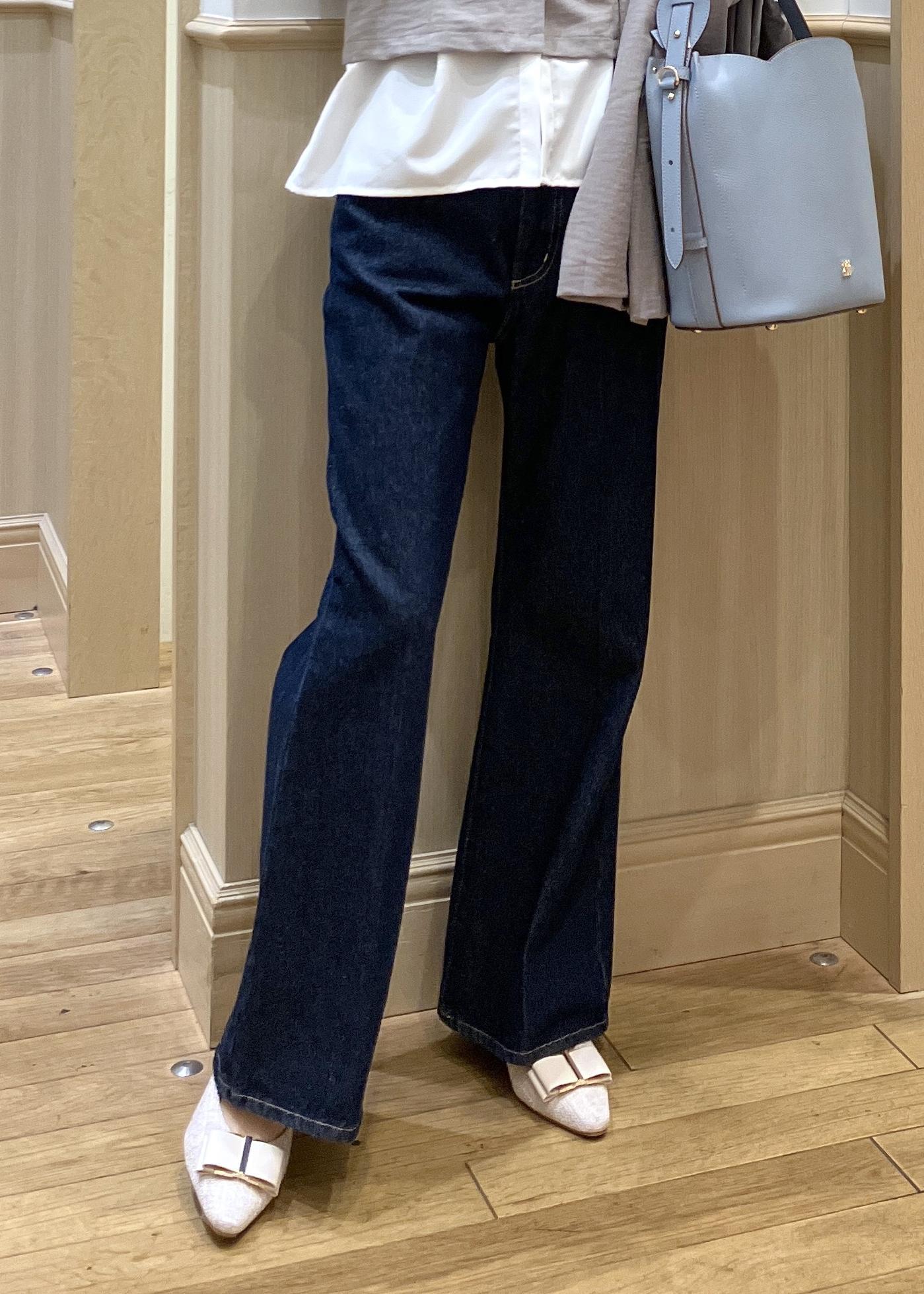 着丈の長さは、フラットシューズでも◎裾にかけてフレアに広がるシルエットが綺麗なデニムです。
