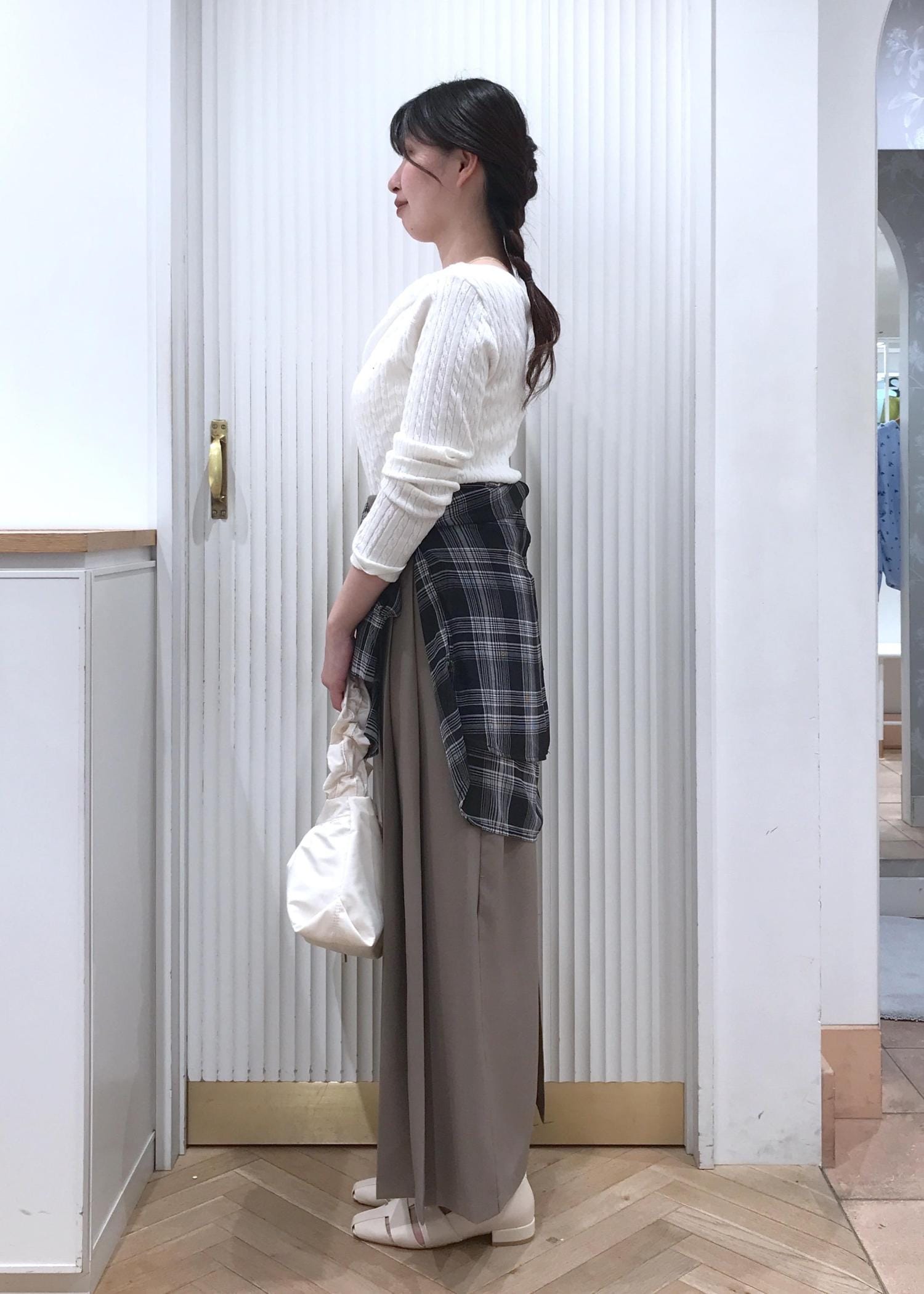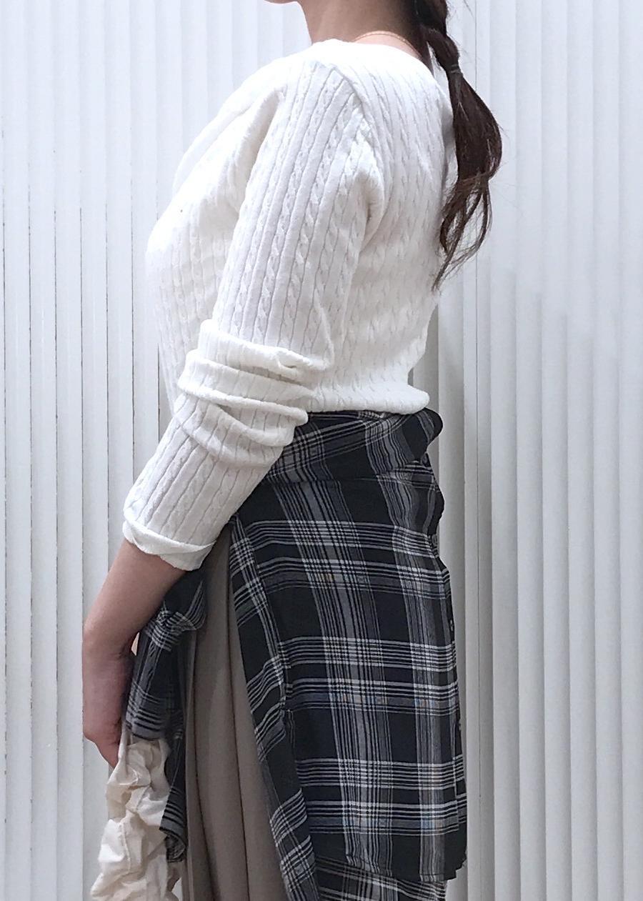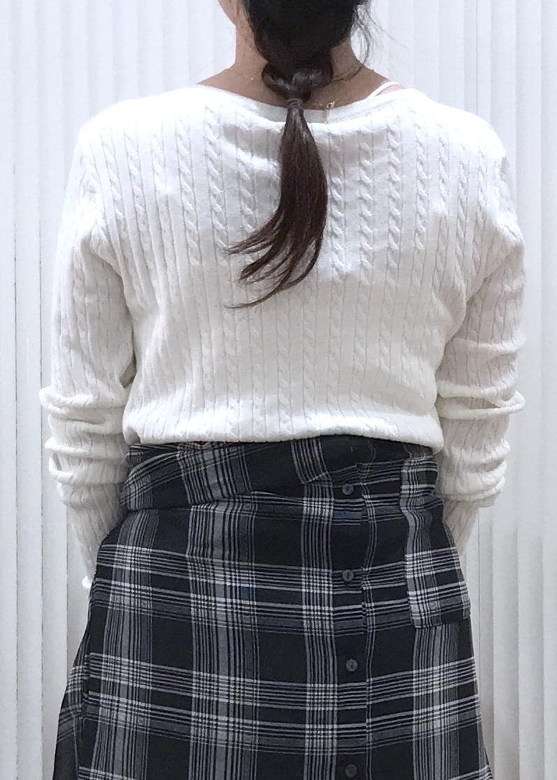 ケーブル編み×ドレープのデザイン性があるトップスなので、シンプルなデニムとかと合わせても可愛く着用出来るアイテムです。 -