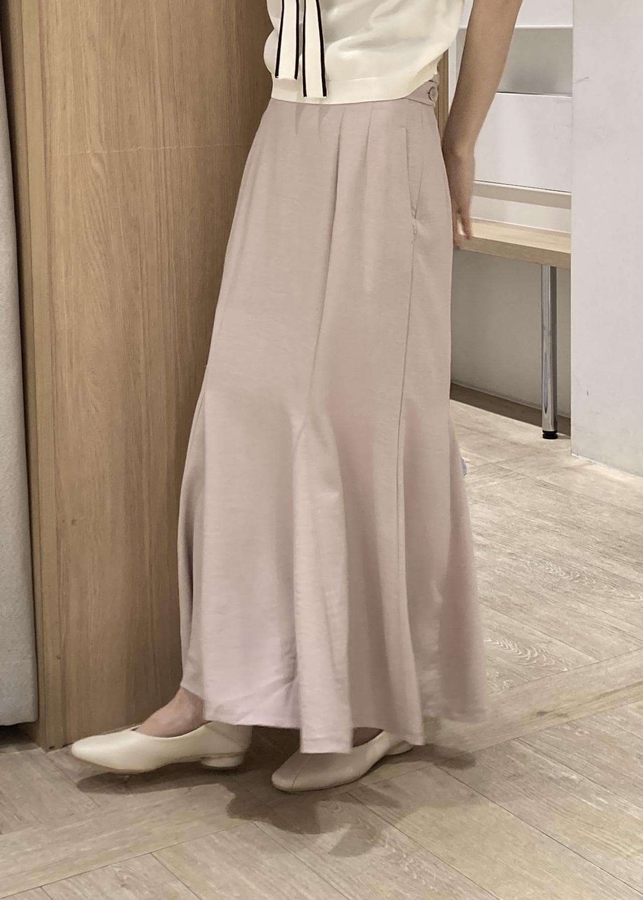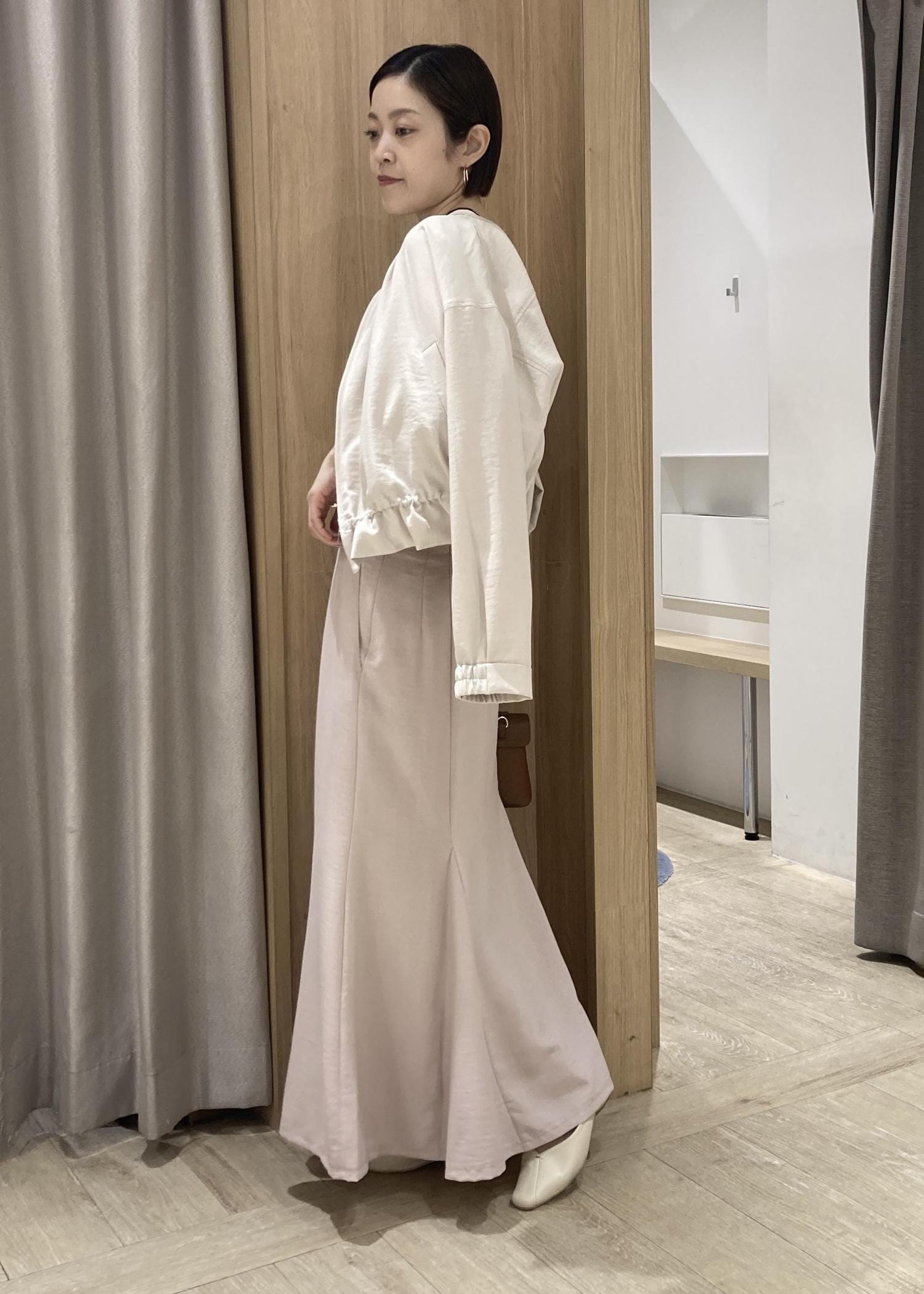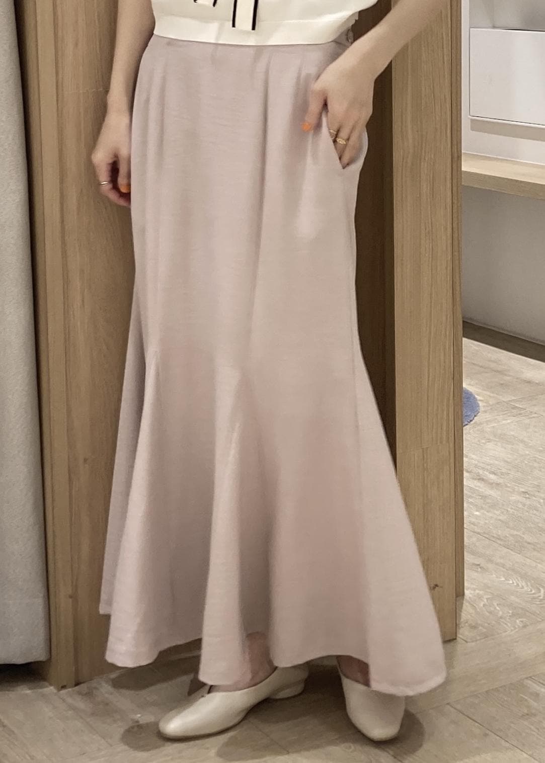 さらっとリネンのような軽やかさで夏にかけて活躍します。マーメイドシルエットも広がりすぎず、トップスが合わせやすいです。 -