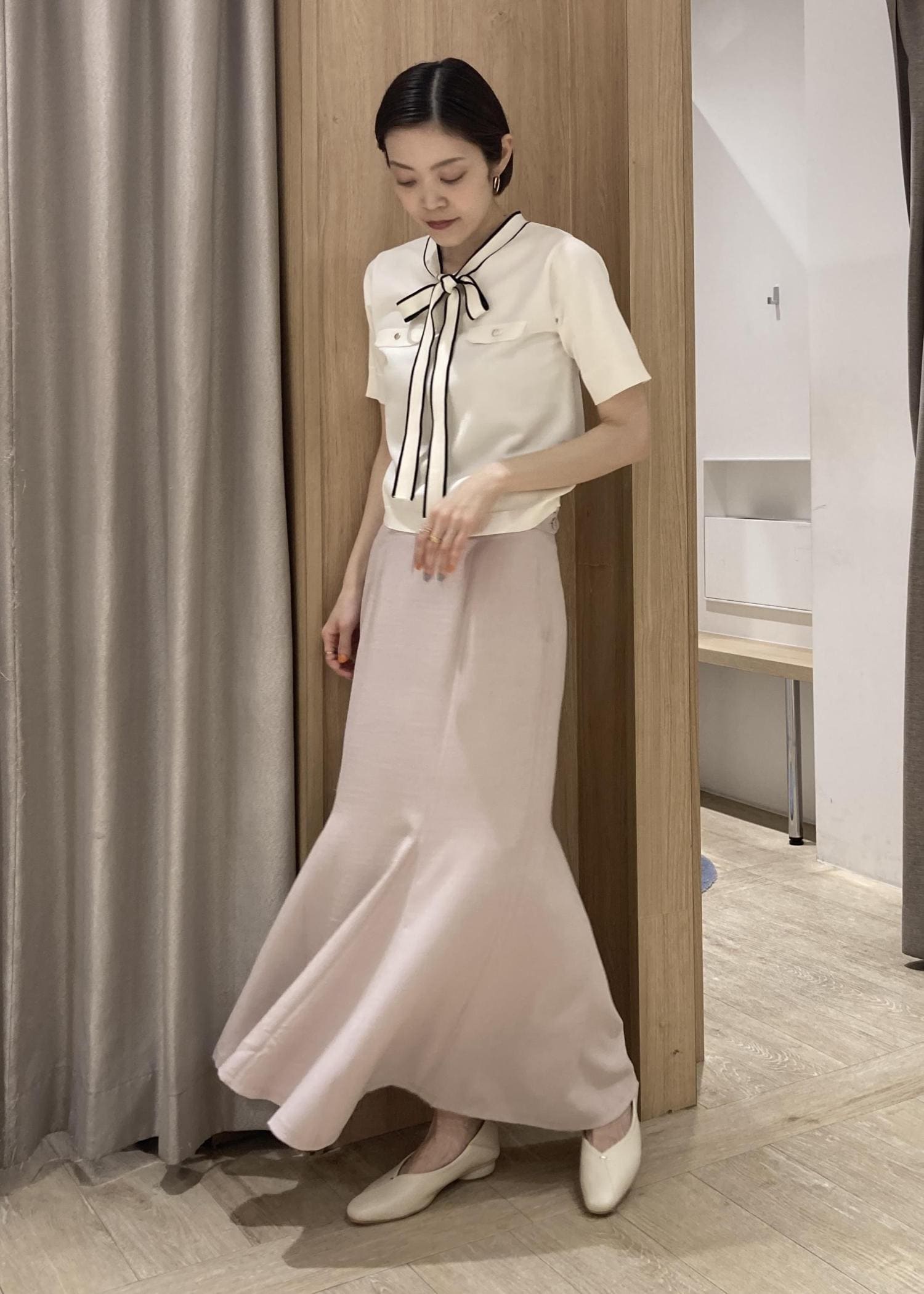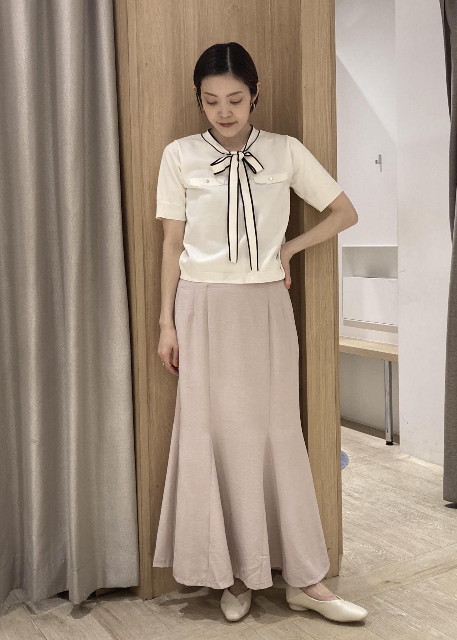 春らしいピンクのマーメイドスカートを主役にしたコーディネートです。少しくすんだピンクが派手に見えず、コンパクトなトップスと相性ばっちりなシルエット。