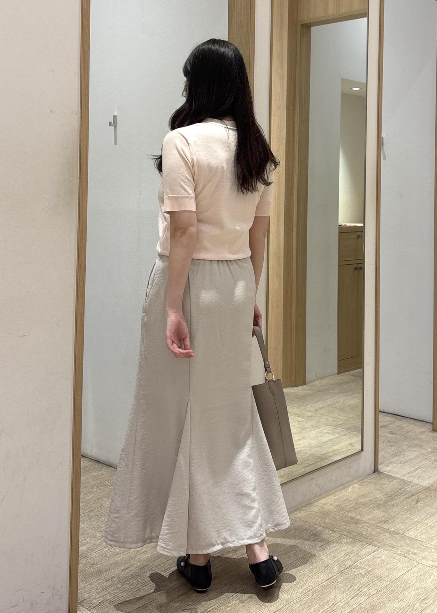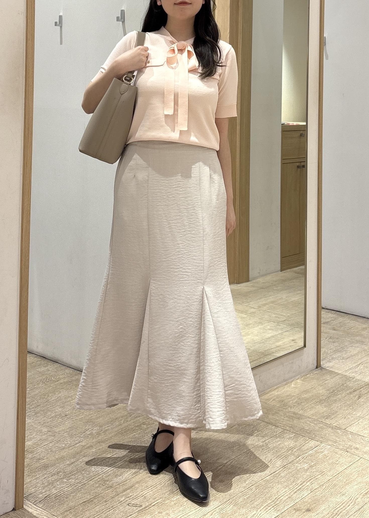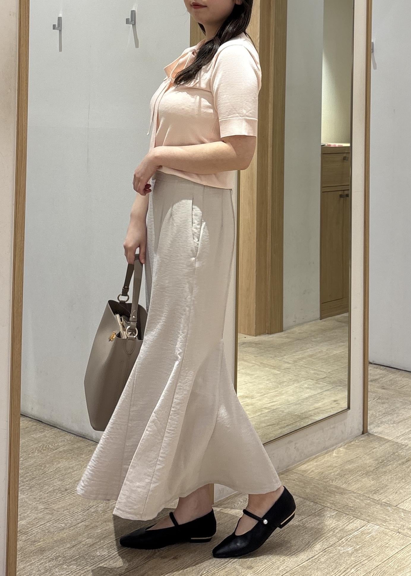 腰まわりはすっきりとしたシルエットで、裾に向かって自然に広がるマーメイドラインが女性らしい印象。骨格ストレートでも腰まわりが大きく見えにくく、縦ラインがきれいに出るデザインです。