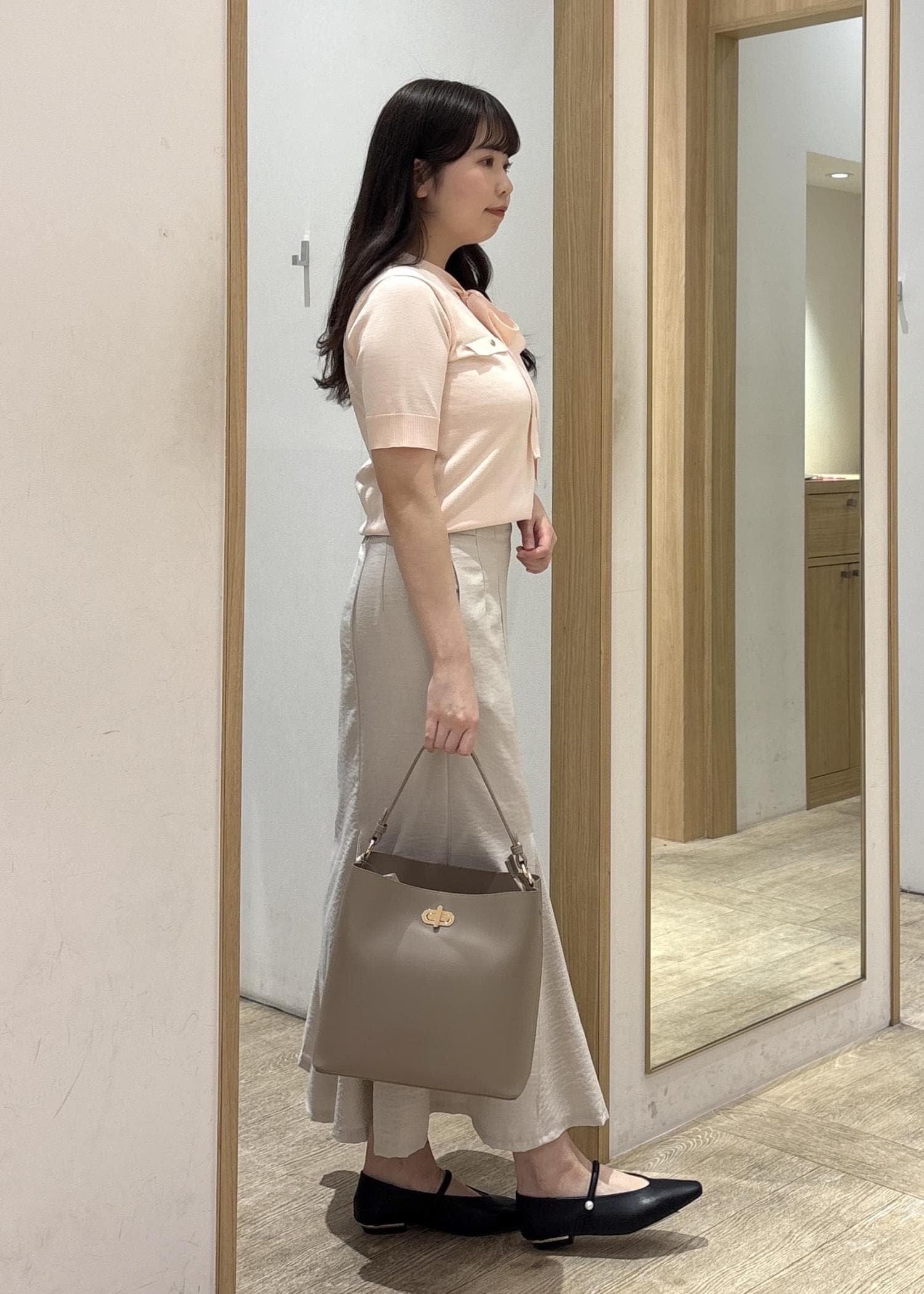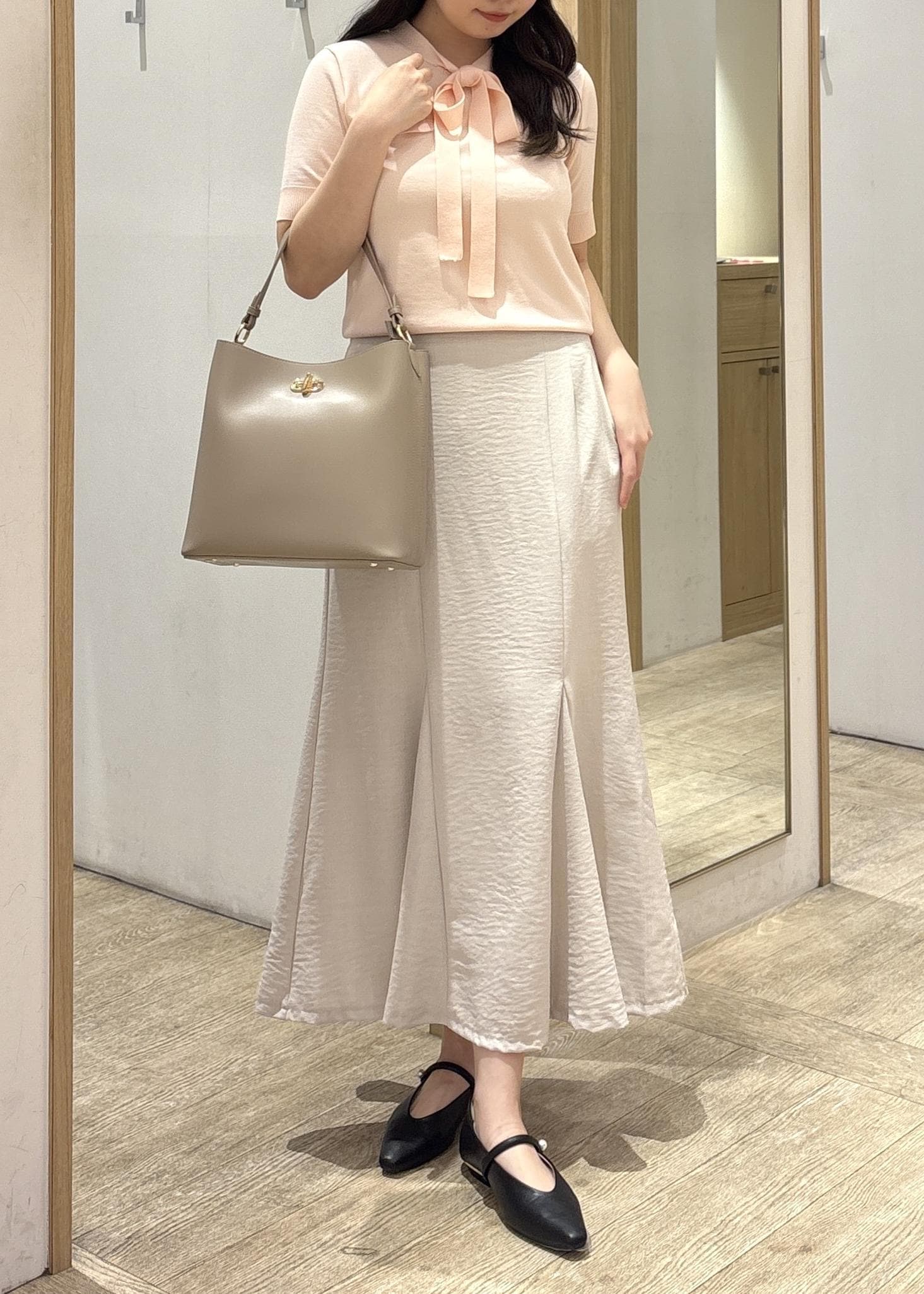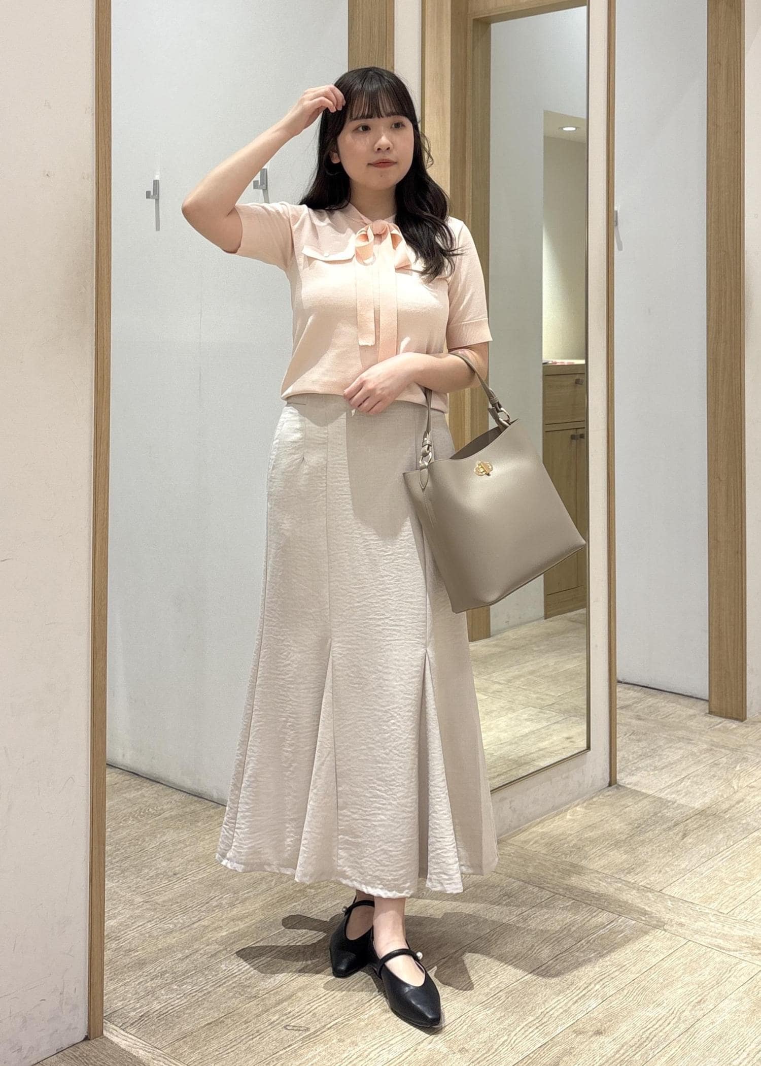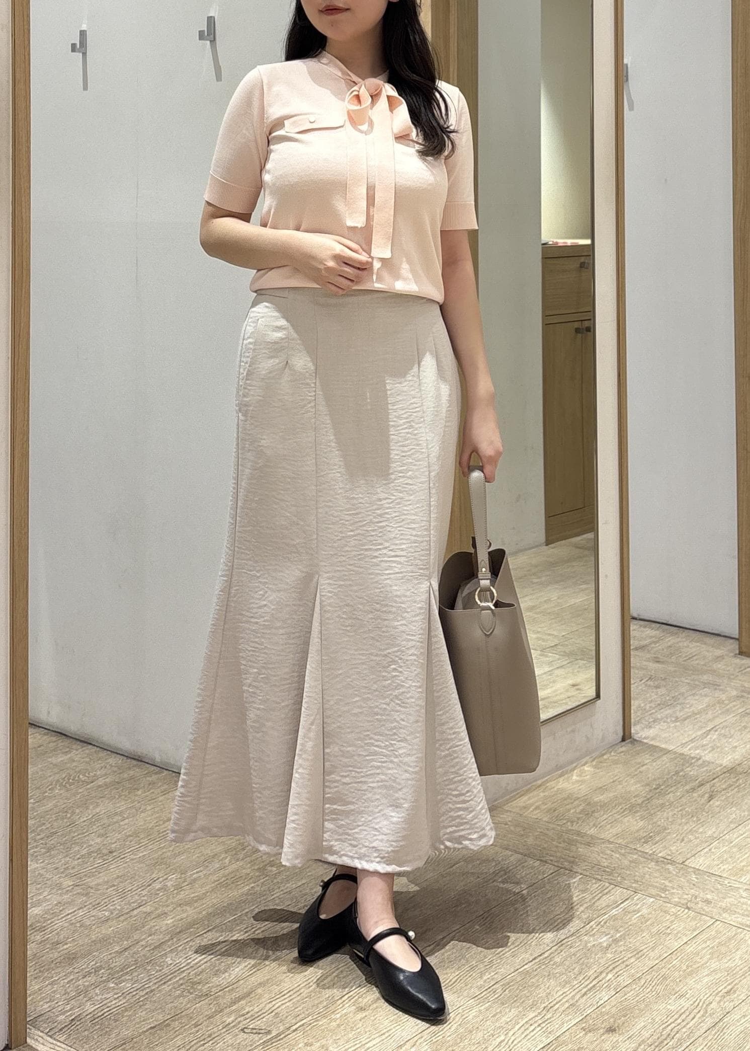 腰まわりはすっきりとしたシルエットで、裾に向かって自然に広がるマーメイドラインが女性らしい印象。骨格ストレートでも腰まわりが大きく見えにくく、縦ラインがきれいに出るデザインです。