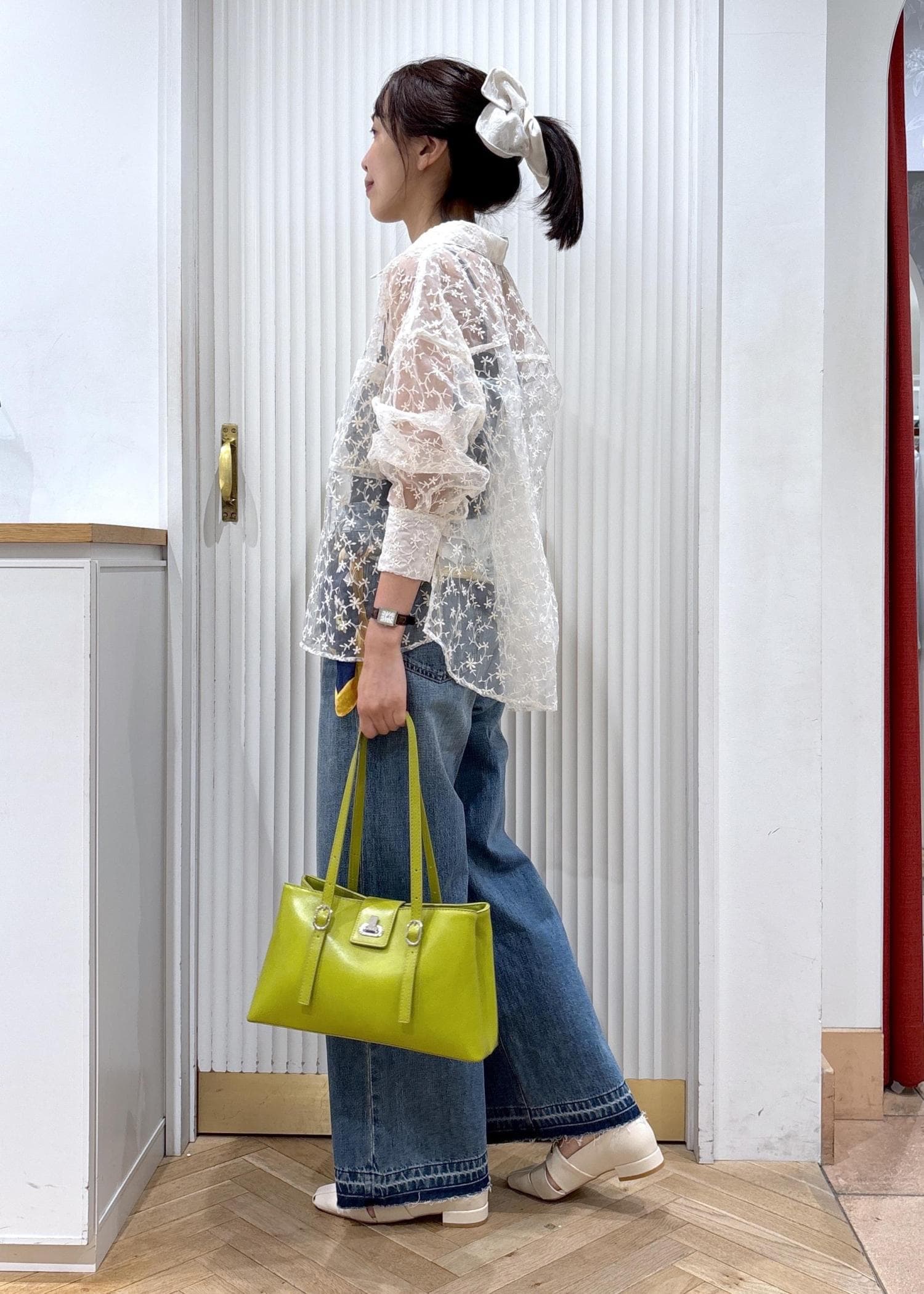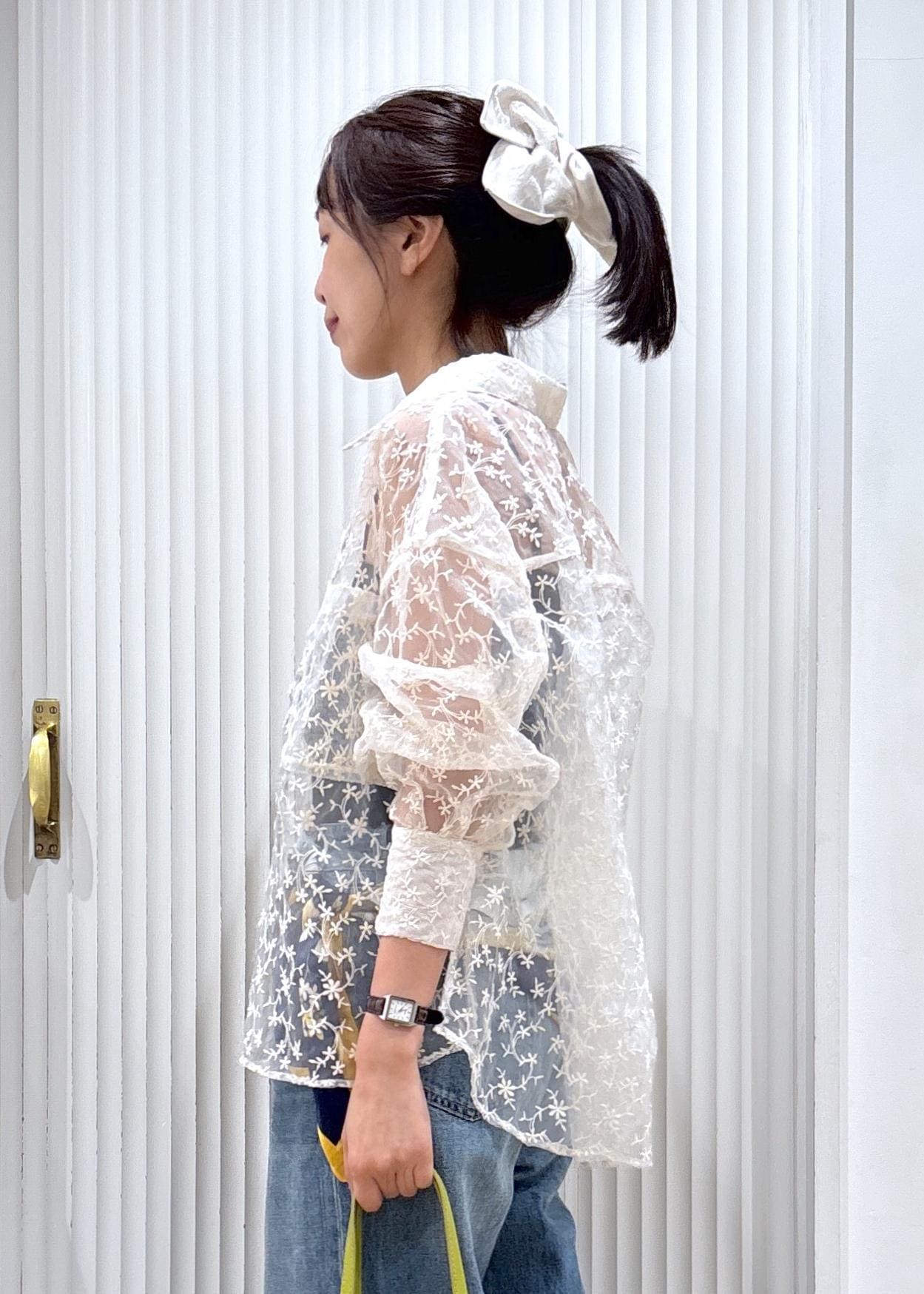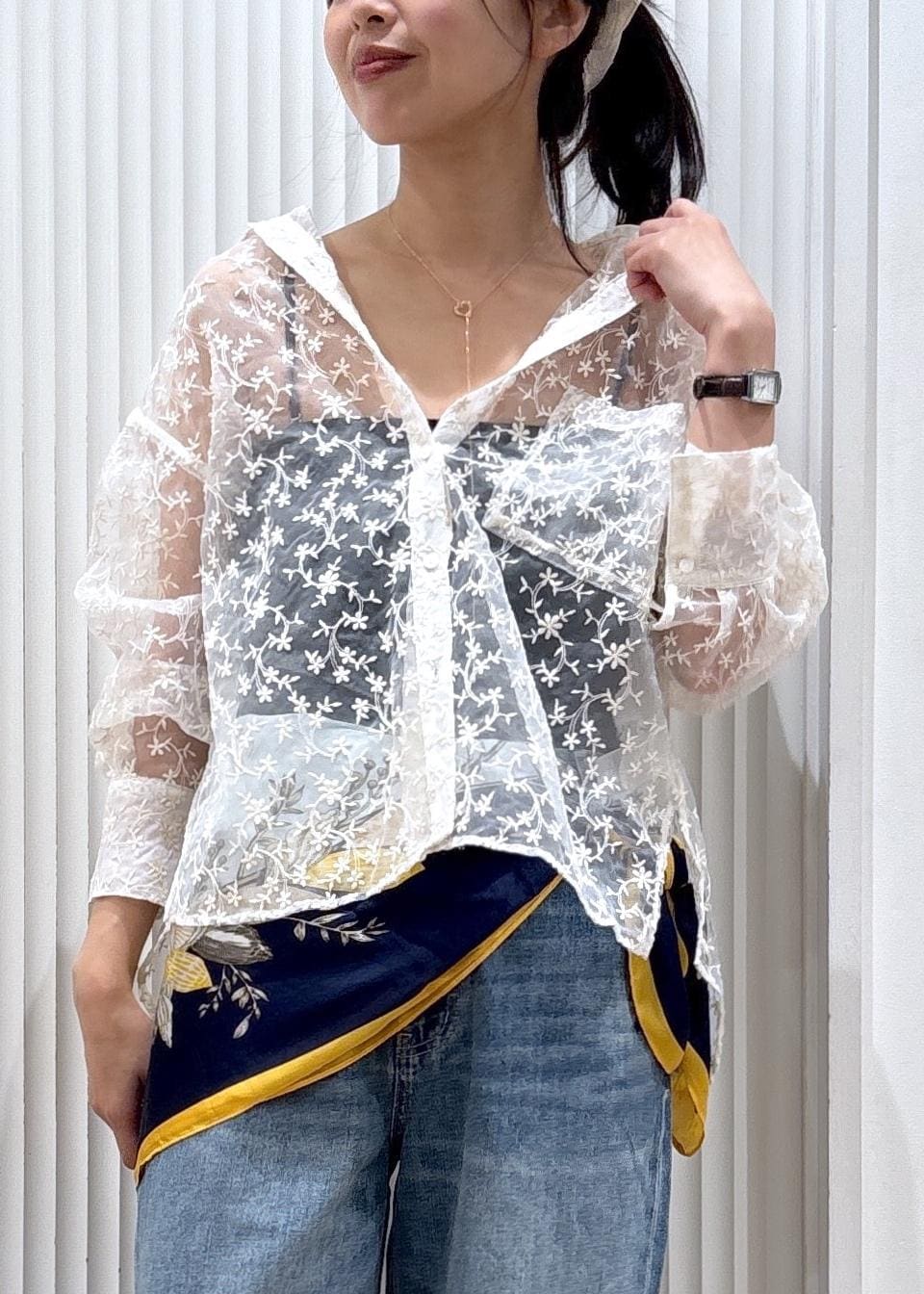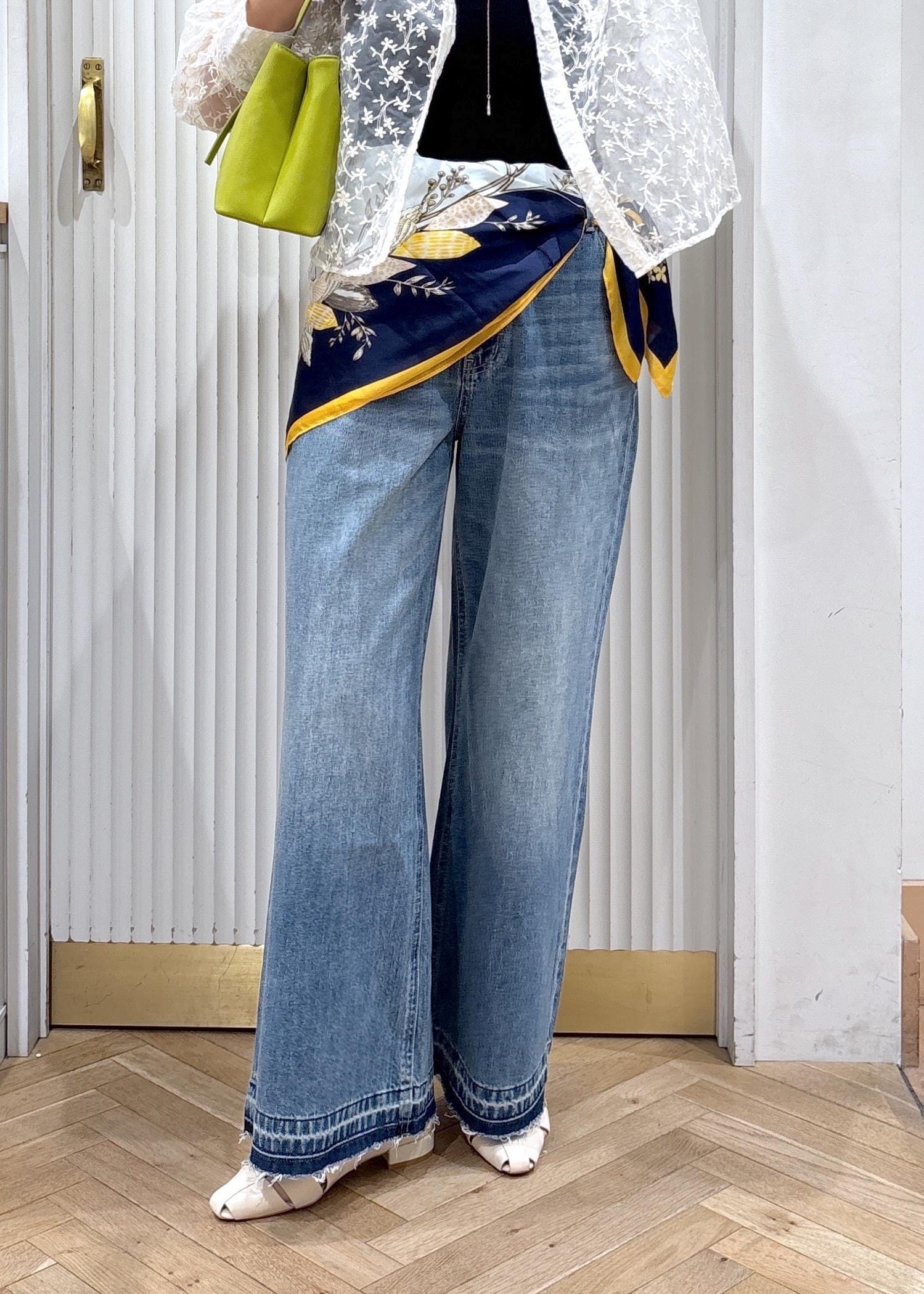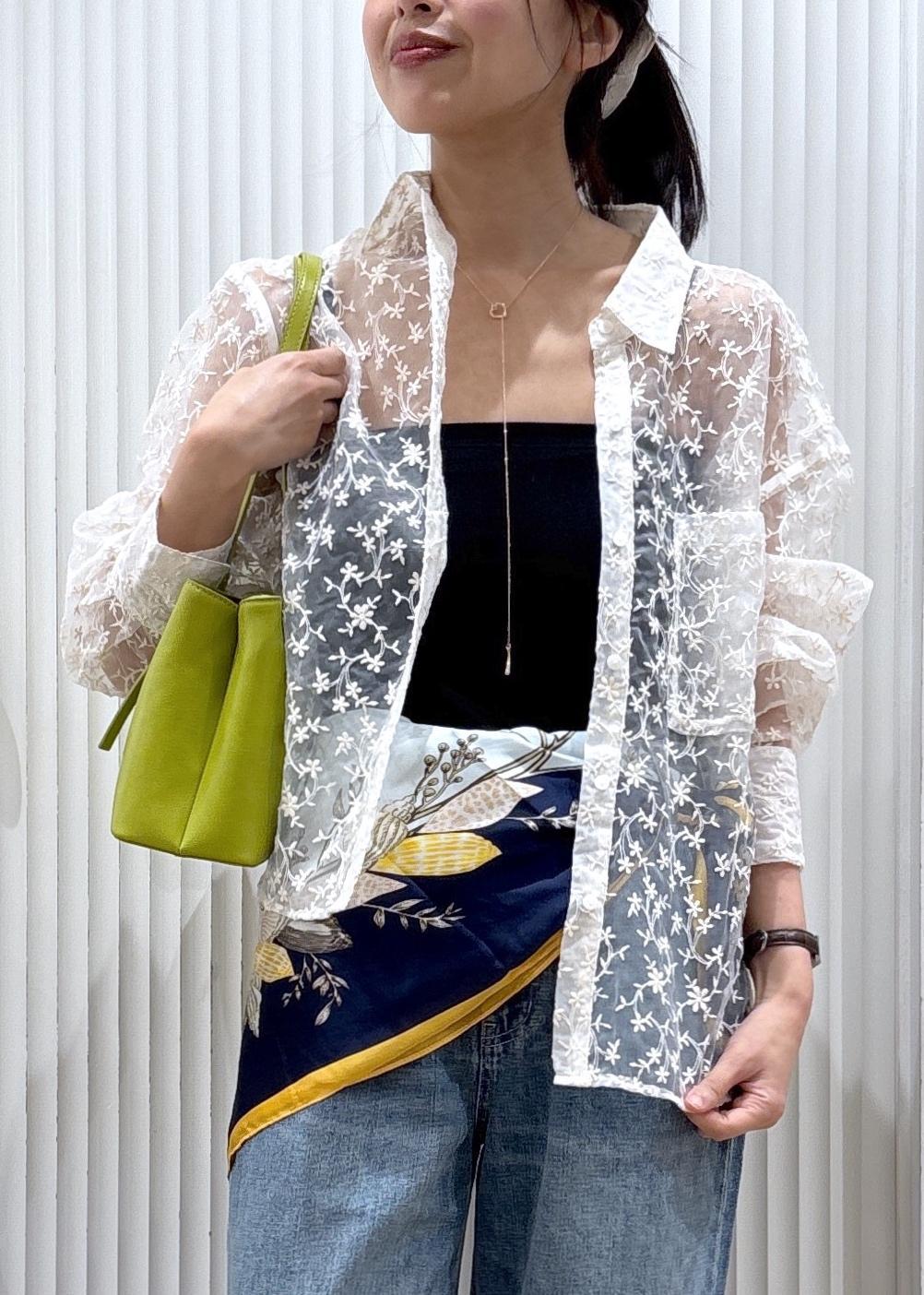 繊細なレースシャツでやわらかさを出しつつ、ワイドデニムでカジュアルにバランスを調整。スカーフのアクセントと鮮やかなバッグで、シンプルながらもこなれ感のある大人カジュアルに仕上げました。