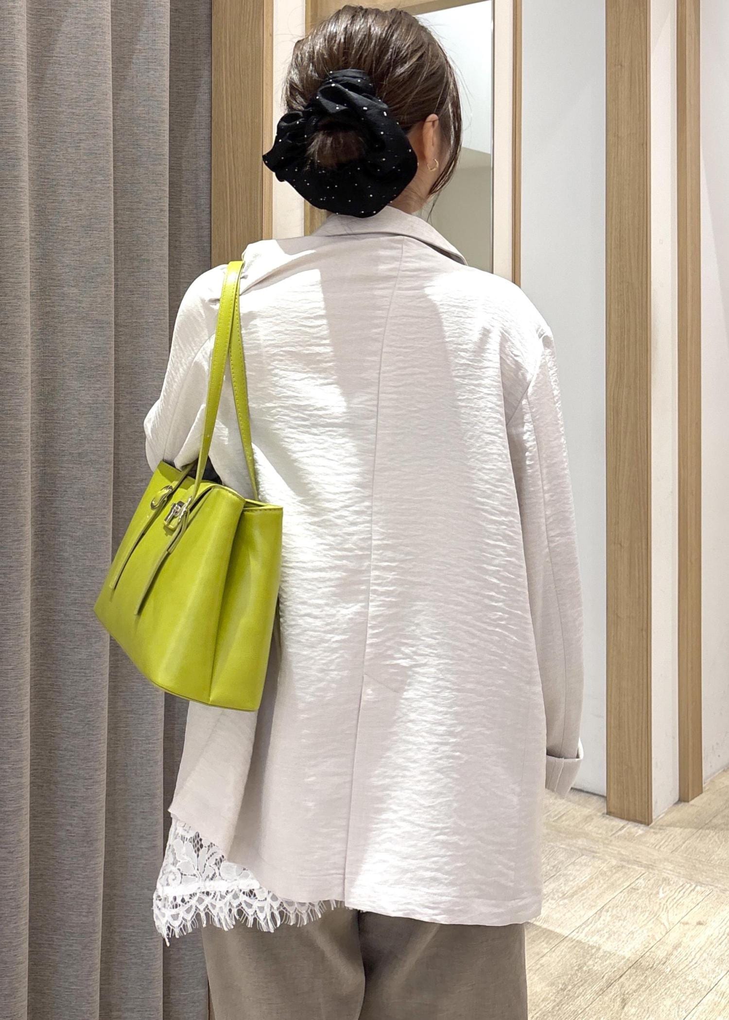 トレンドのレースキャミをジャケットでハンサムに着こなすコーデです。