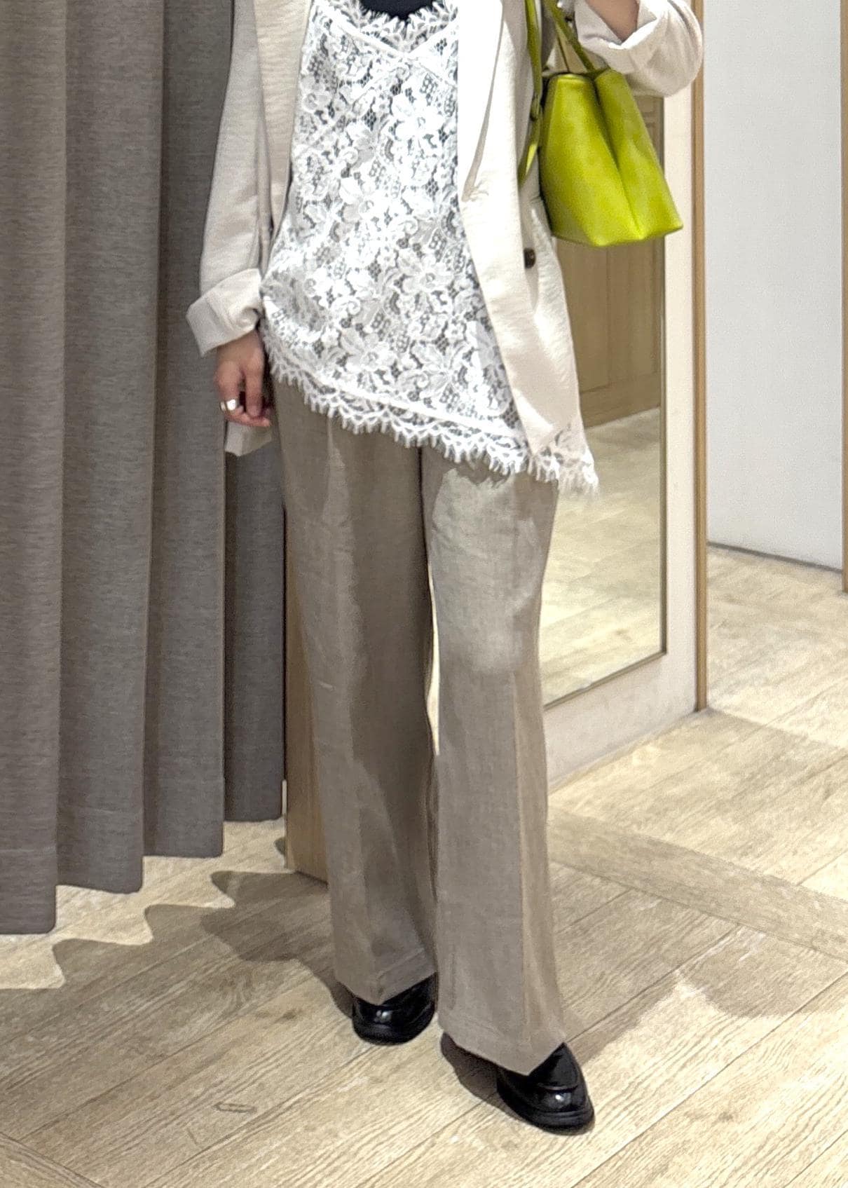 パンツはハイウエストデザインで脚長効果抜群!骨格ウェーブのスタイルアップにもおすすめです☺︎