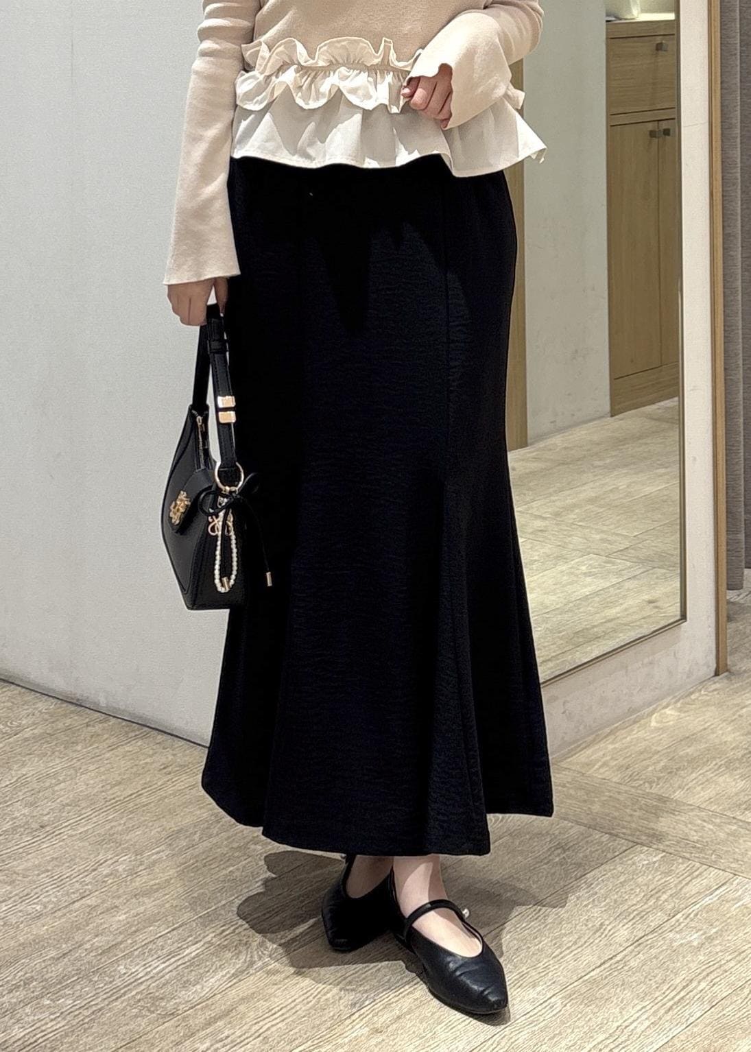 腰まわりはすっきりとしたシルエットで、裾に向かって自然に広がるマーメイドラインが女性らしい印象。骨格ストレートでも腰まわりが大きく見えにくく、縦ラインがきれいに出るデザインです。