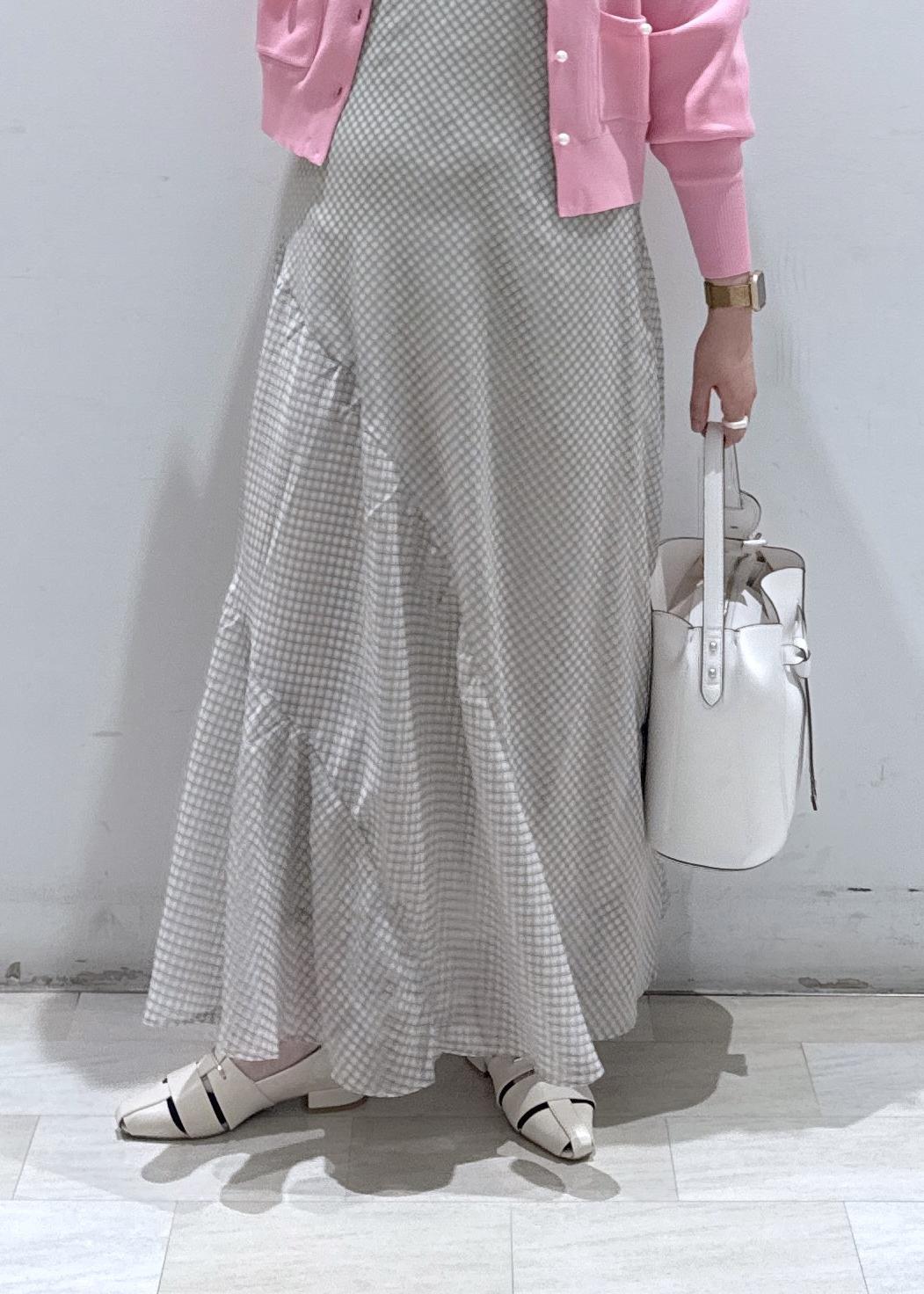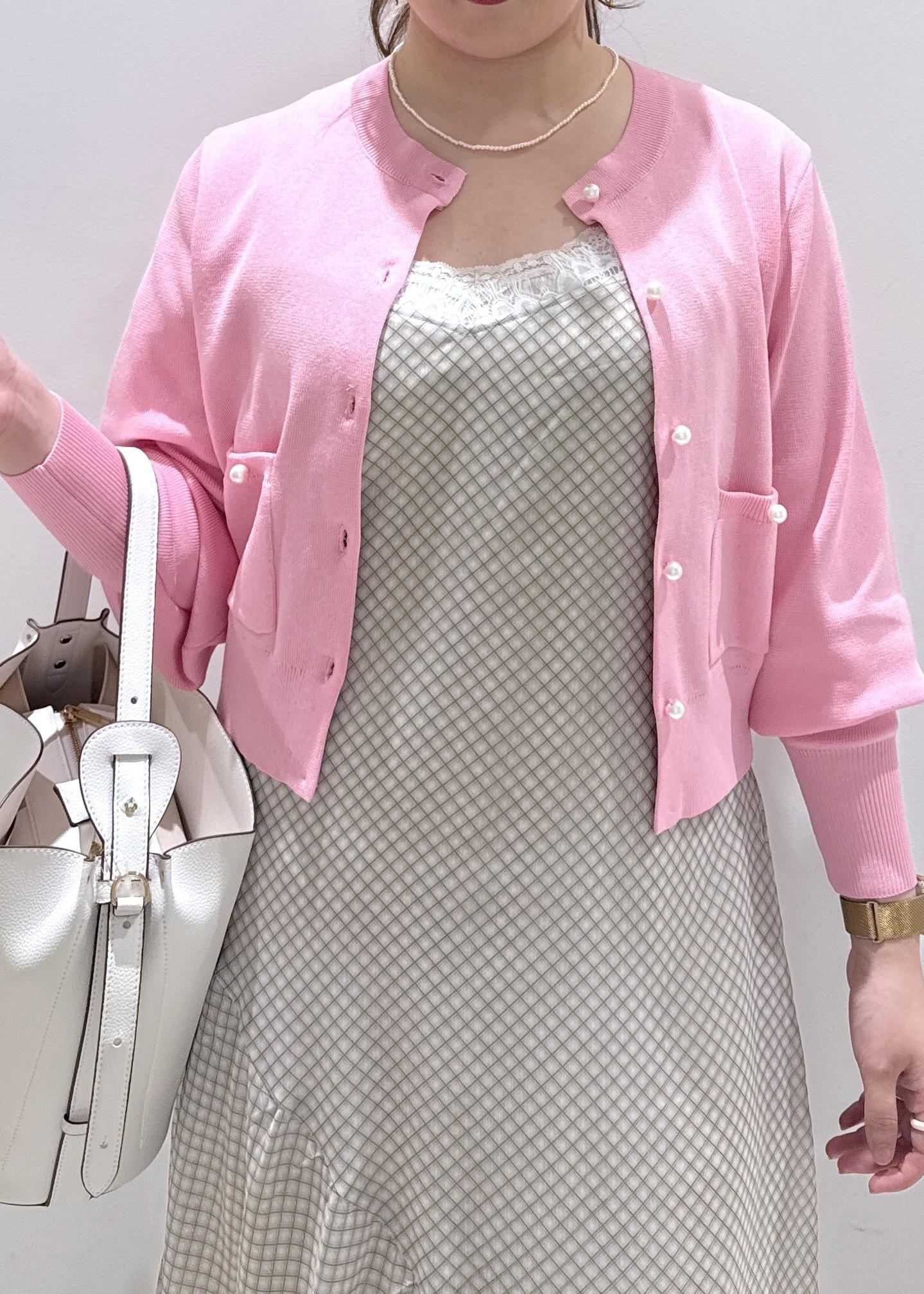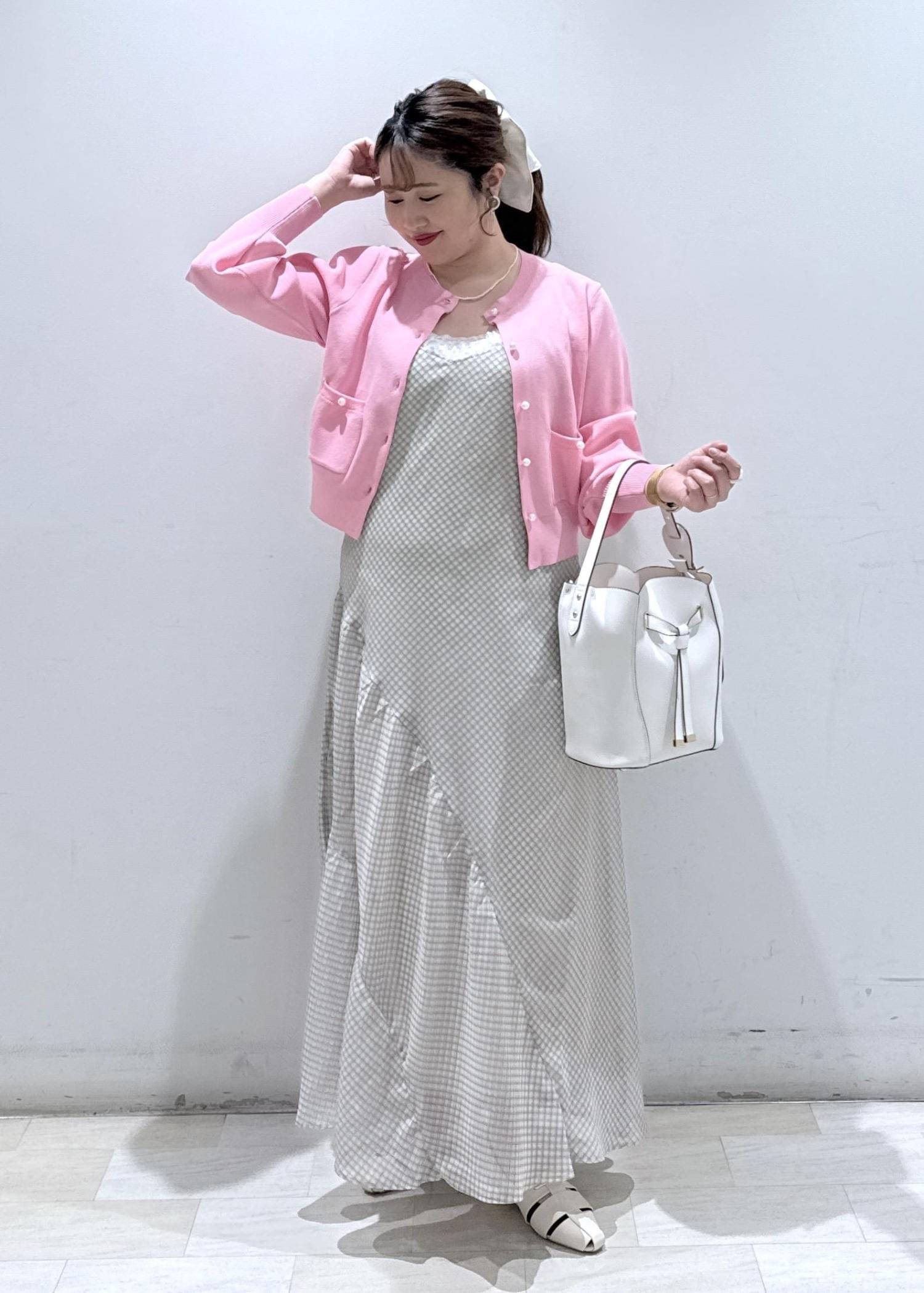 今回は新作で入荷しました、チェック柄のキャミソールワンピースに発色の綺麗なピンクのカーディガンと合わせて春らしいデートコーデにしてみました♪お休みの休日にどこかふらっとカフェでもいかがでしょうか?ウエスト周りもゆったりとしているので、サイズ感的にも大きく妊婦さんの方でも楽に着られると思います。