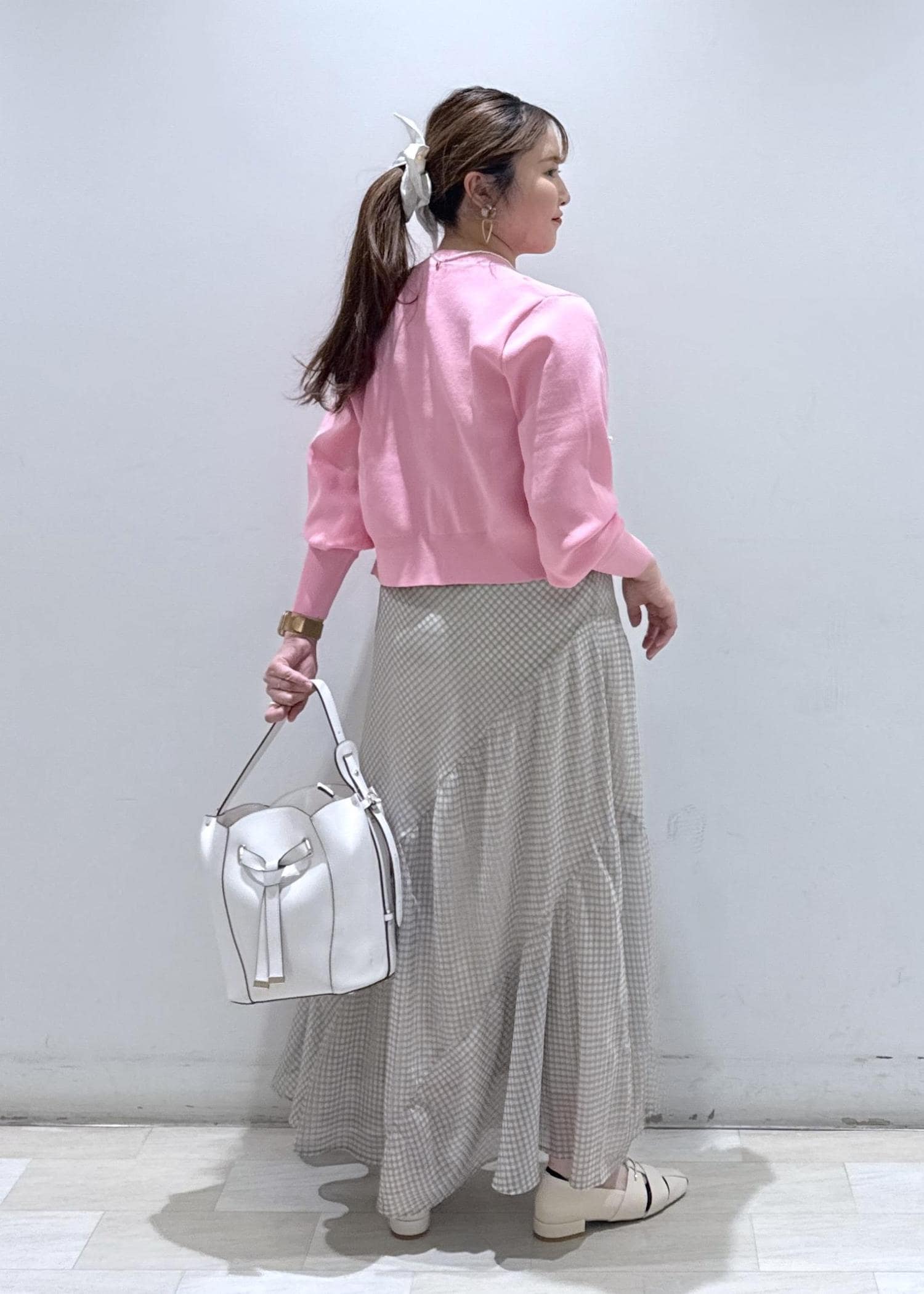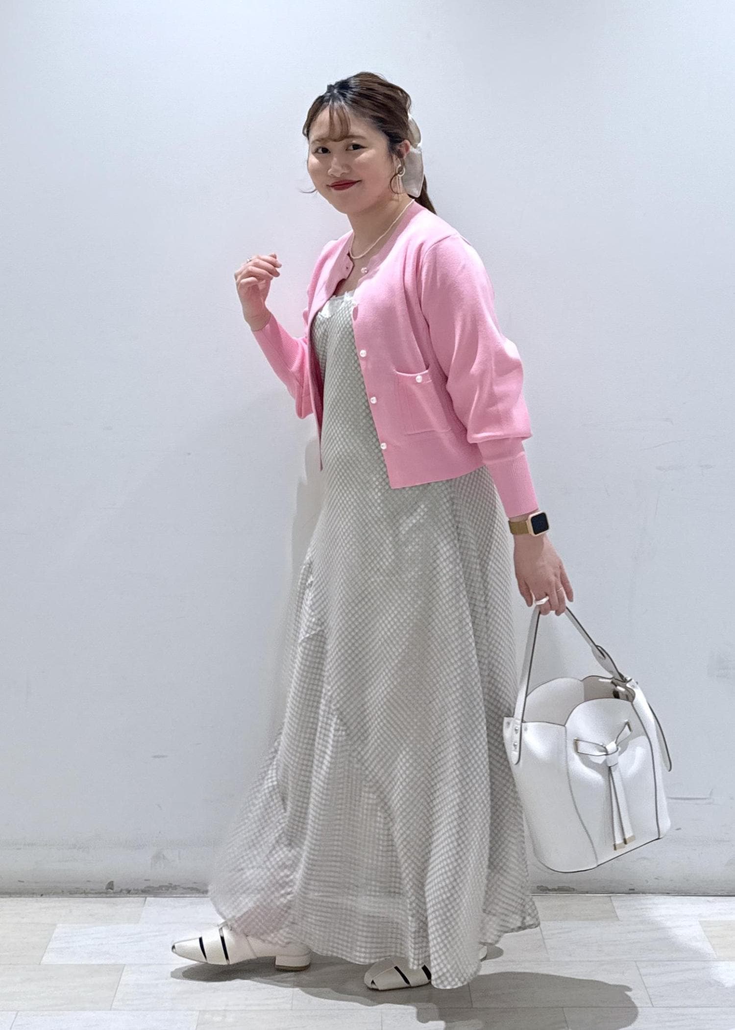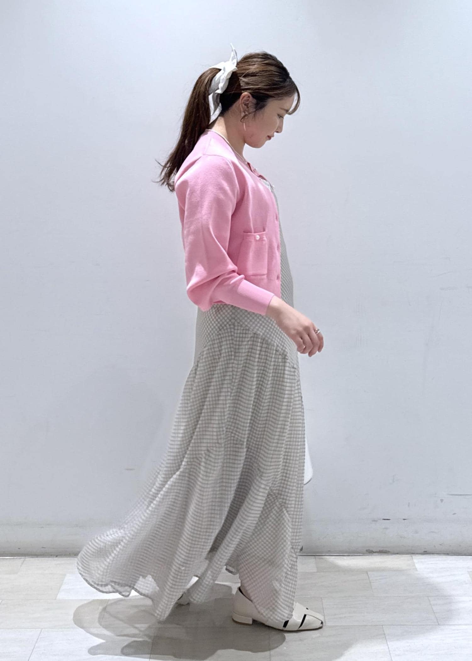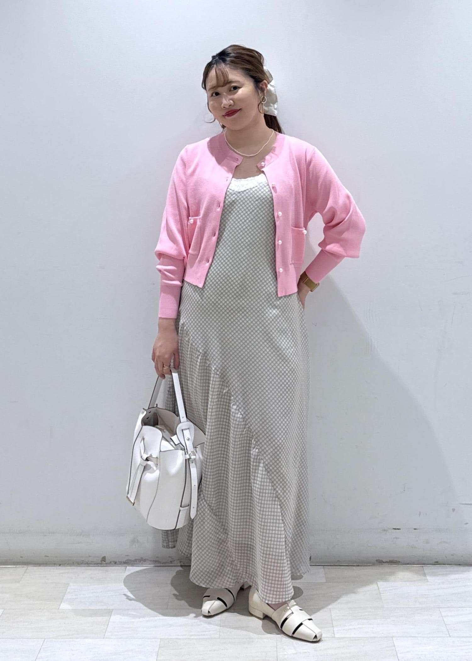 今回は新作で入荷しました、チェック柄のキャミソールワンピースに発色の綺麗なピンクのカーディガンと合わせて春らしいデートコーデにしてみました♪お休みの休日にどこかふらっとカフェでもいかがでしょうか?ウエスト周りもゆったりとしているので、サイズ感的にも大きく妊婦さんの方でも楽に着られると思います。