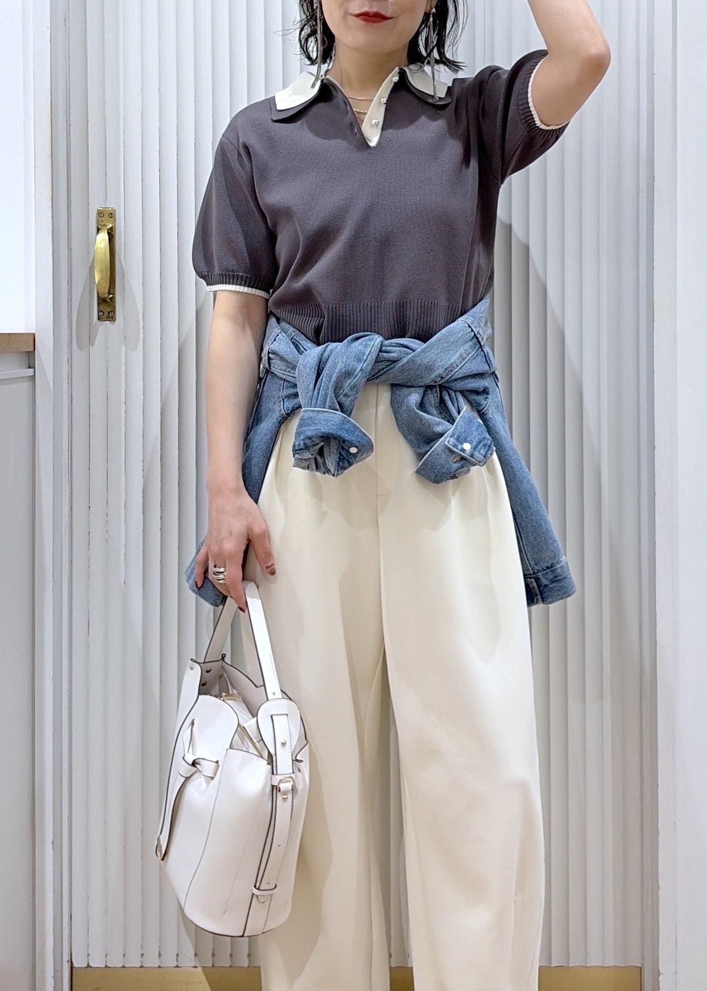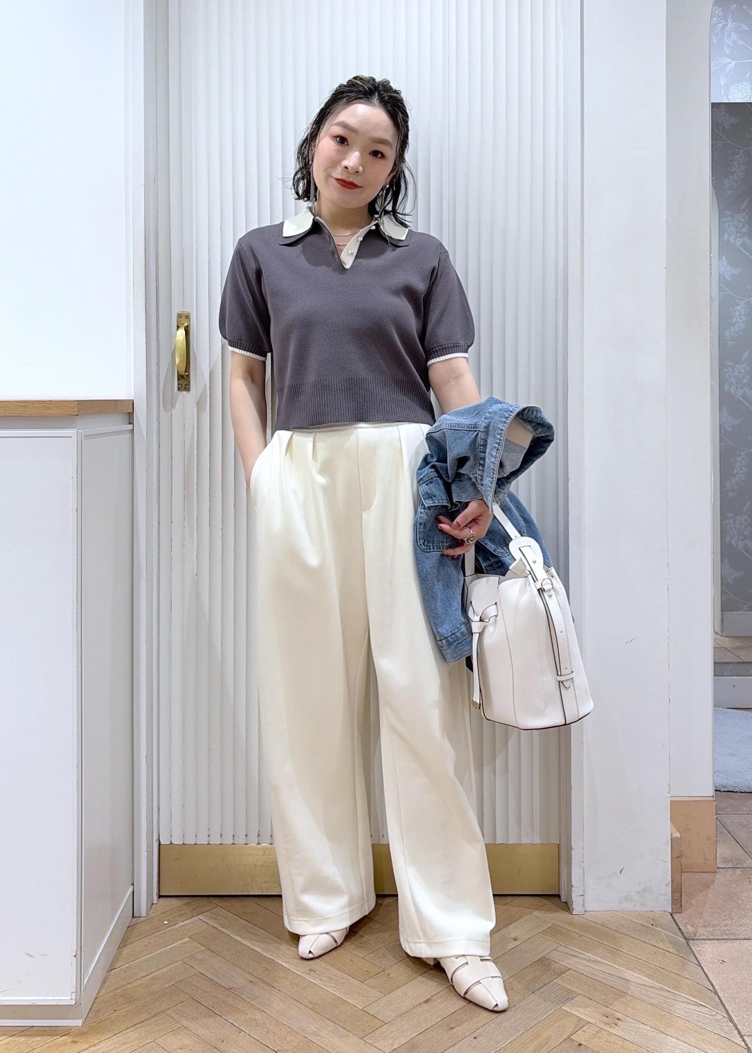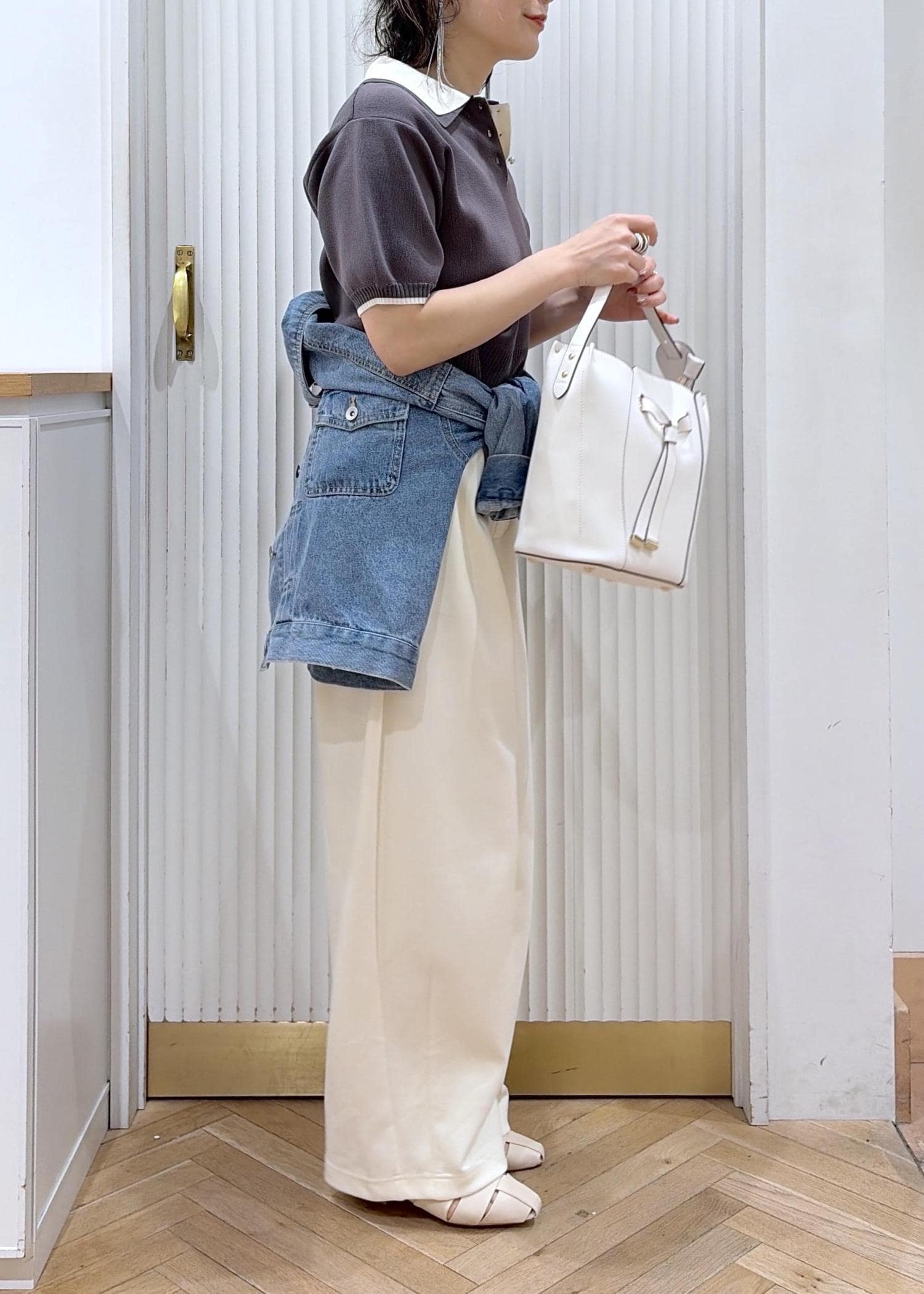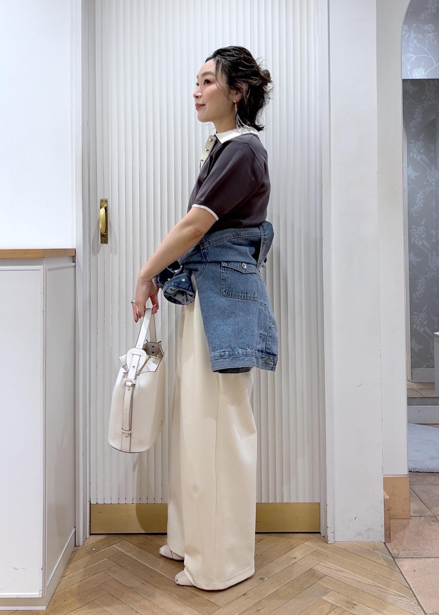 コンパクトなポロニットに、クリーンなパンツを合わせて上品リラックスに。デニムジャケットをウエストに巻くことでこなれたアクセントをプラス。ホワイトバッグで軽さを出して、春らしい抜け感を演出した大人カジュアルコーデです。