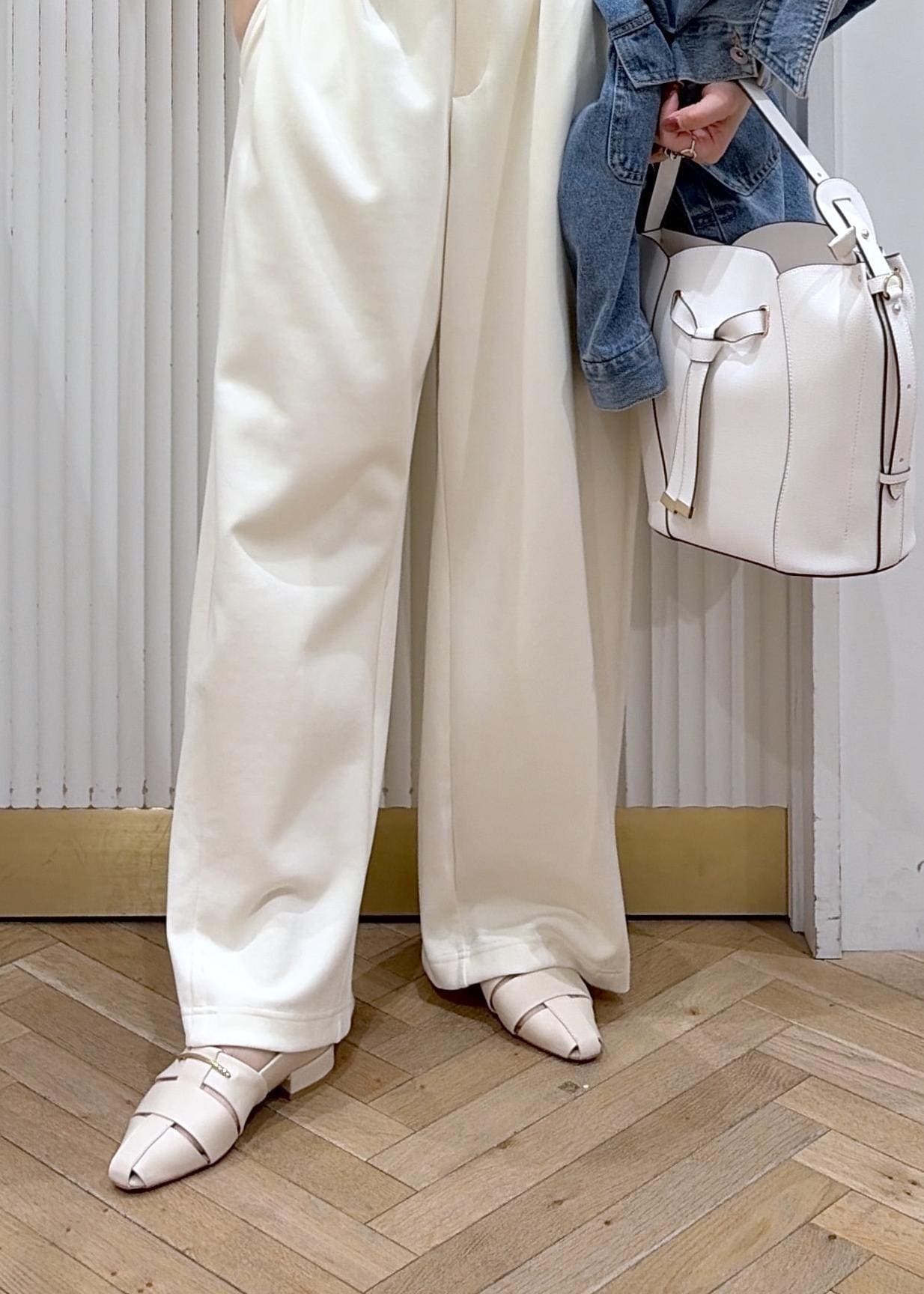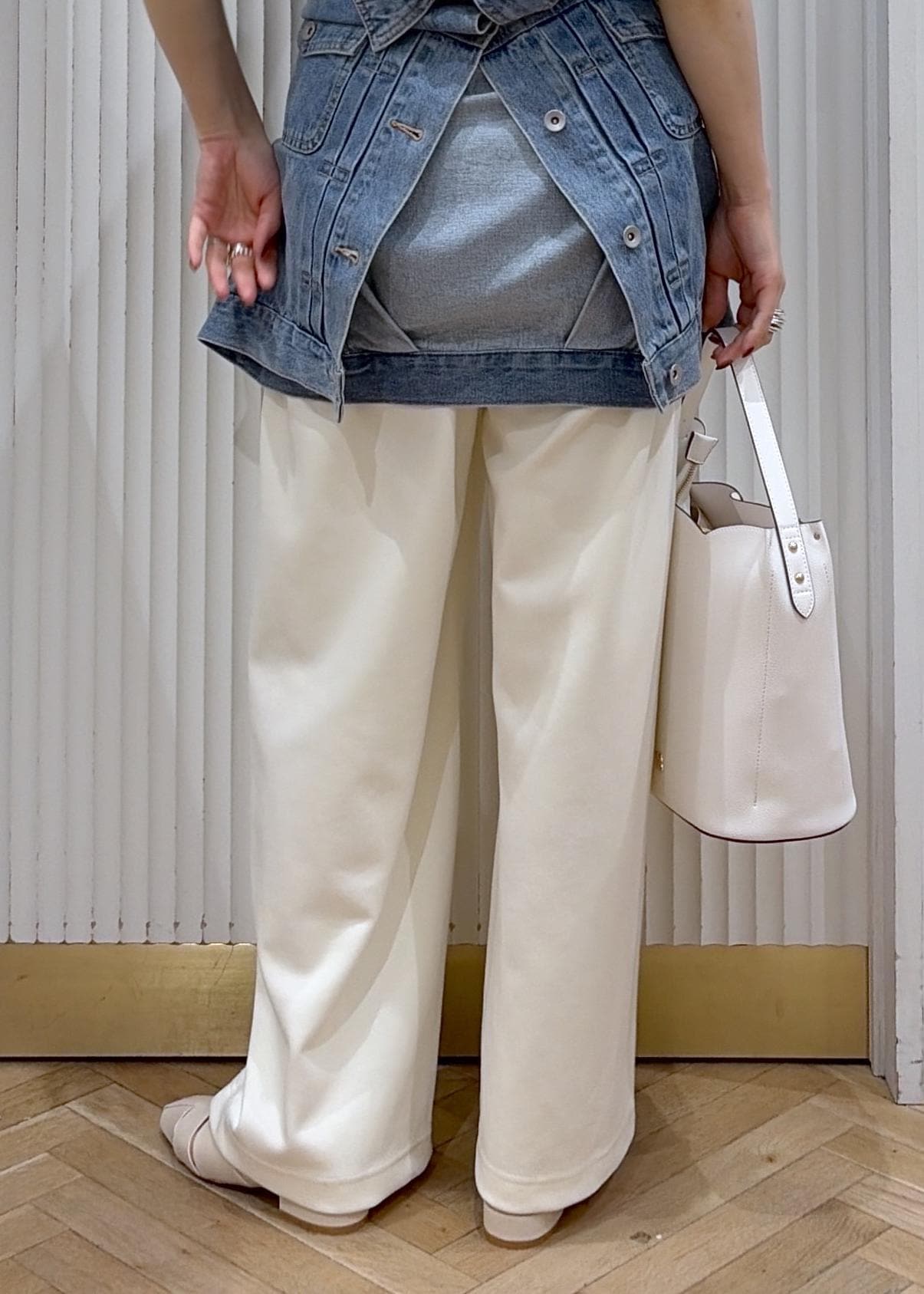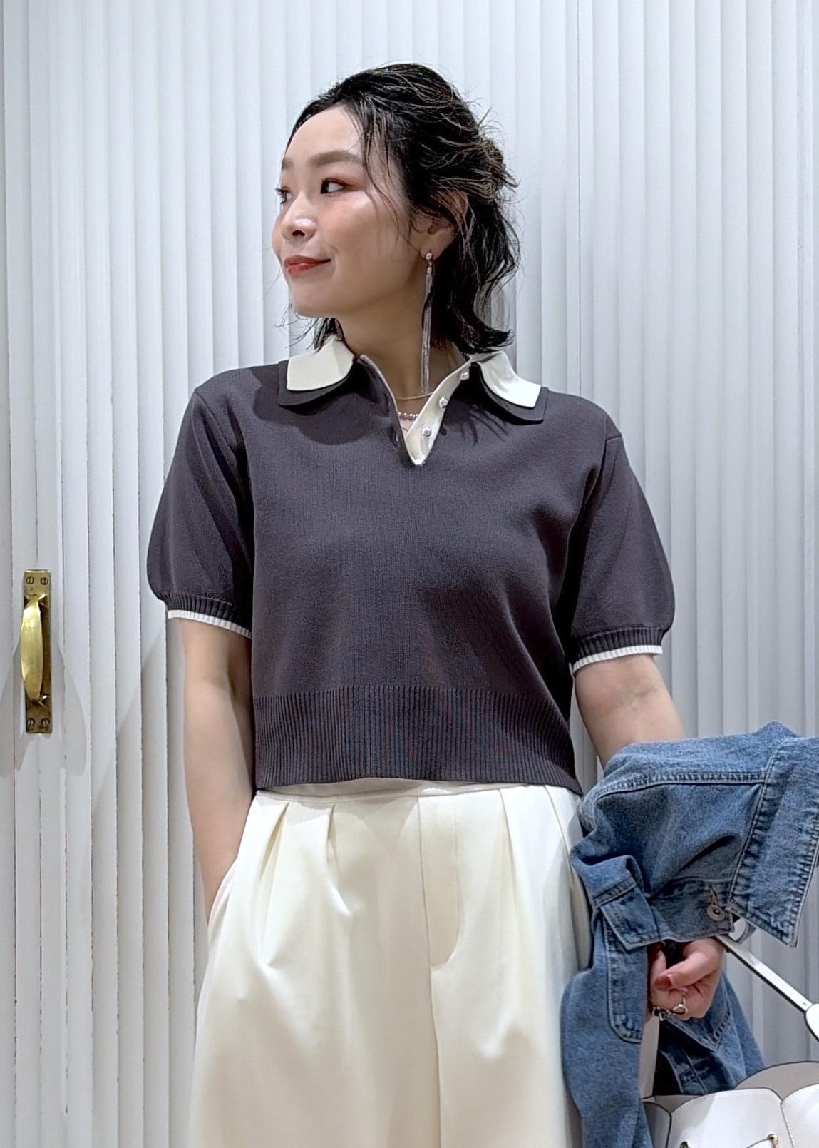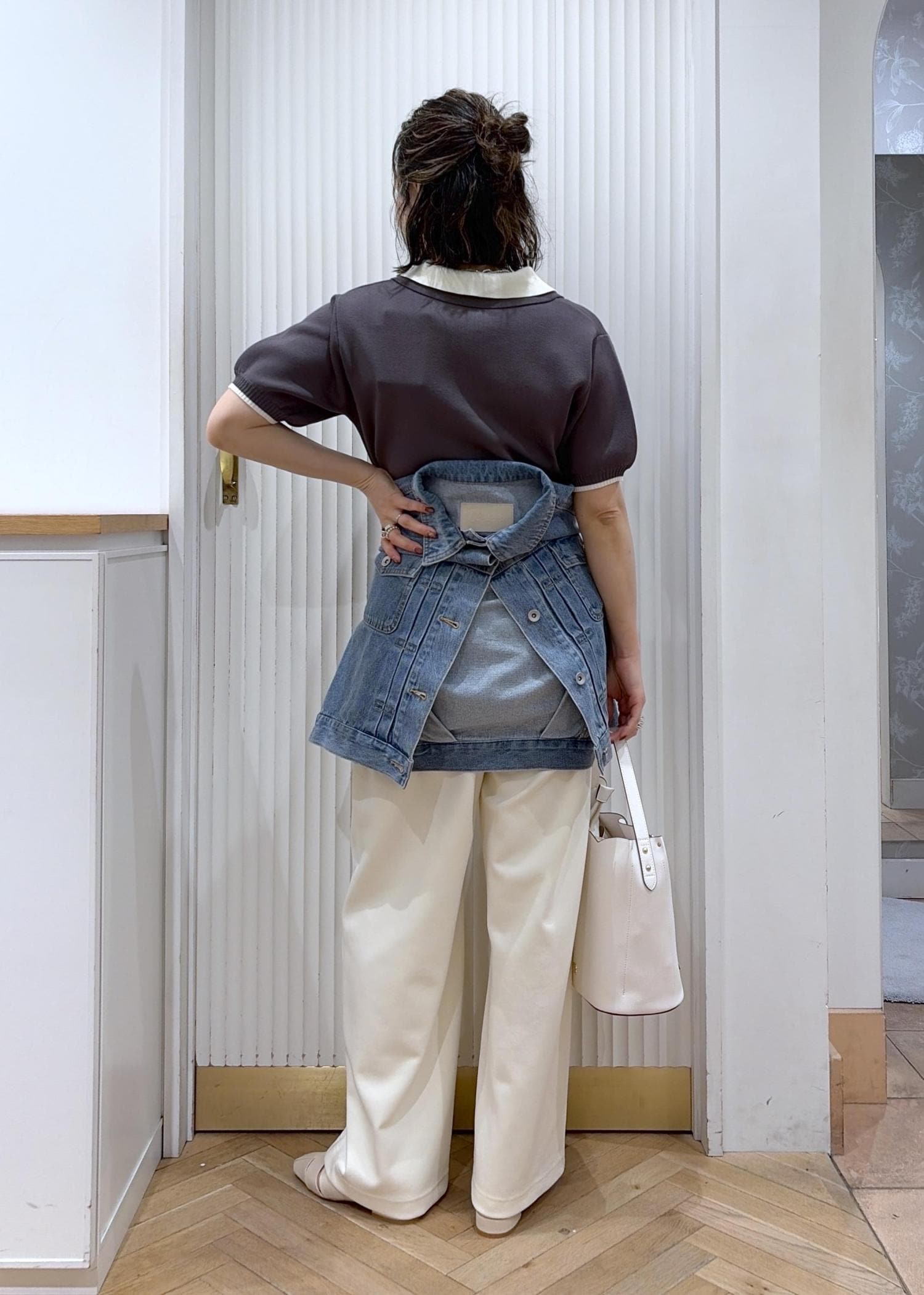 コンパクトなポロニットに、クリーンなパンツを合わせて上品リラックスに。デニムジャケットをウエストに巻くことでこなれたアクセントをプラス。ホワイトバッグで軽さを出して、春らしい抜け感を演出した大人カジュアルコーデです。