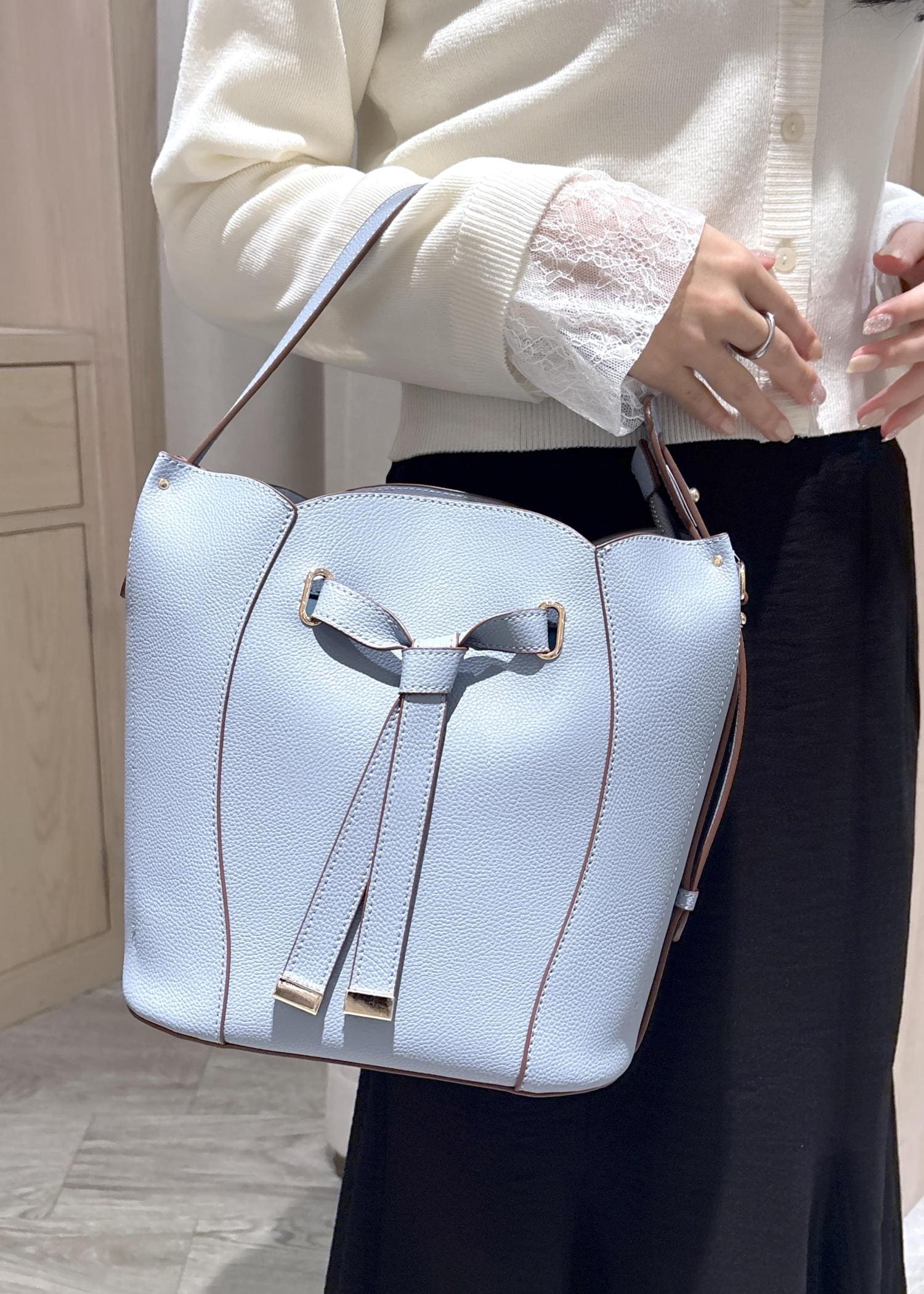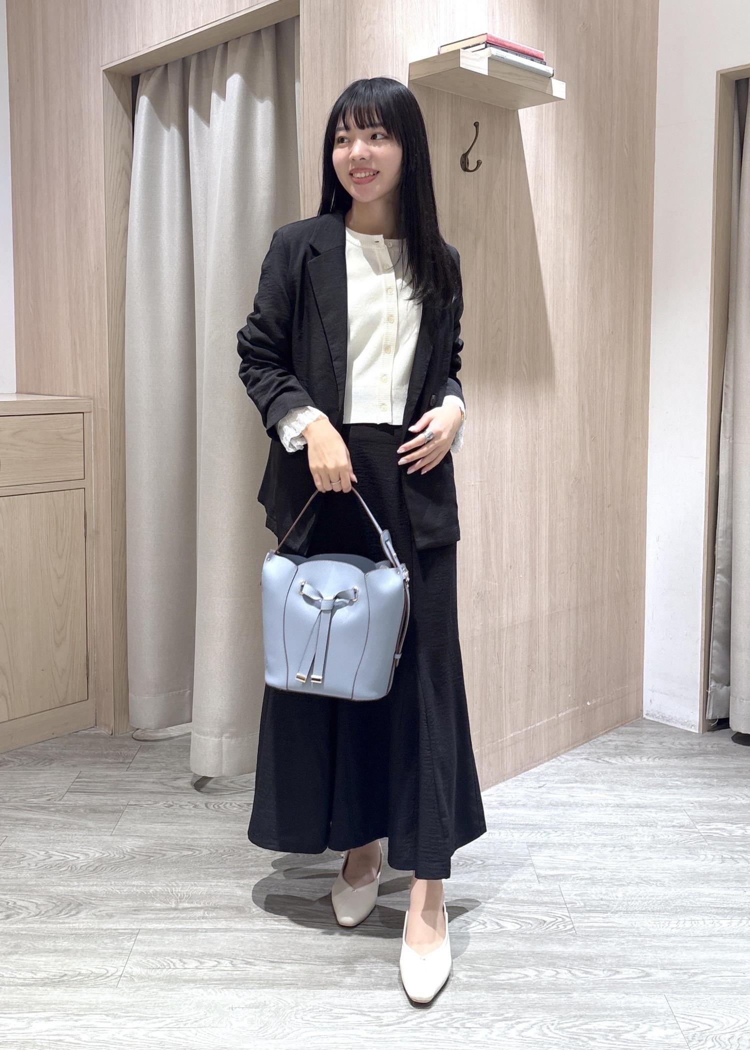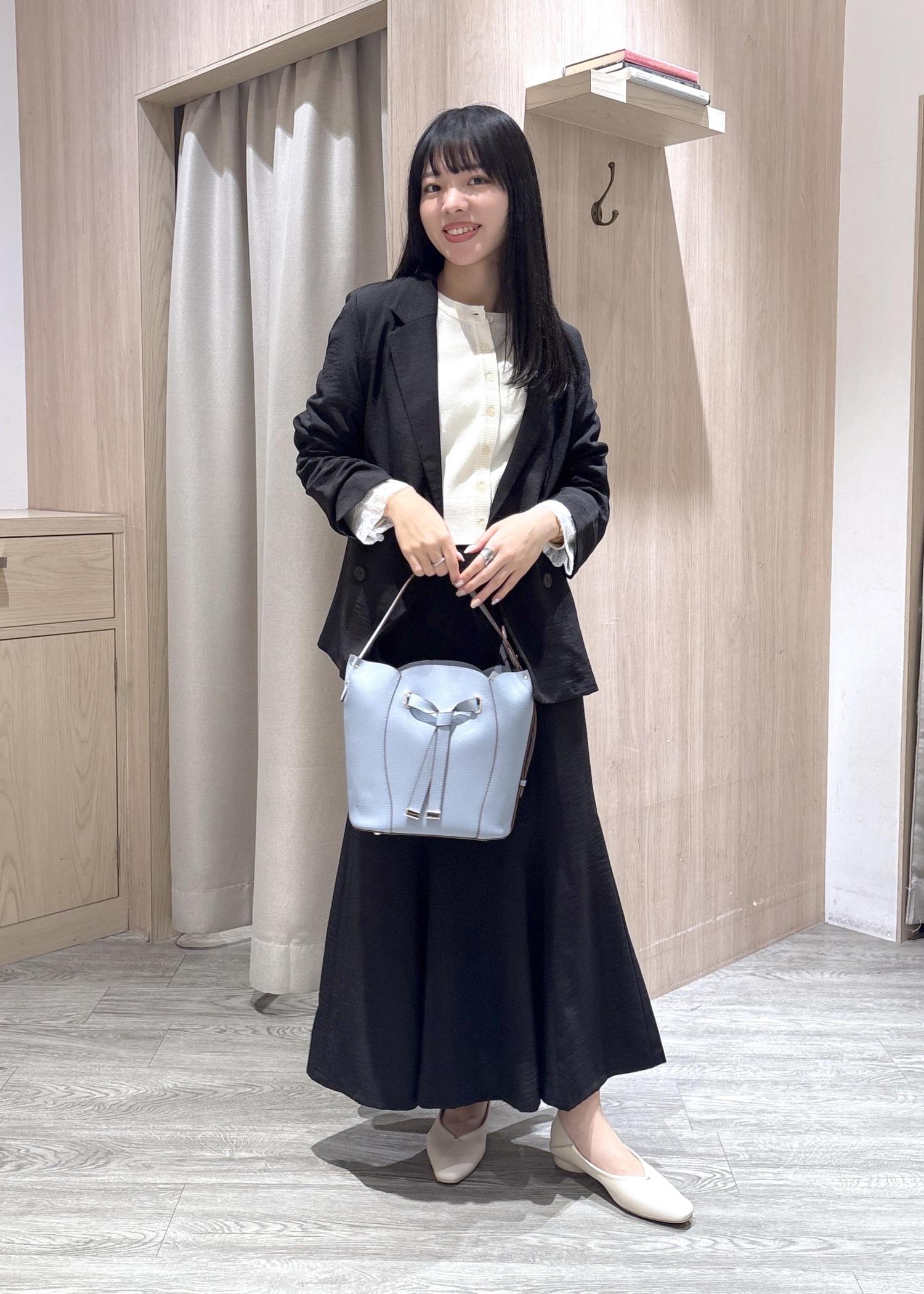 アクセントに水色のバッグを合わせました。