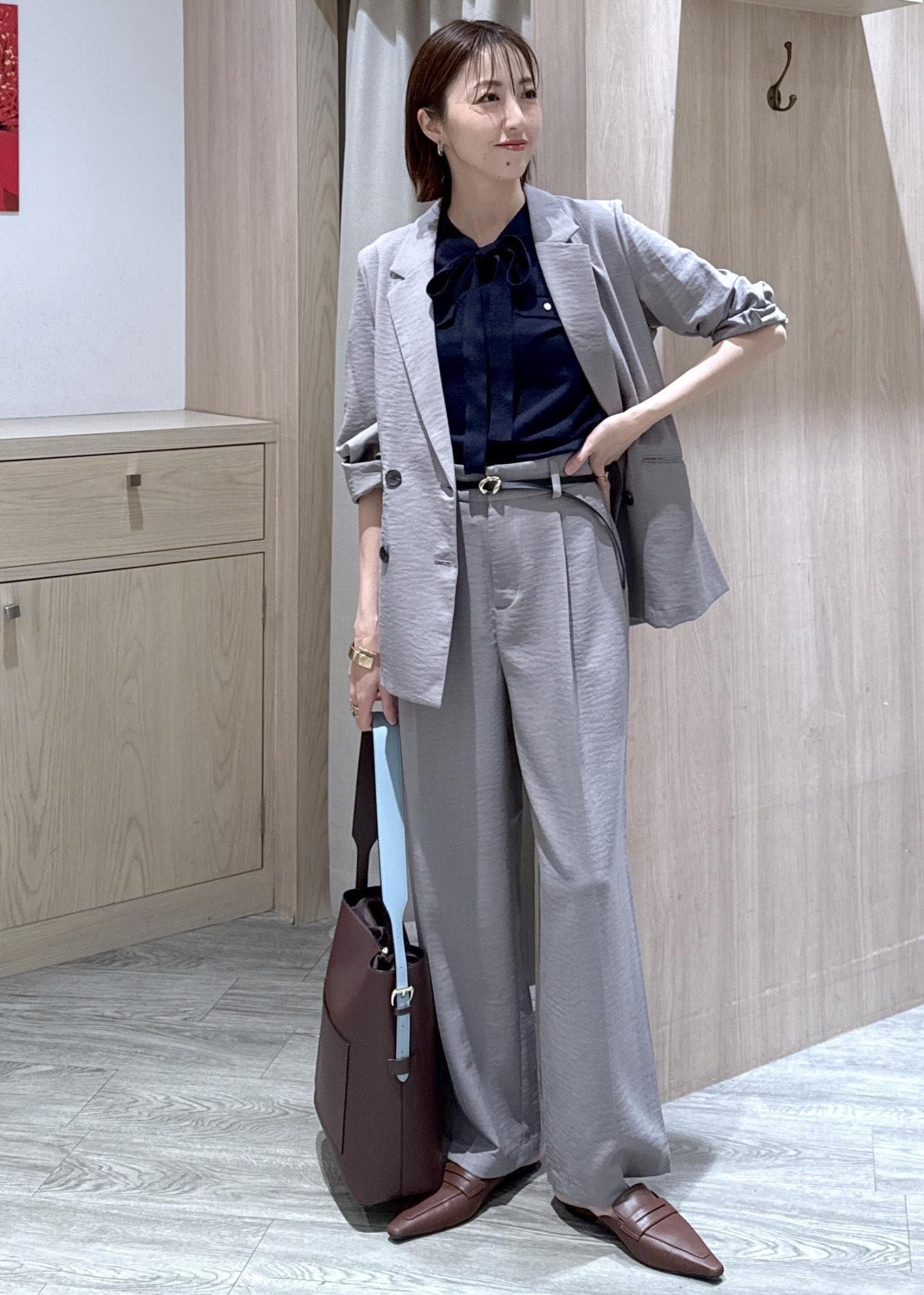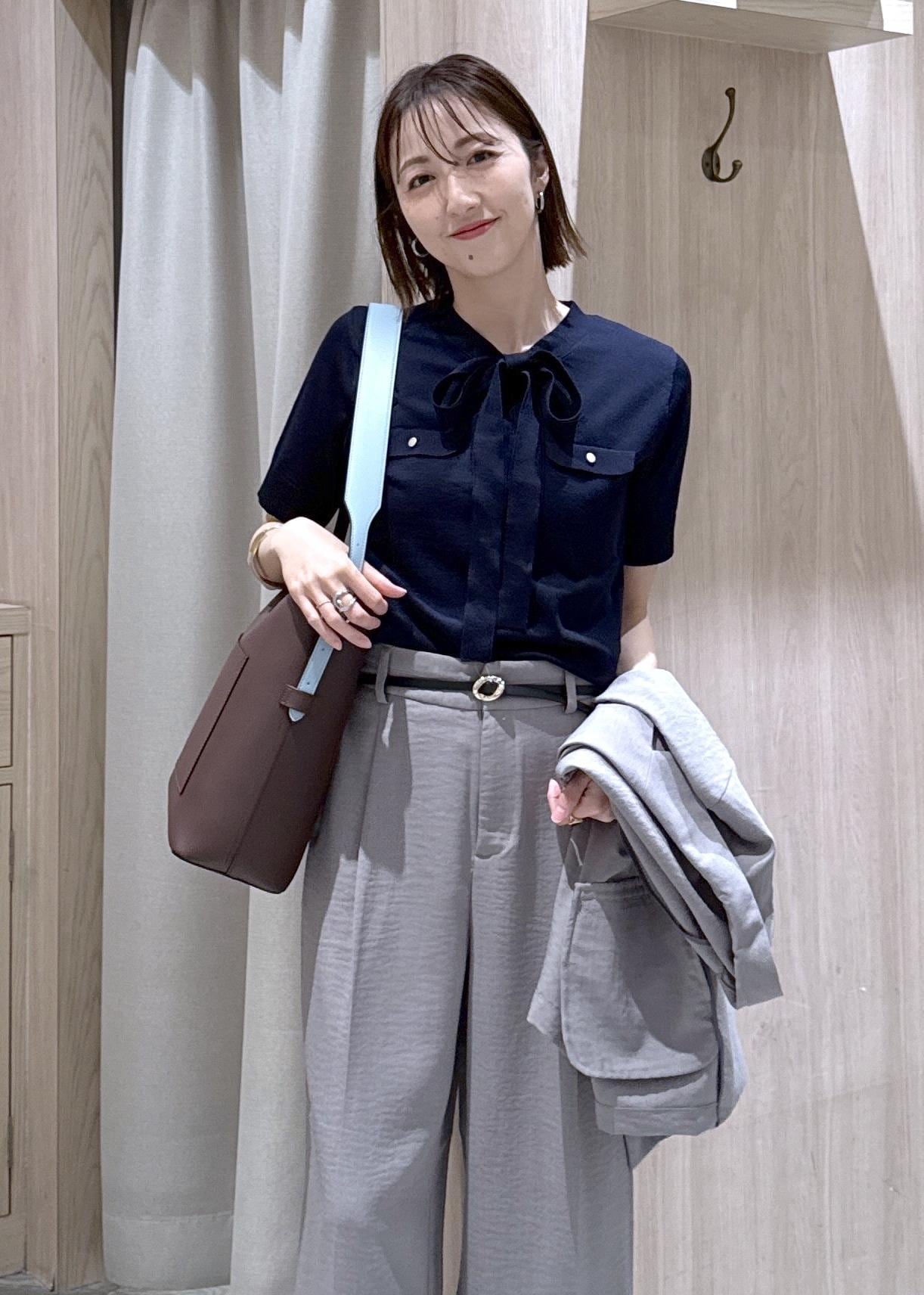 美easyリネンライクのセットアップにボウタイニットを合わせた、きちんとコーデです☆