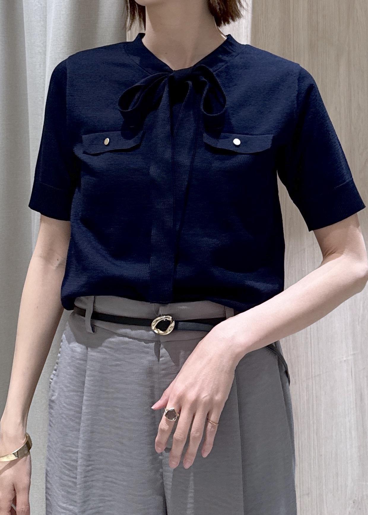 襟元がボウタイになっているニットなので、これ一枚でもジャケット等のインナーとしても重宝します!