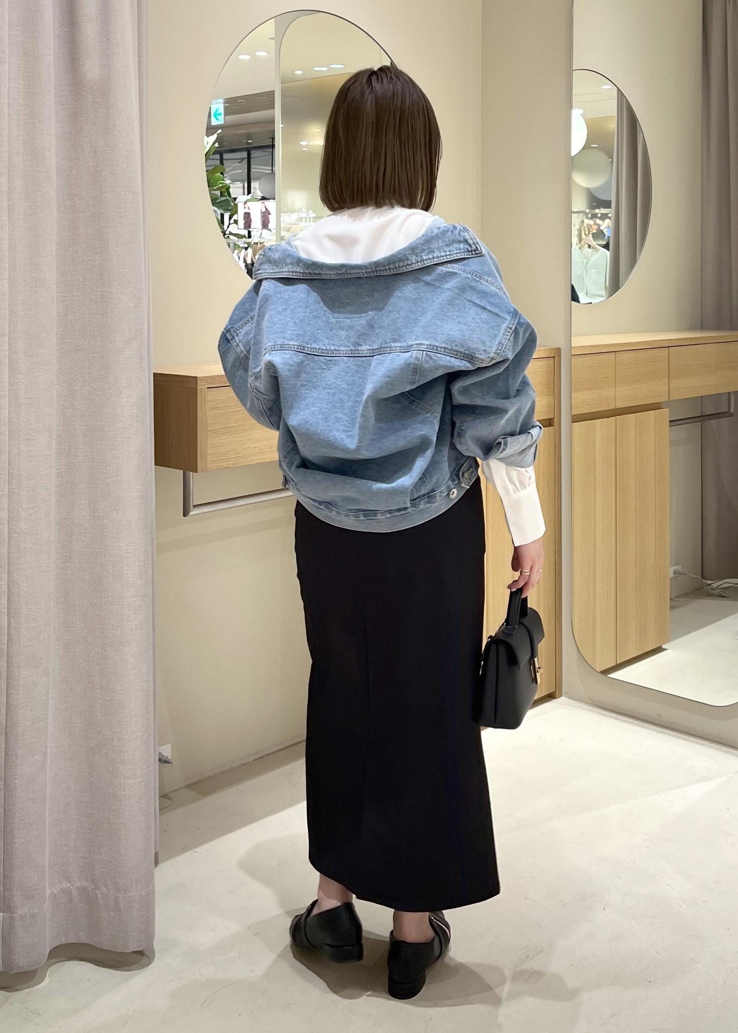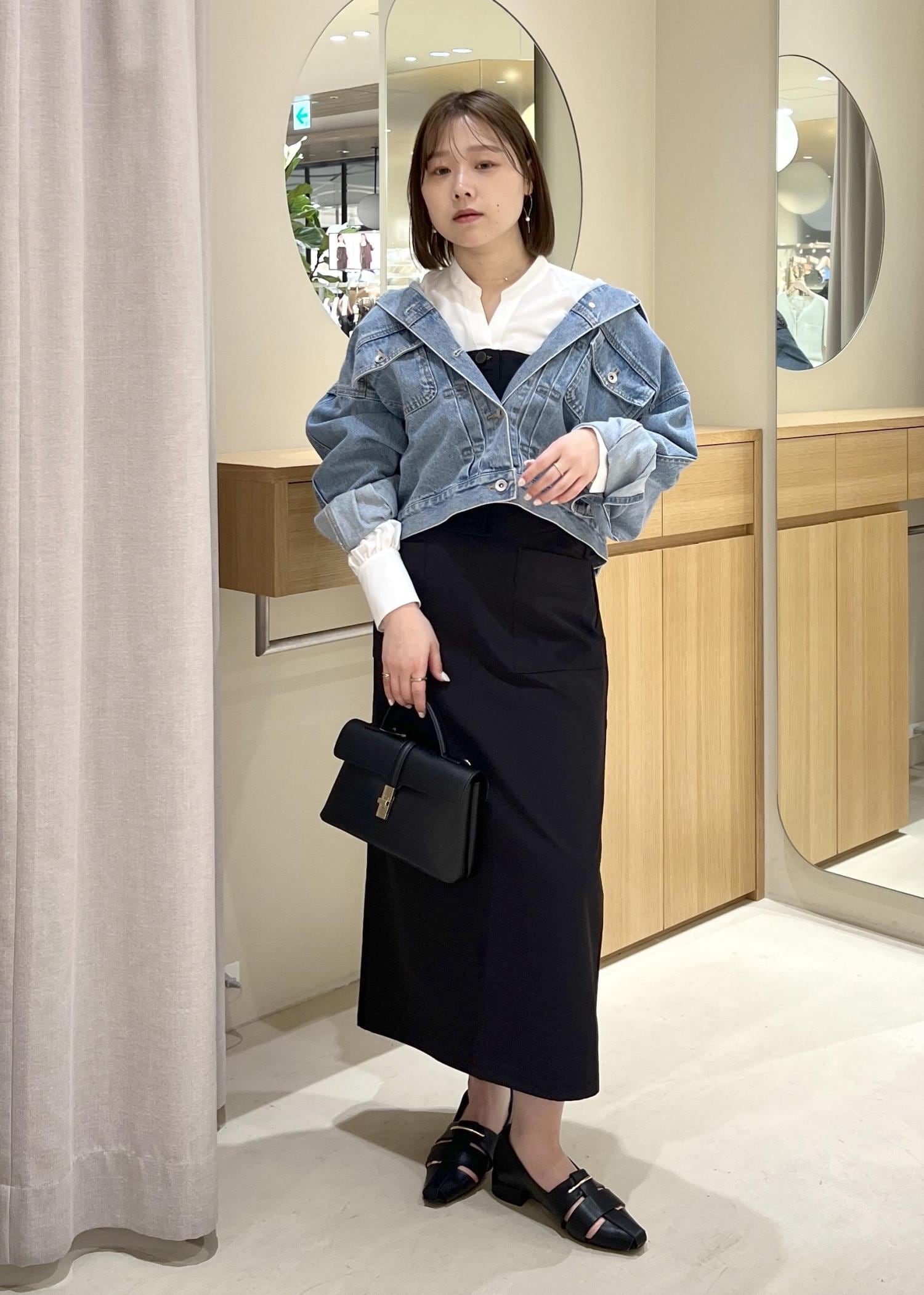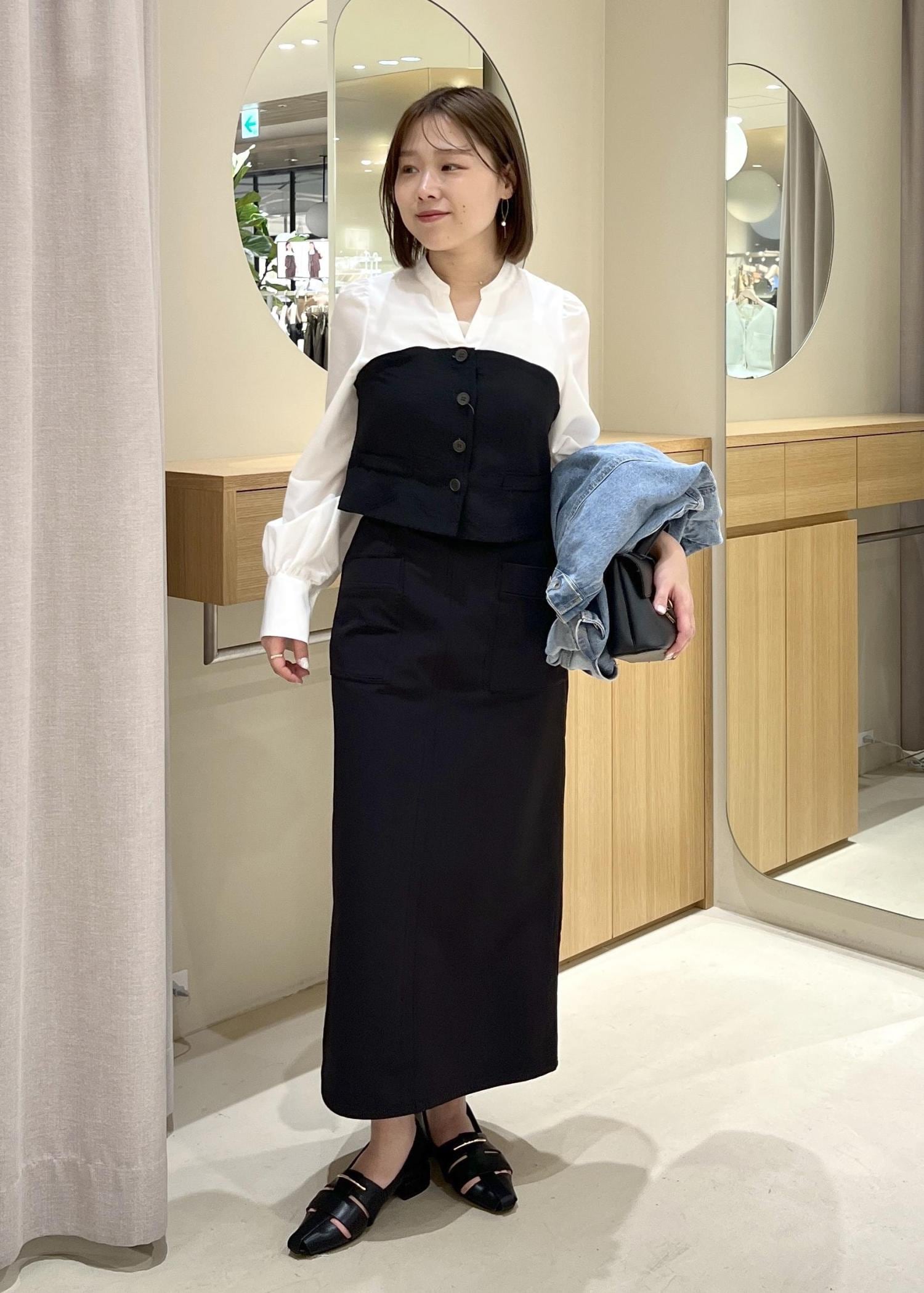 美easyのビスチェシャツを使って、キレイめカジュアルコーデにしてみました。ブラックのIラインスカートと合わせて、キレイめの上から、デニムジャケットを合わせてカジュアルさをプラスしました。