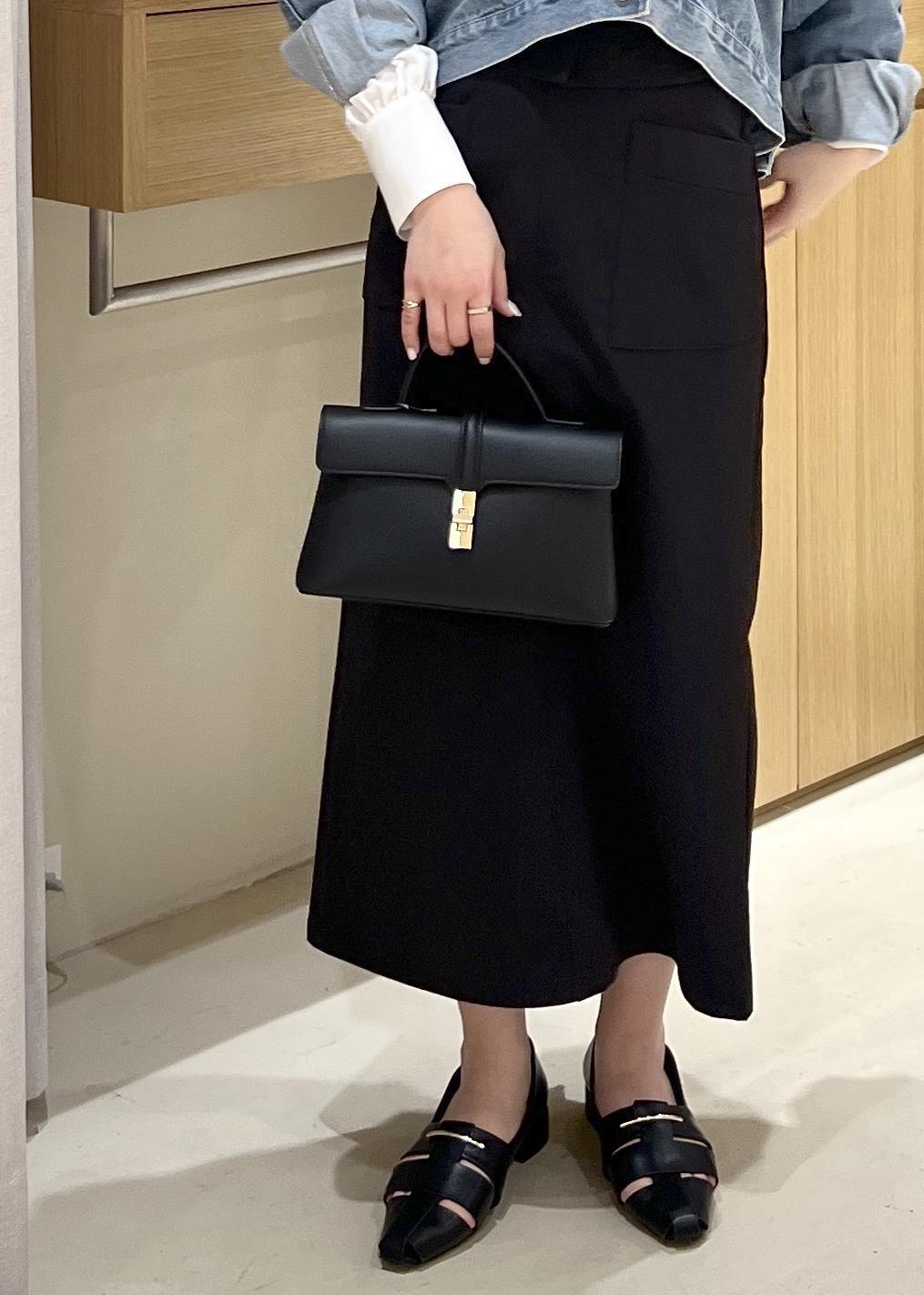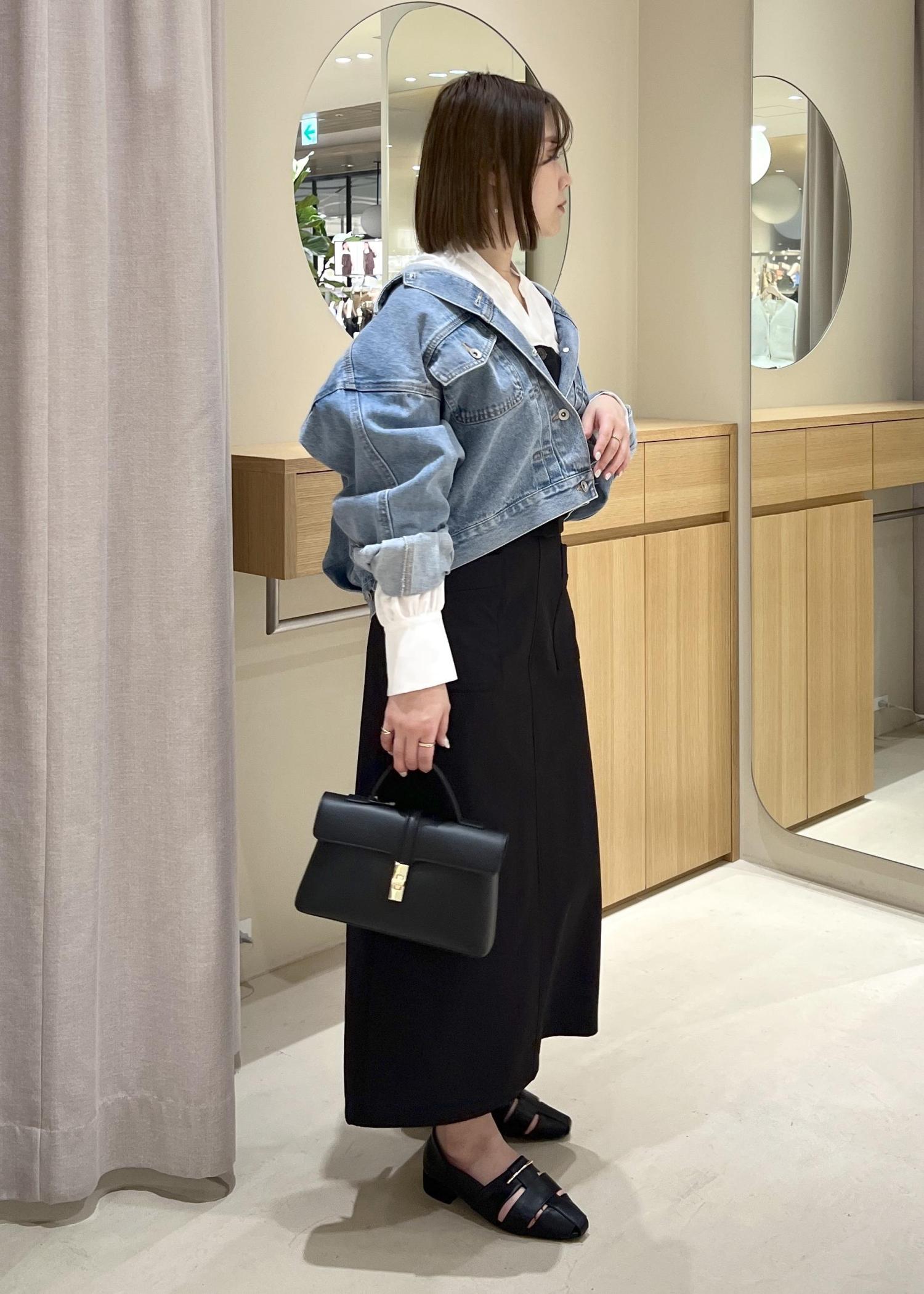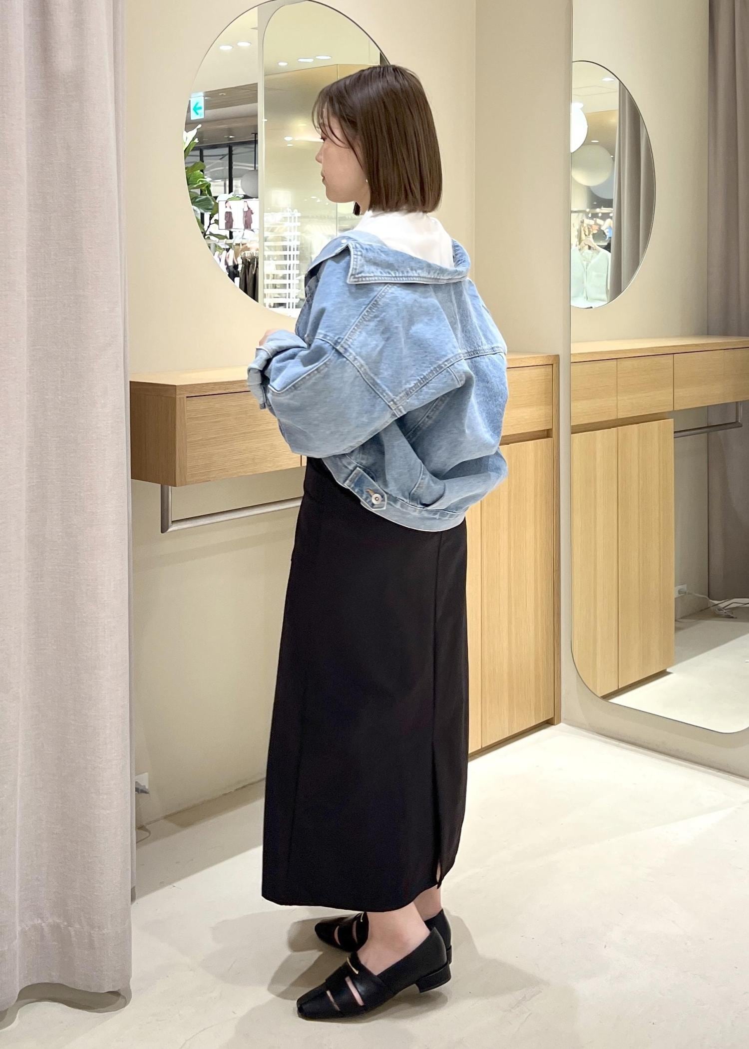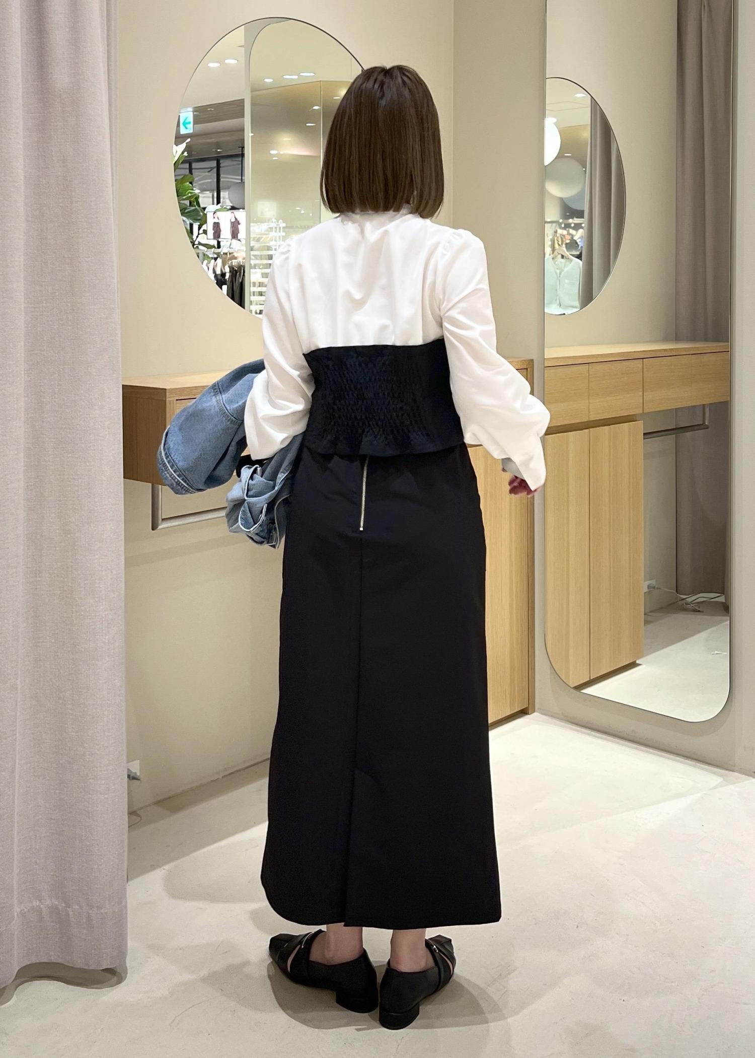 美easyのビスチェシャツを使って、キレイめカジュアルコーデにしてみました。ブラックのIラインスカートと合わせて、キレイめの上から、デニムジャケットを合わせてカジュアルさをプラスしました。