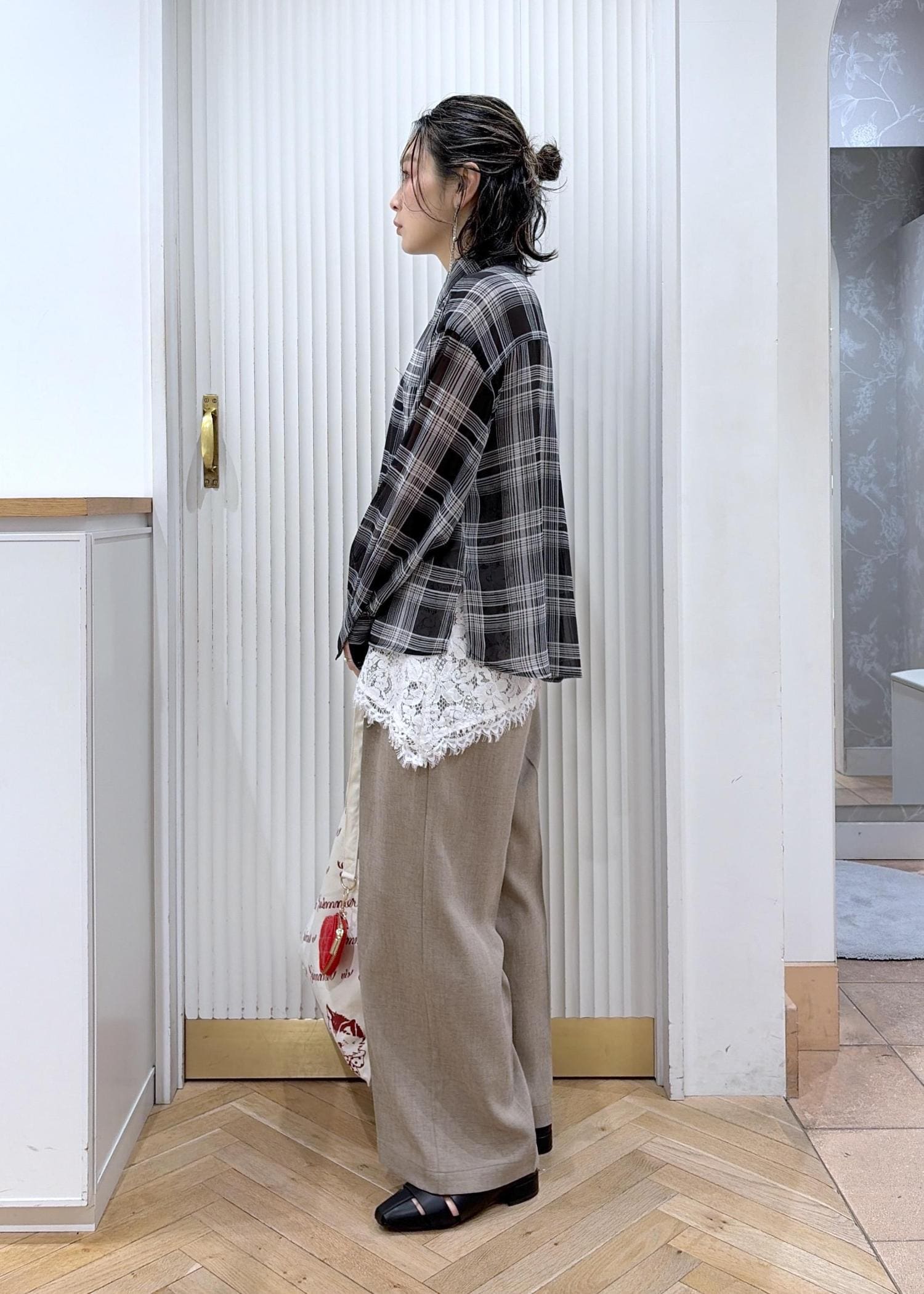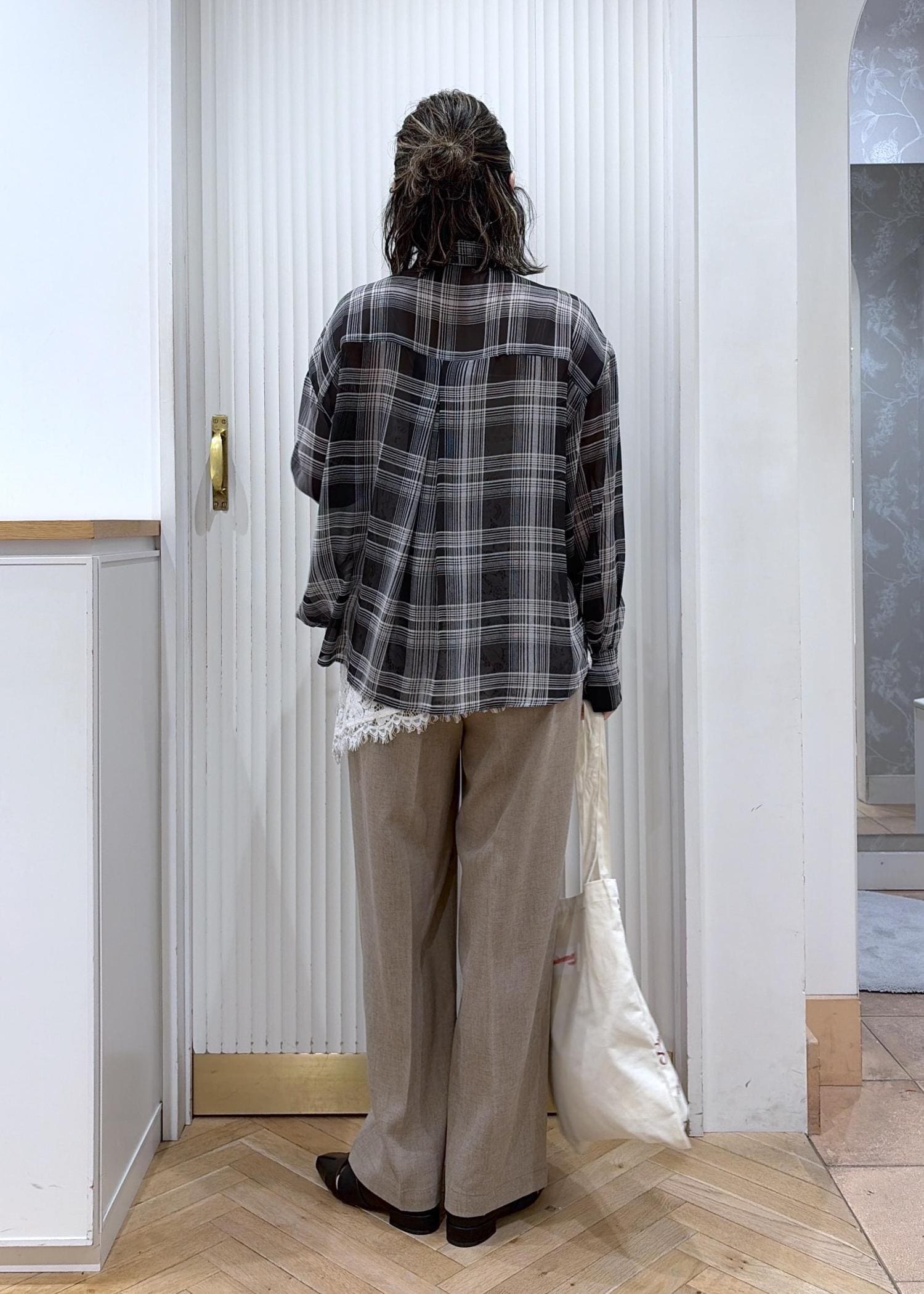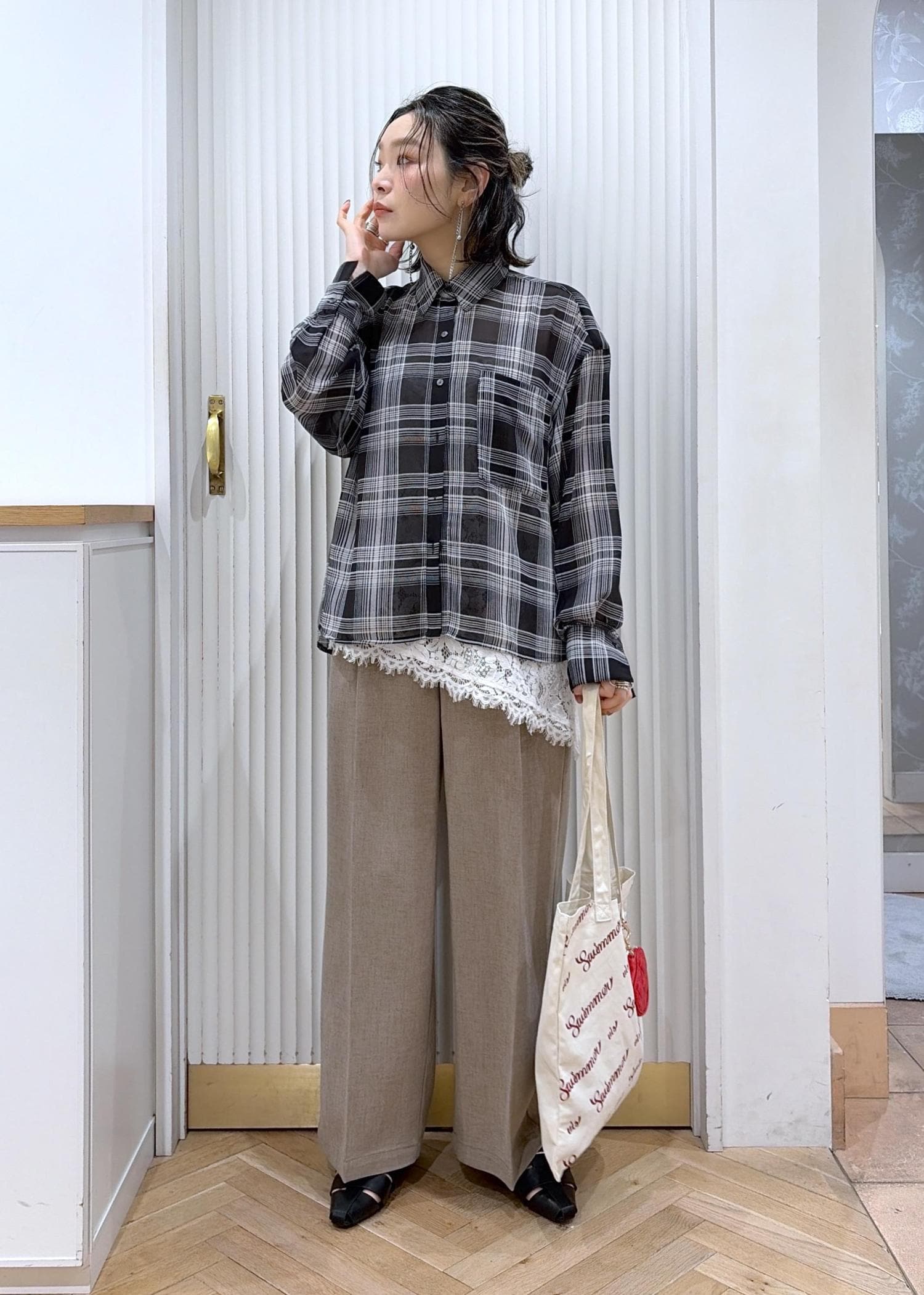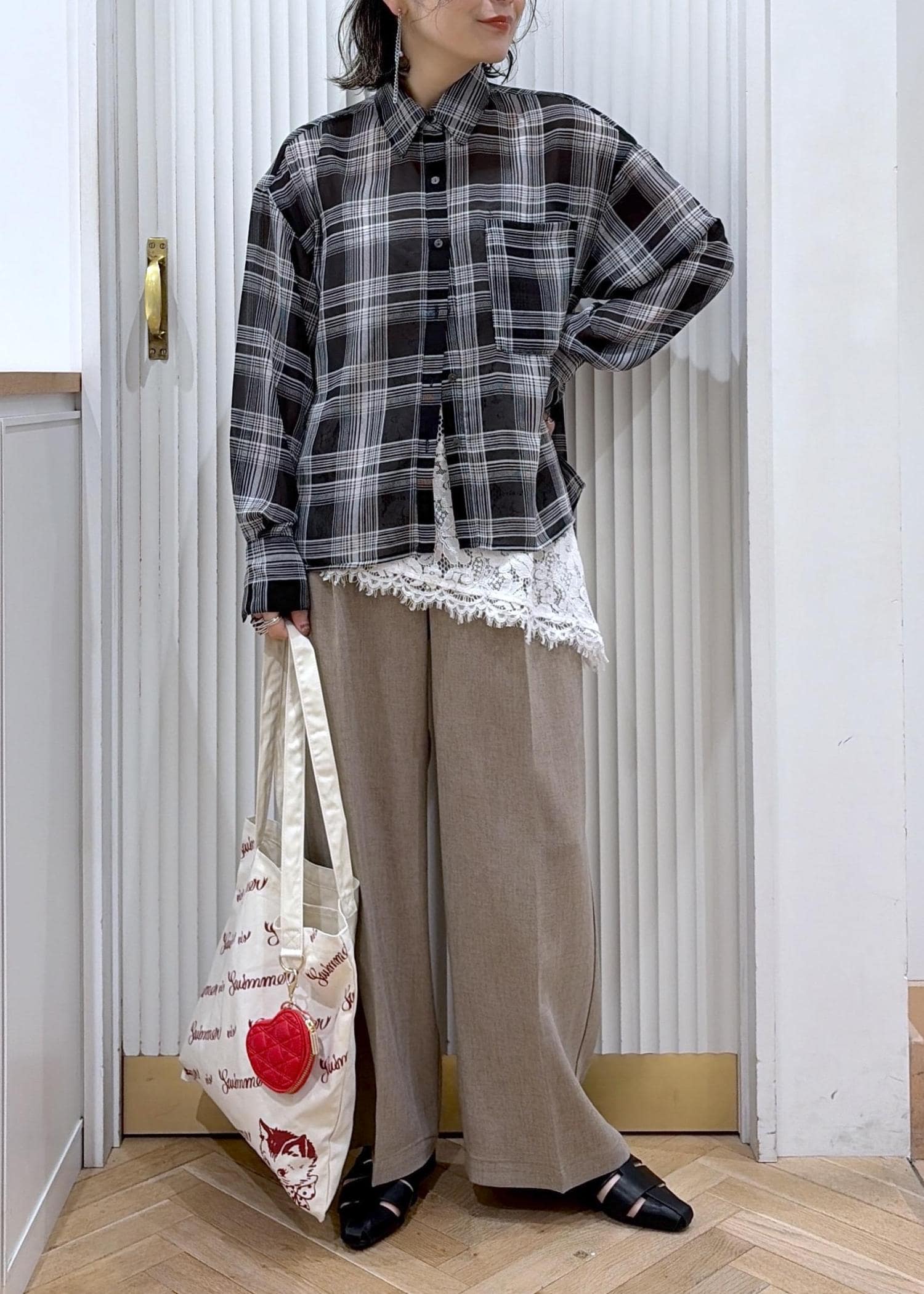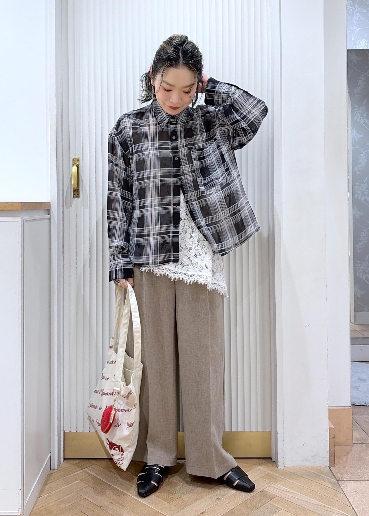 透けチェック×レースでつくる、大人の抜け感レイヤード