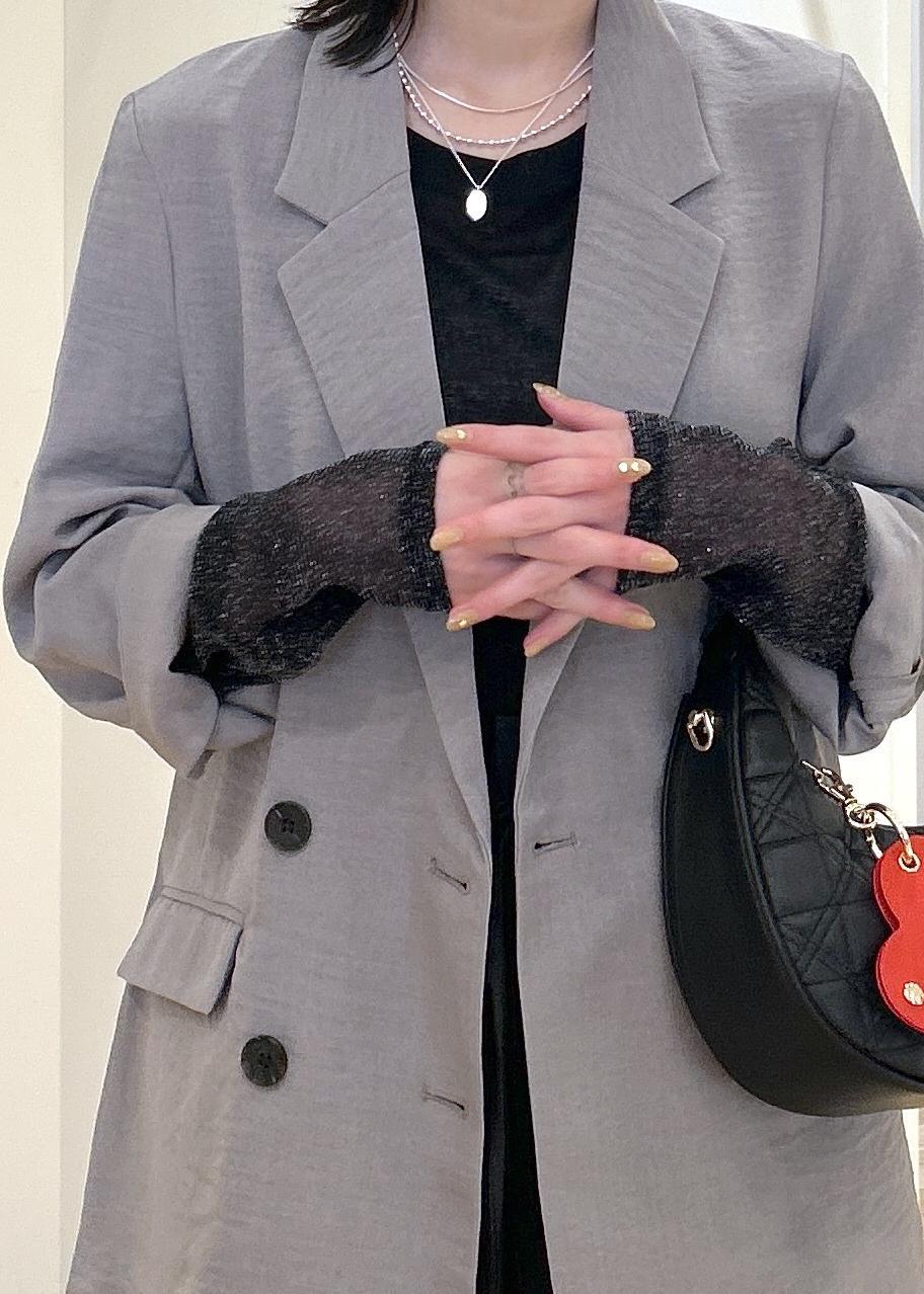 オールブラックでまとめたかっこいいスタイリングに、グレーのジャケットを羽織ったラフなお仕事スタイル◎