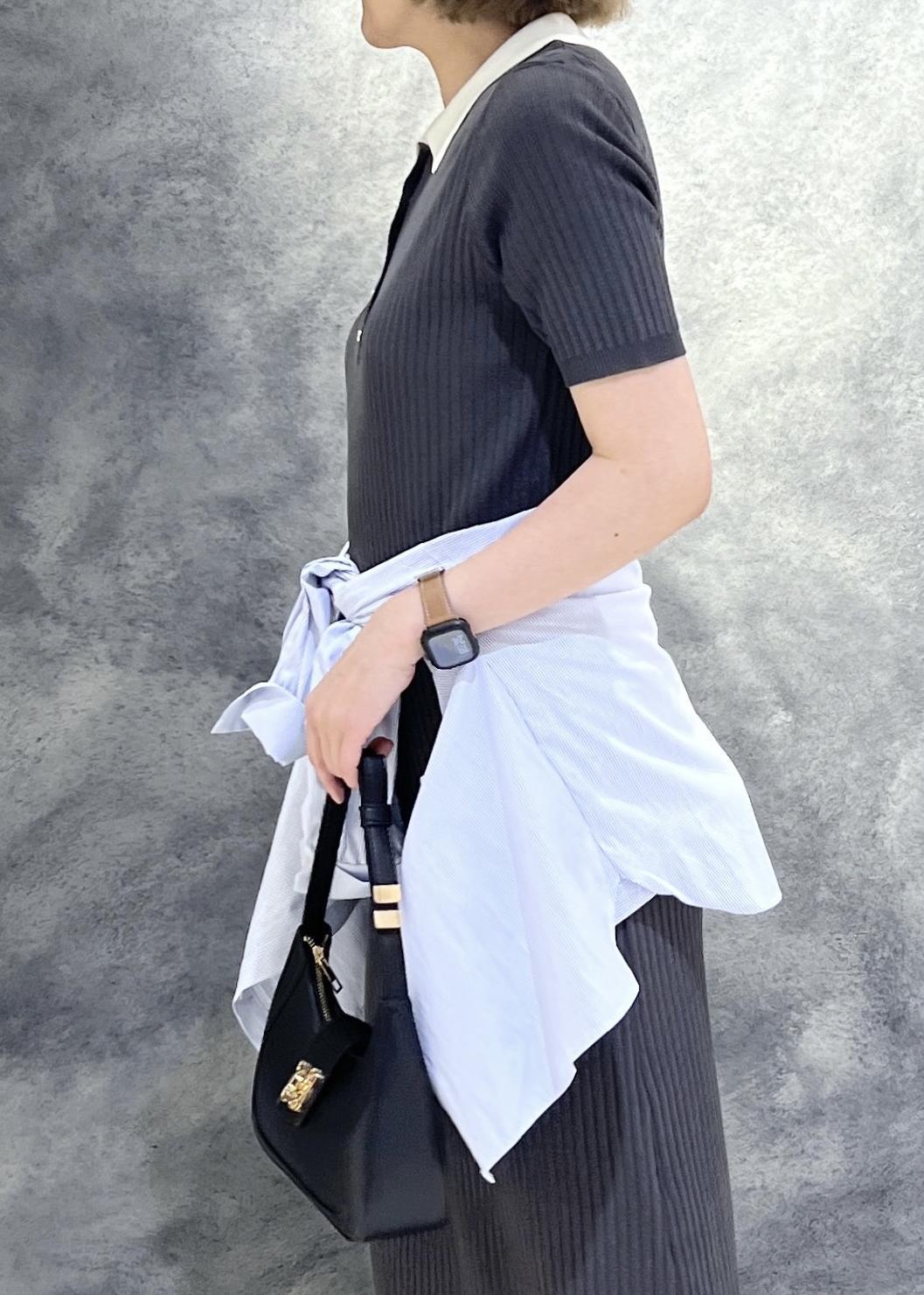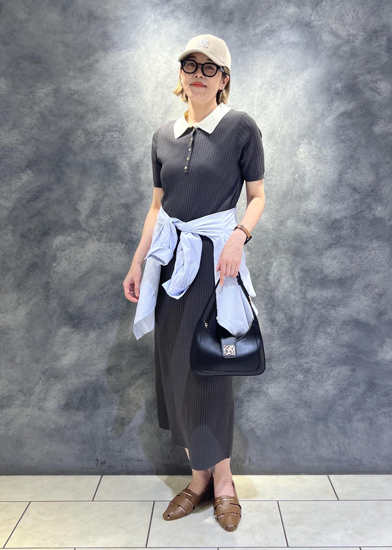ポロ襟ニットワンピースは1枚で着用しても体のラインを拾わずスッキリ細見え。