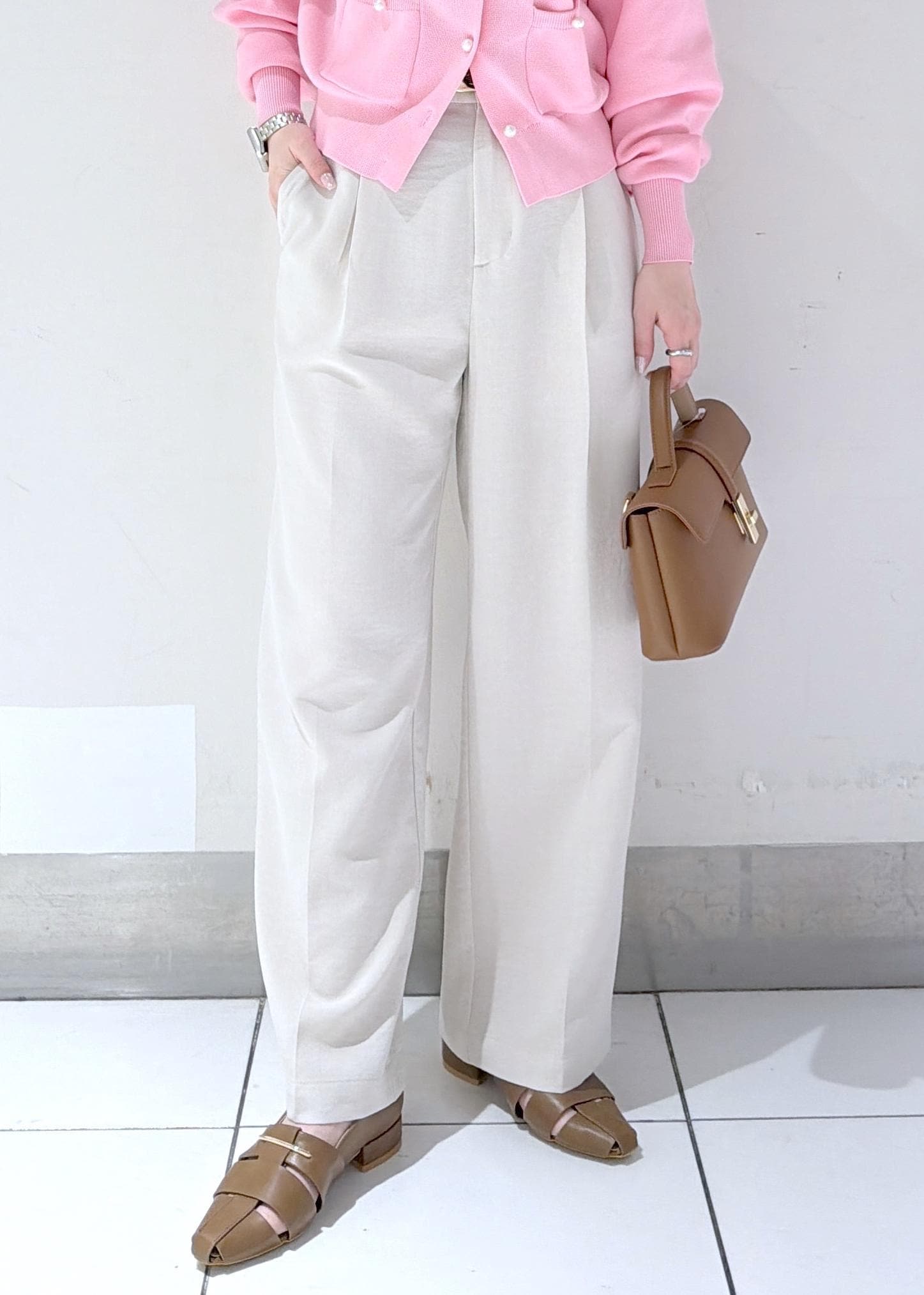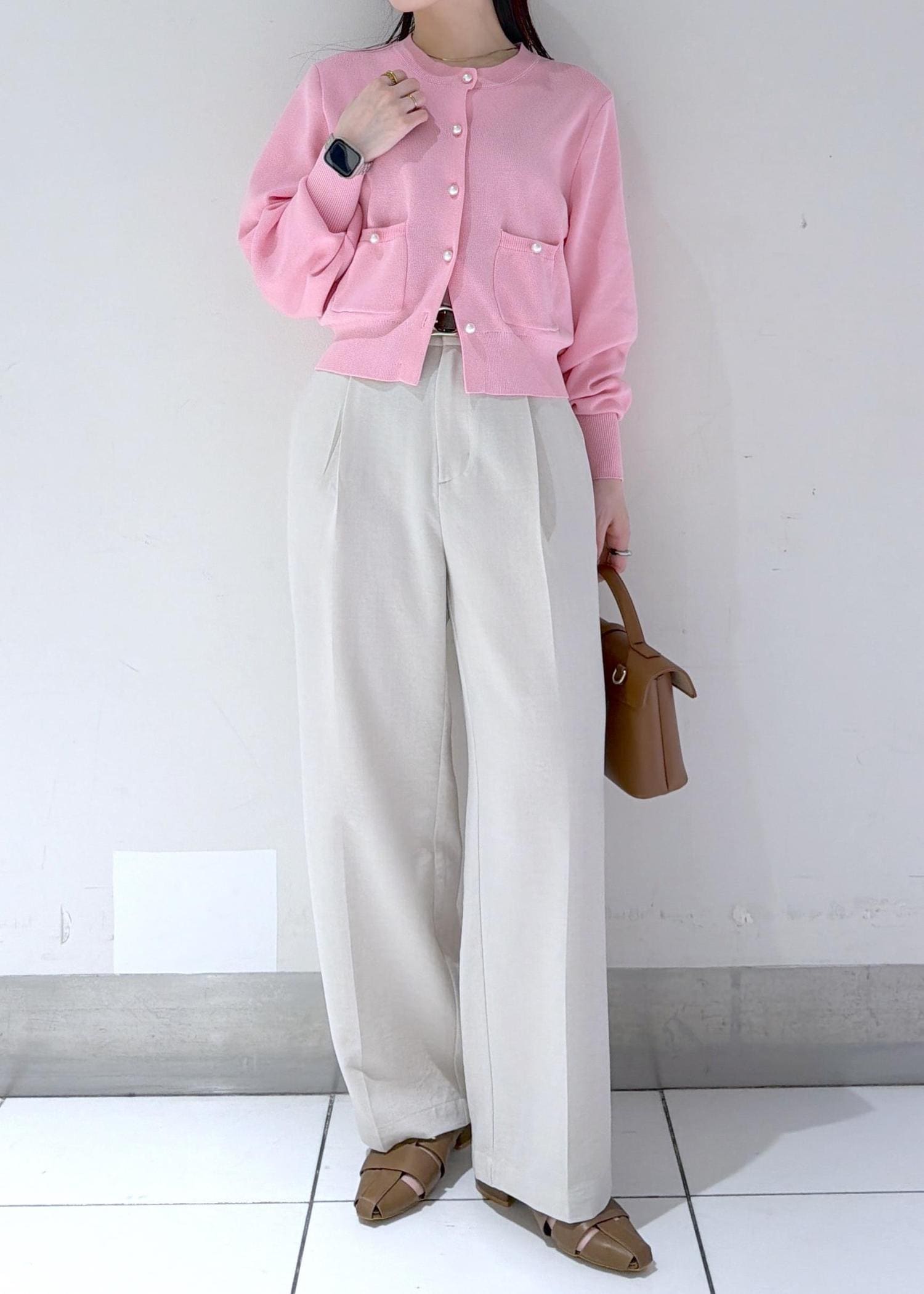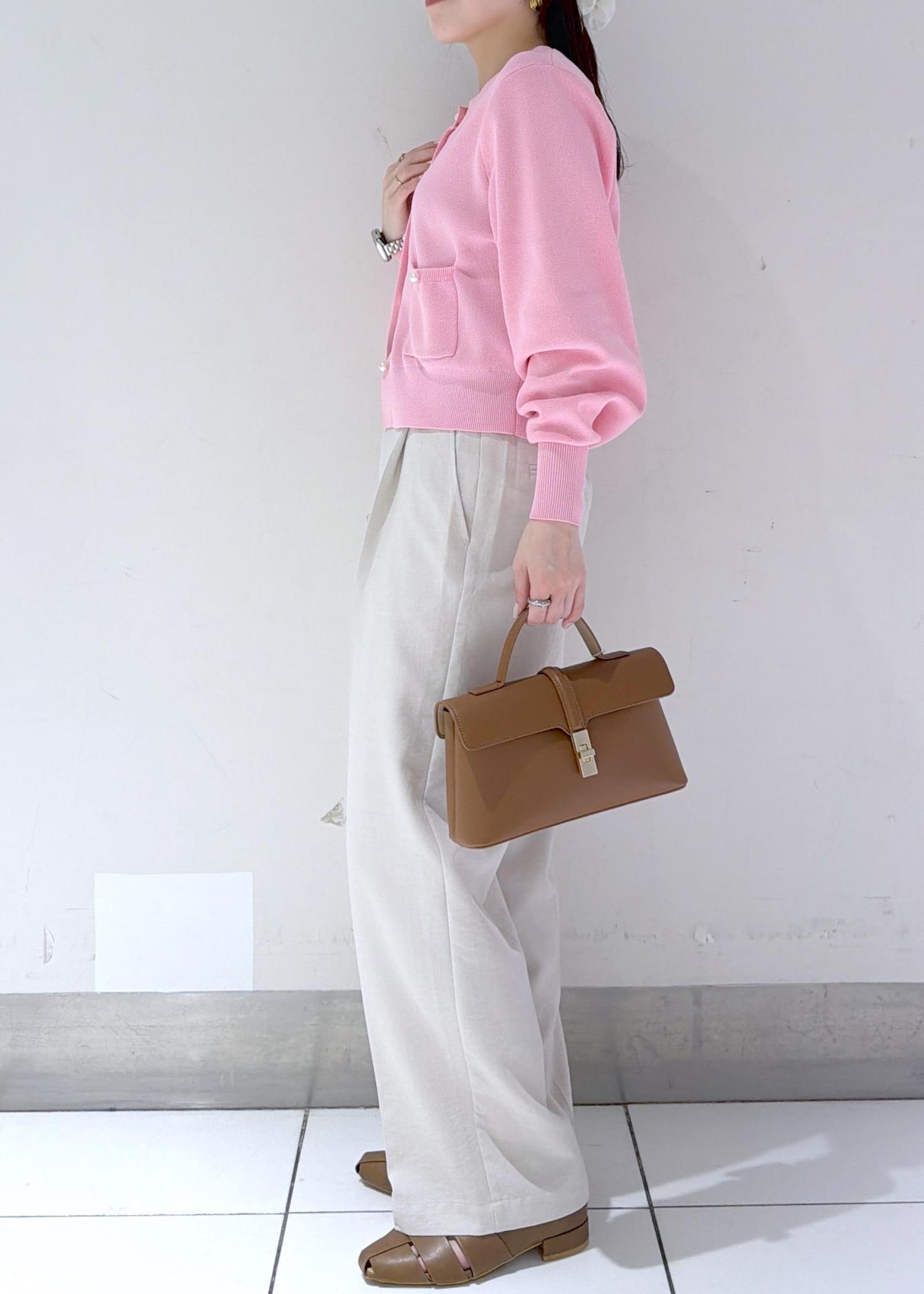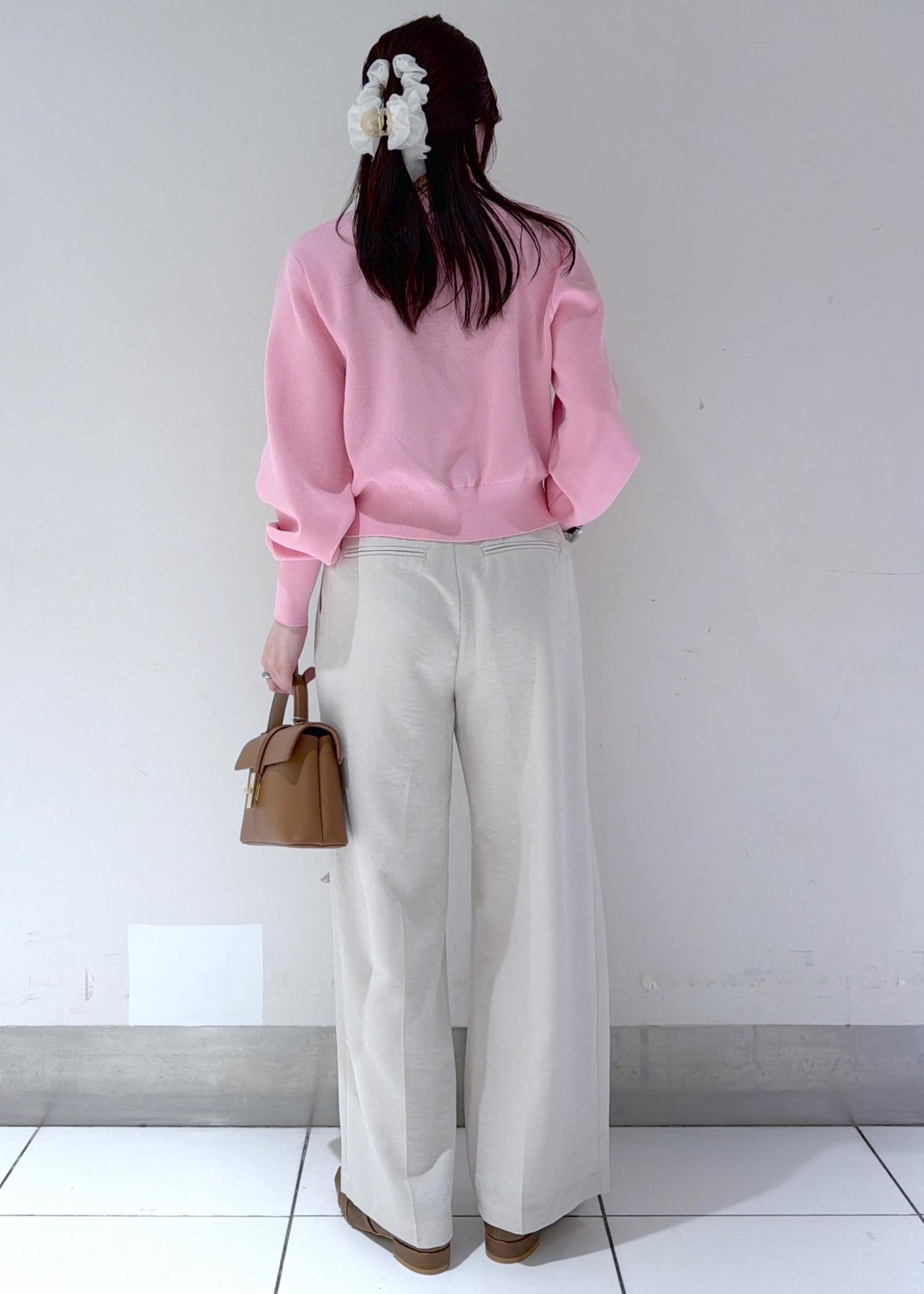 コンパクトなピンクカーディガンにワイドパンツを合わせたきれいめコーデ✨