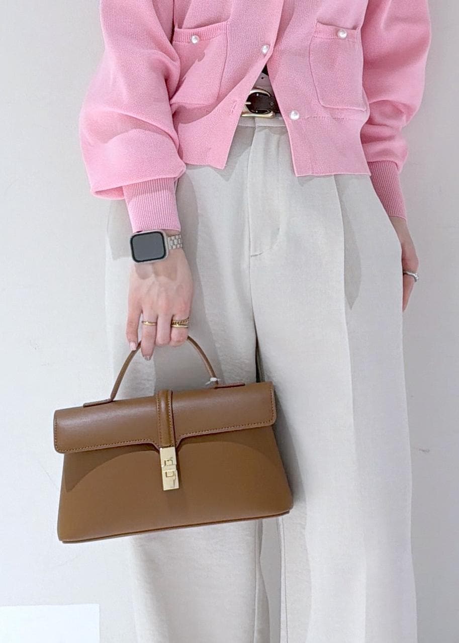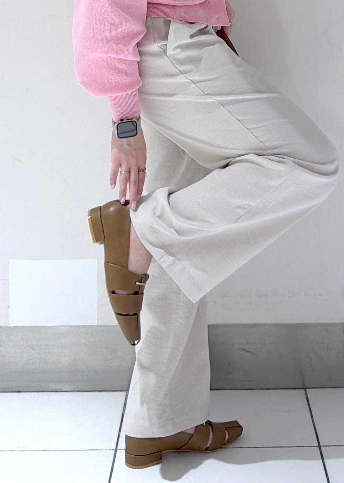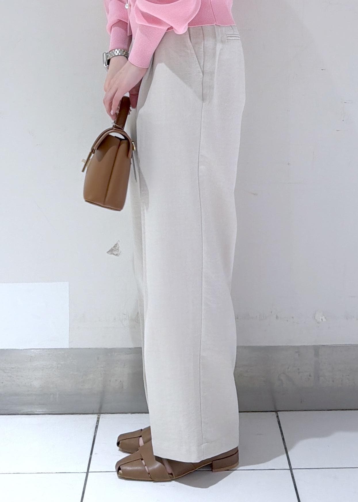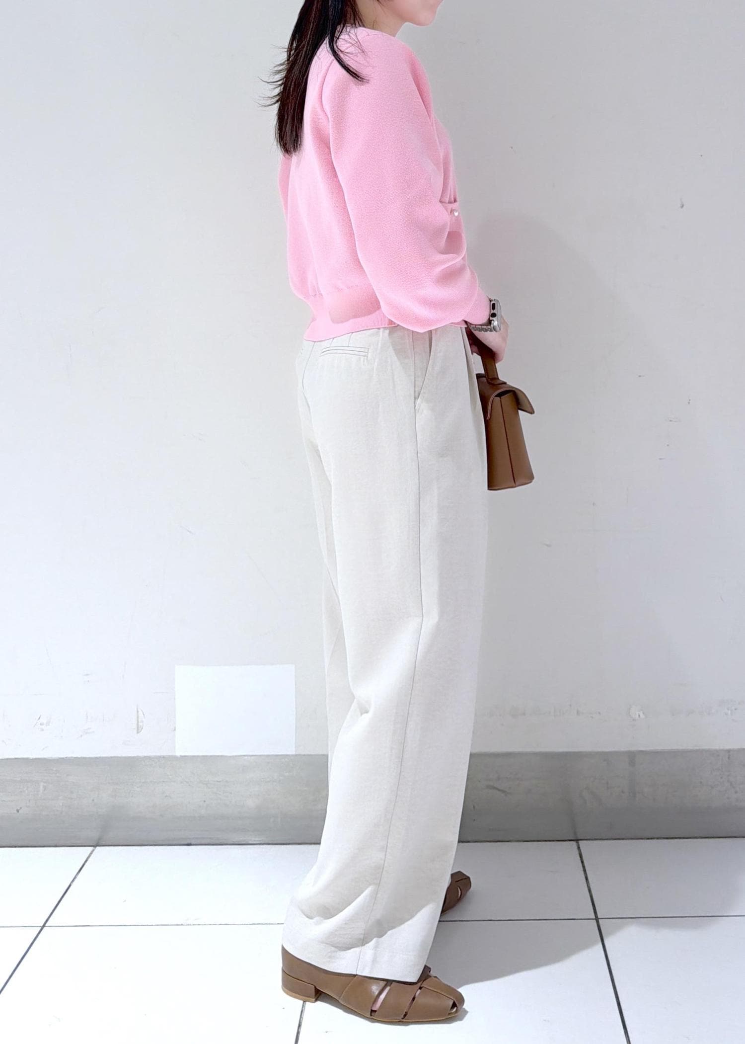 コンパクトなピンクカーディガンにワイドパンツを合わせたきれいめコーデ✨