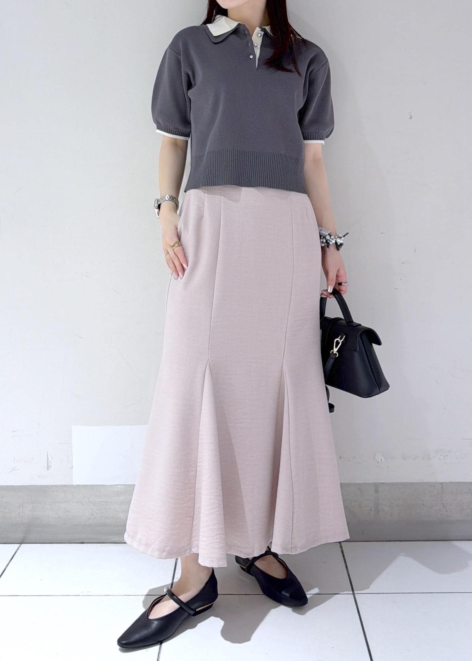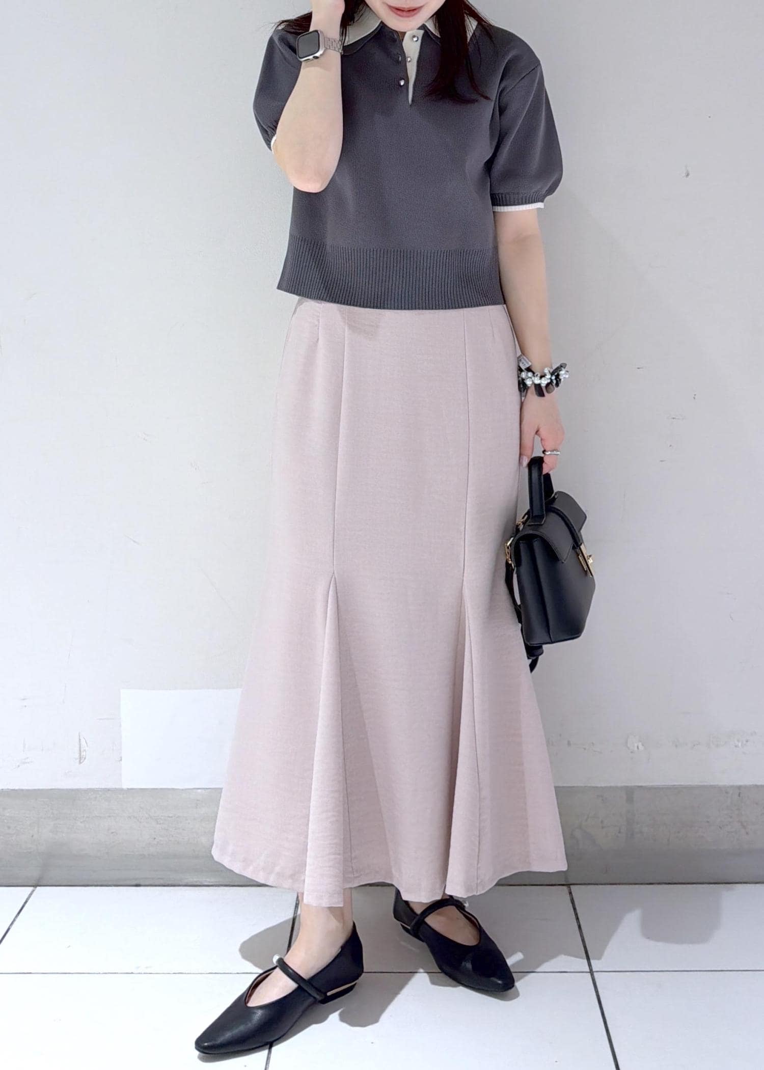コンパクトな配色襟ニットにマーメイドスカートを合わせたきれいめコーデ✨
