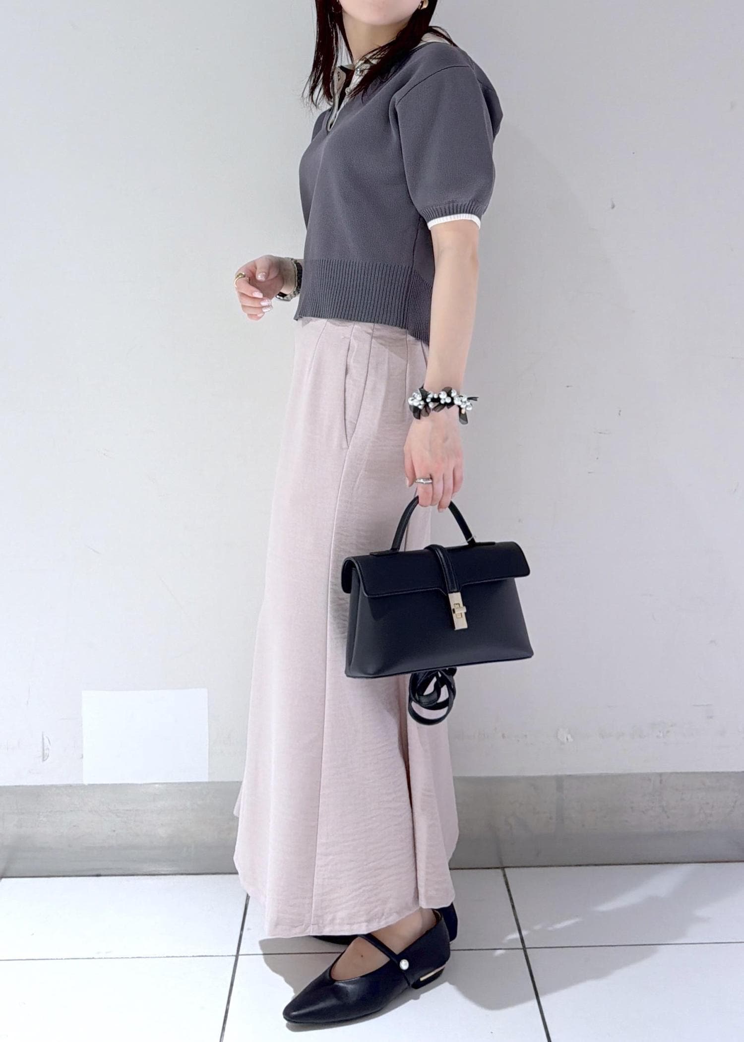 すっきりとしたトップスと広がりのあるシルエットのバランスで、スタイルアップ効果も◎