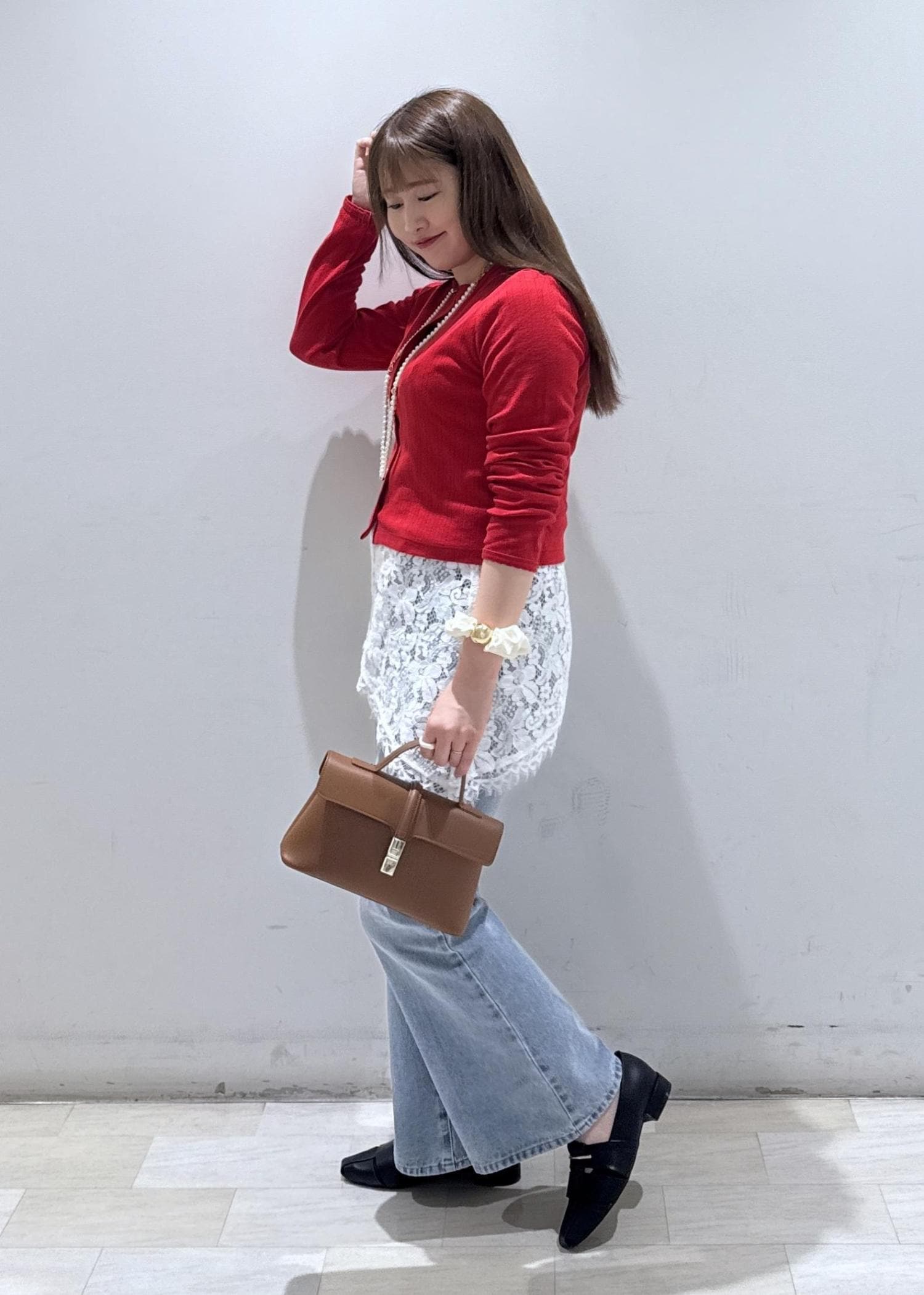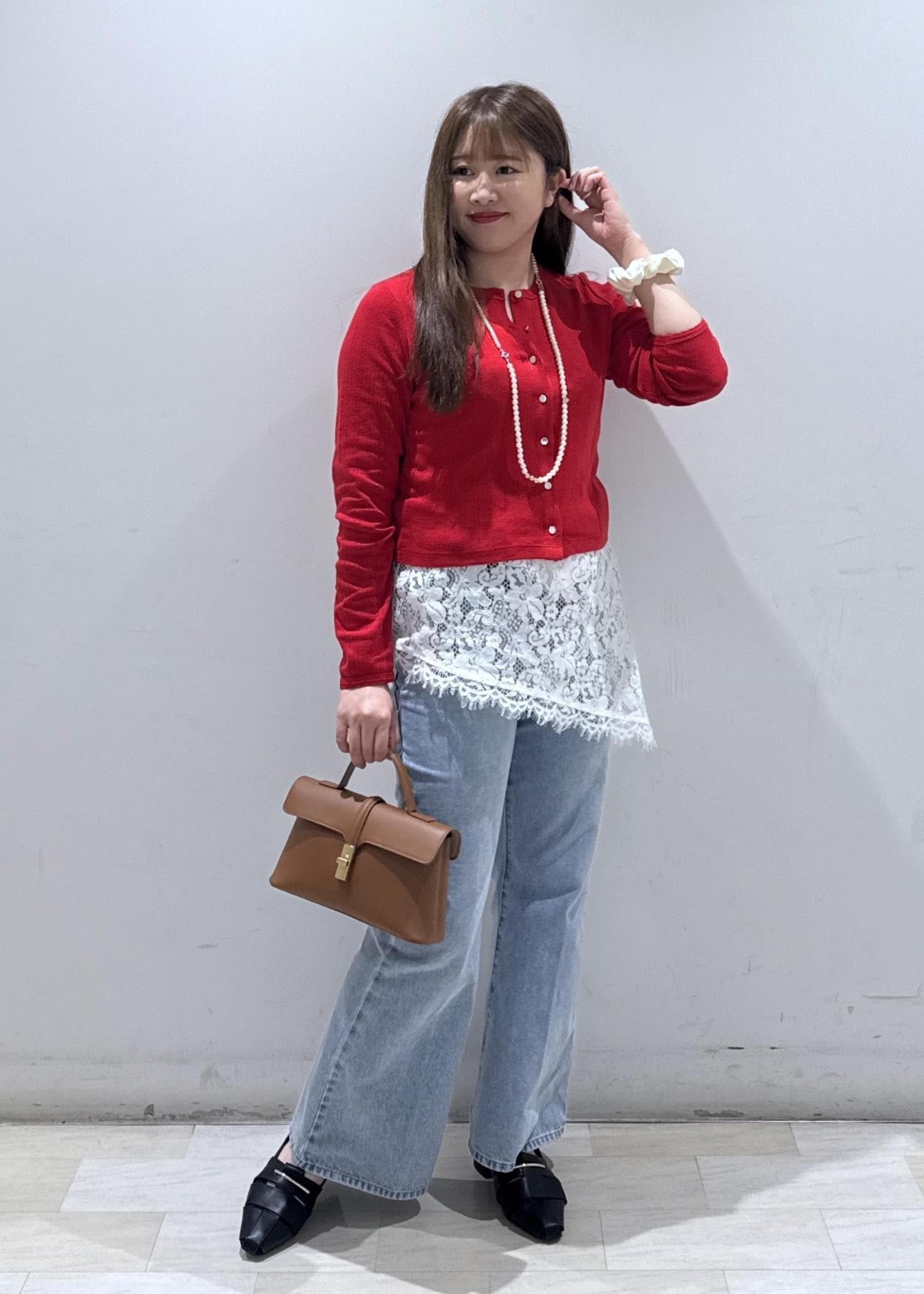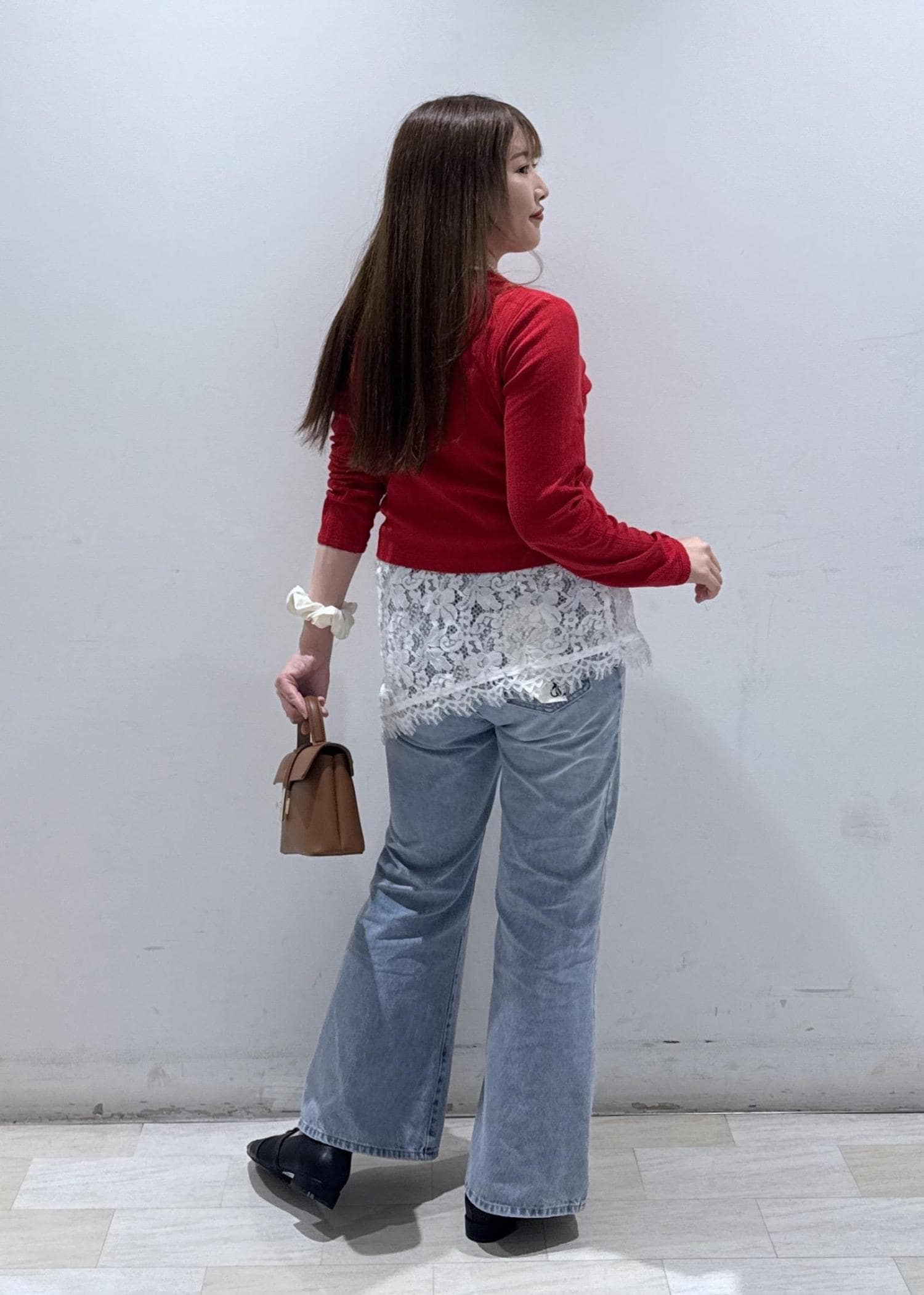今回は新作で入荷しました、赤のメッシュカーディガンにレースインナーをレイヤードしてデニムで合わせてカジュアルなスタイリングにしてみました。赤とデニムは間違いない組み合わせですが、中間に白を入れることでシンプルすぎずパッとより赤のカラーが目立つのでオススメです*