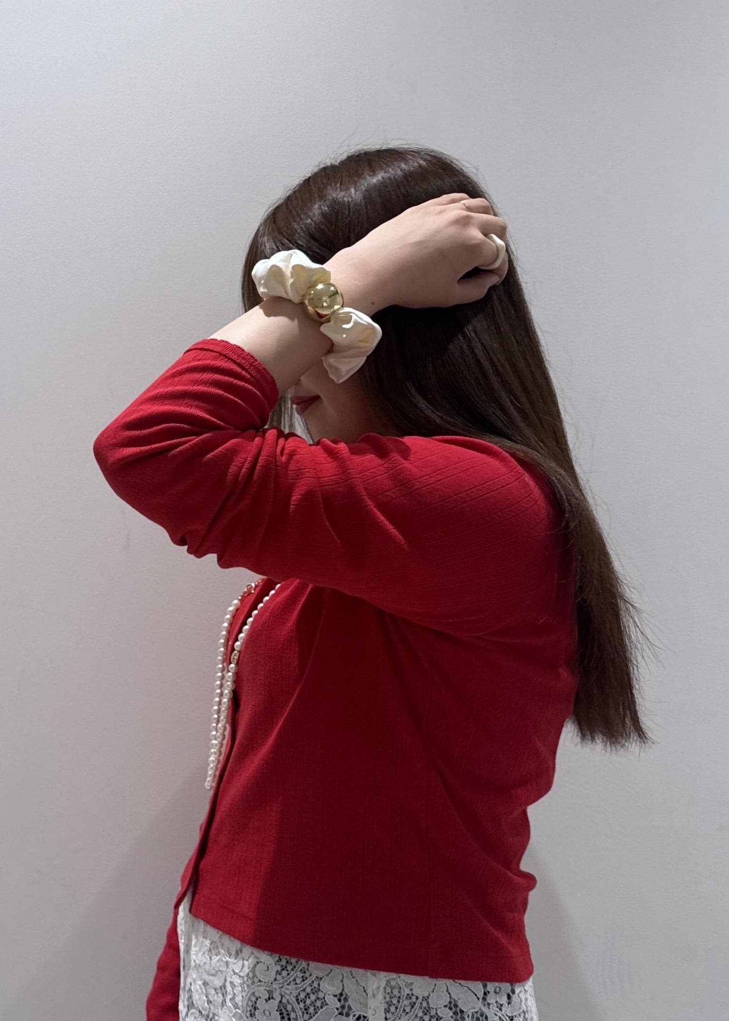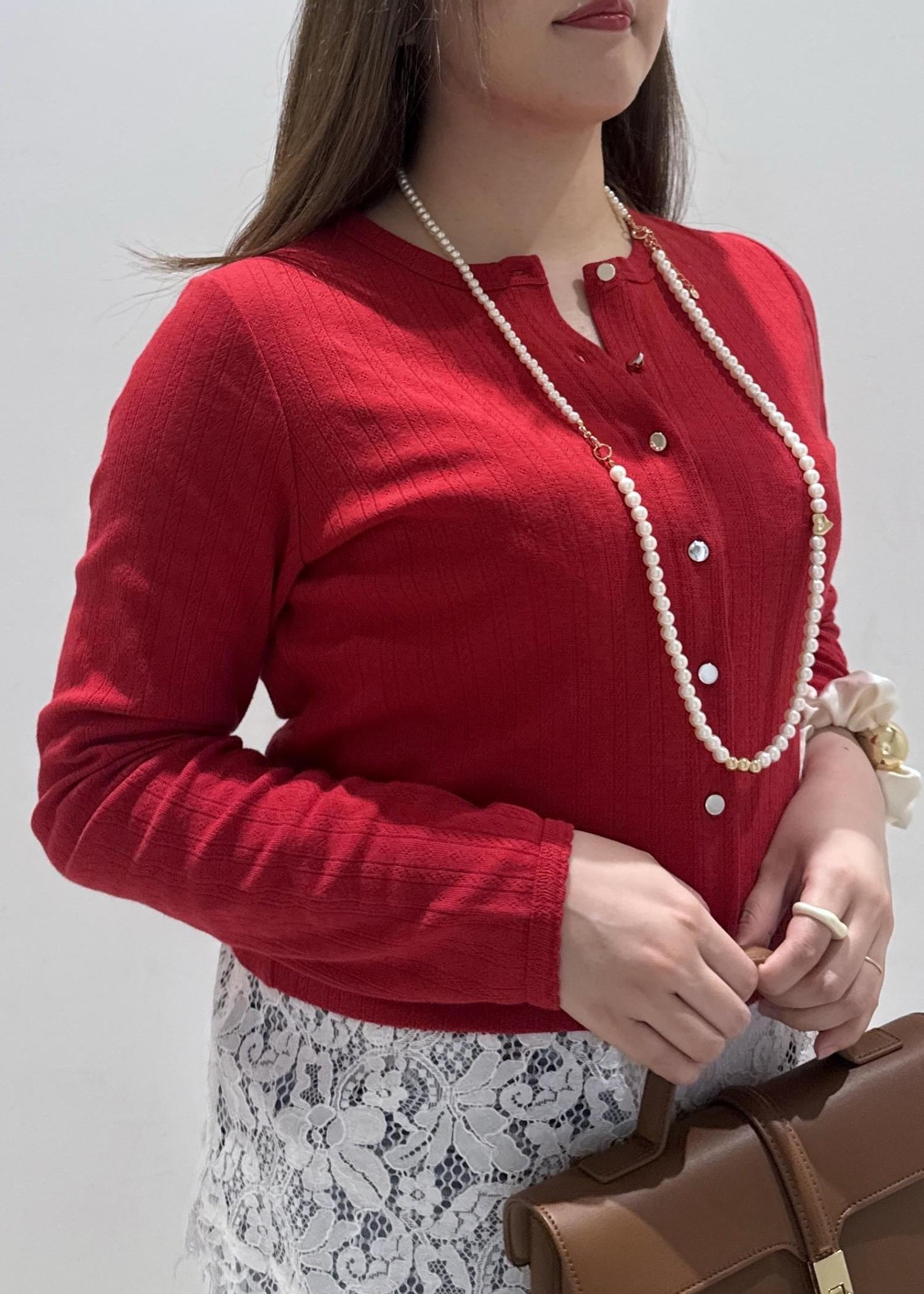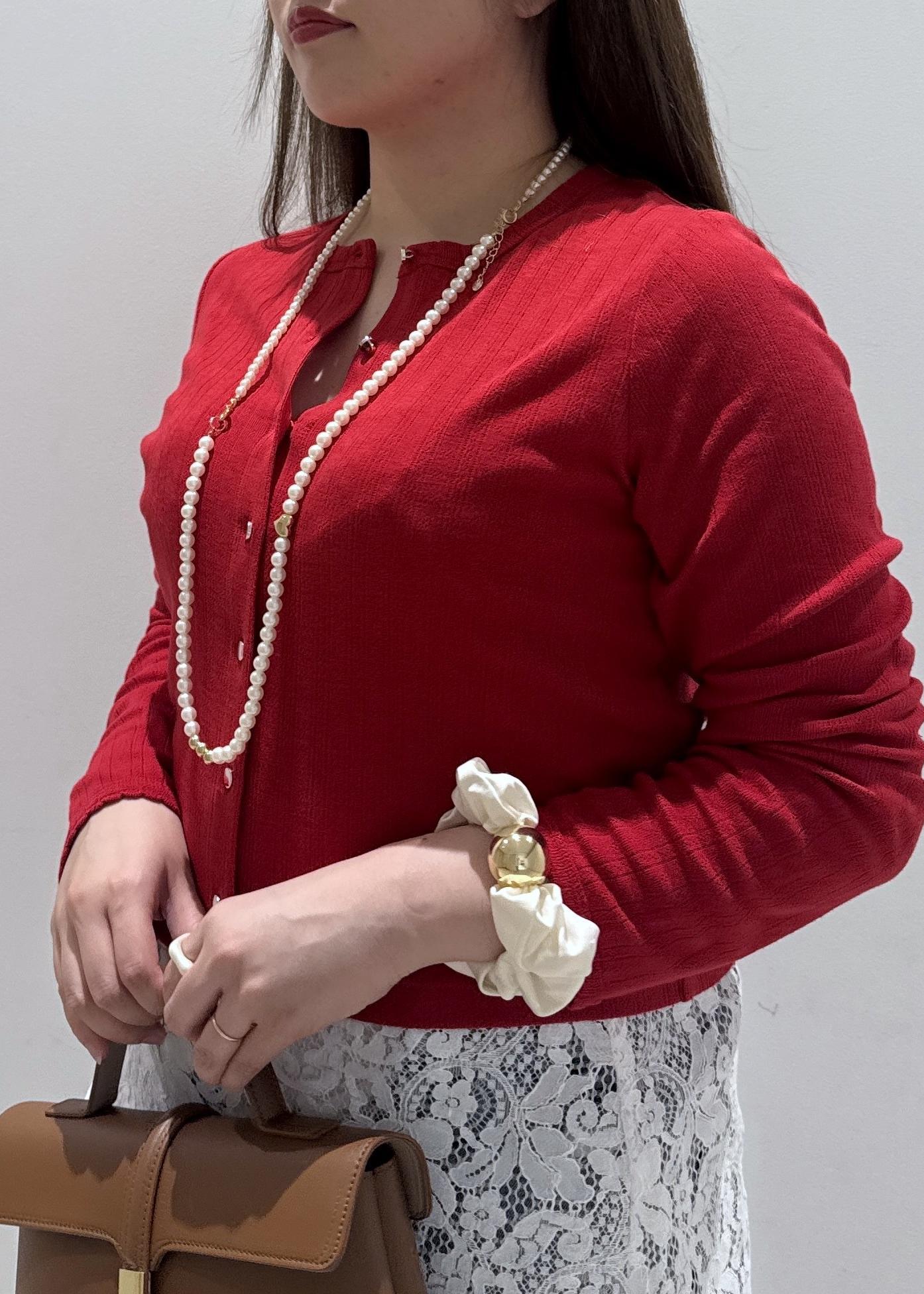 今回は新作で入荷しました、赤のメッシュカーディガンにレースインナーをレイヤードしてデニムで合わせてカジュアルなスタイリングにしてみました。赤とデニムは間違いない組み合わせですが、中間に白を入れることでシンプルすぎずパッとより赤のカラーが目立つのでオススメです*