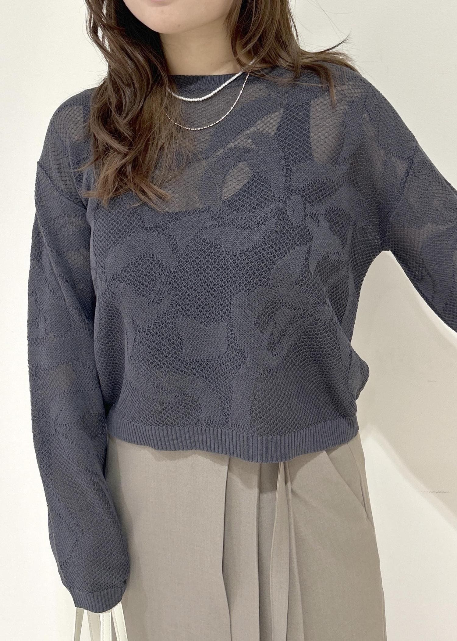 VISメッシュジャカードニットプルオーバー/イージーケアチャコール / F¥5,489レビューさりげないリボン柄が可愛いらしい透け感のあるニットアイテム