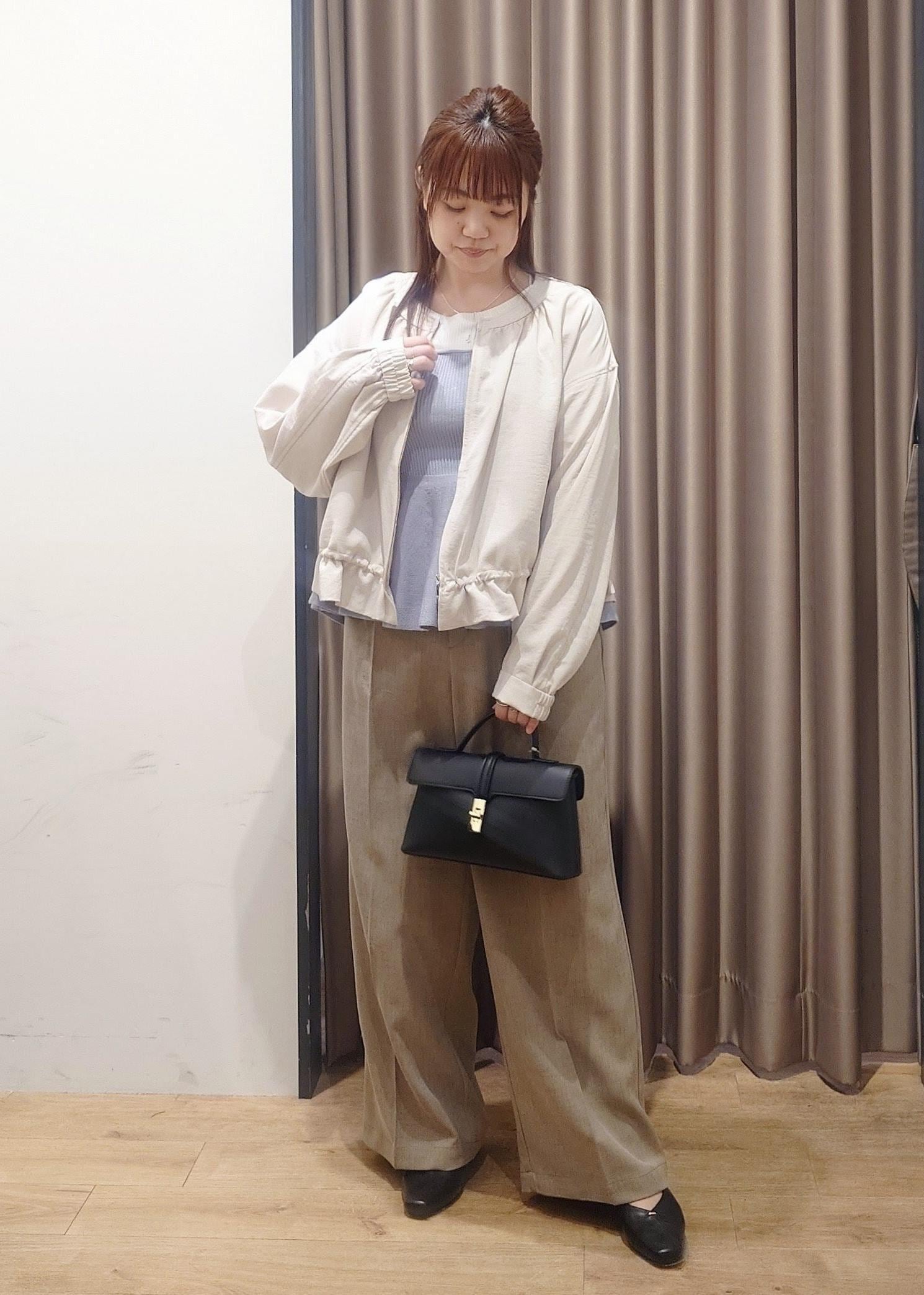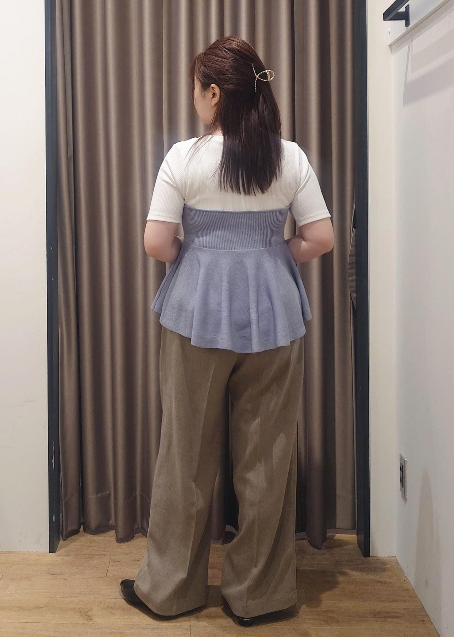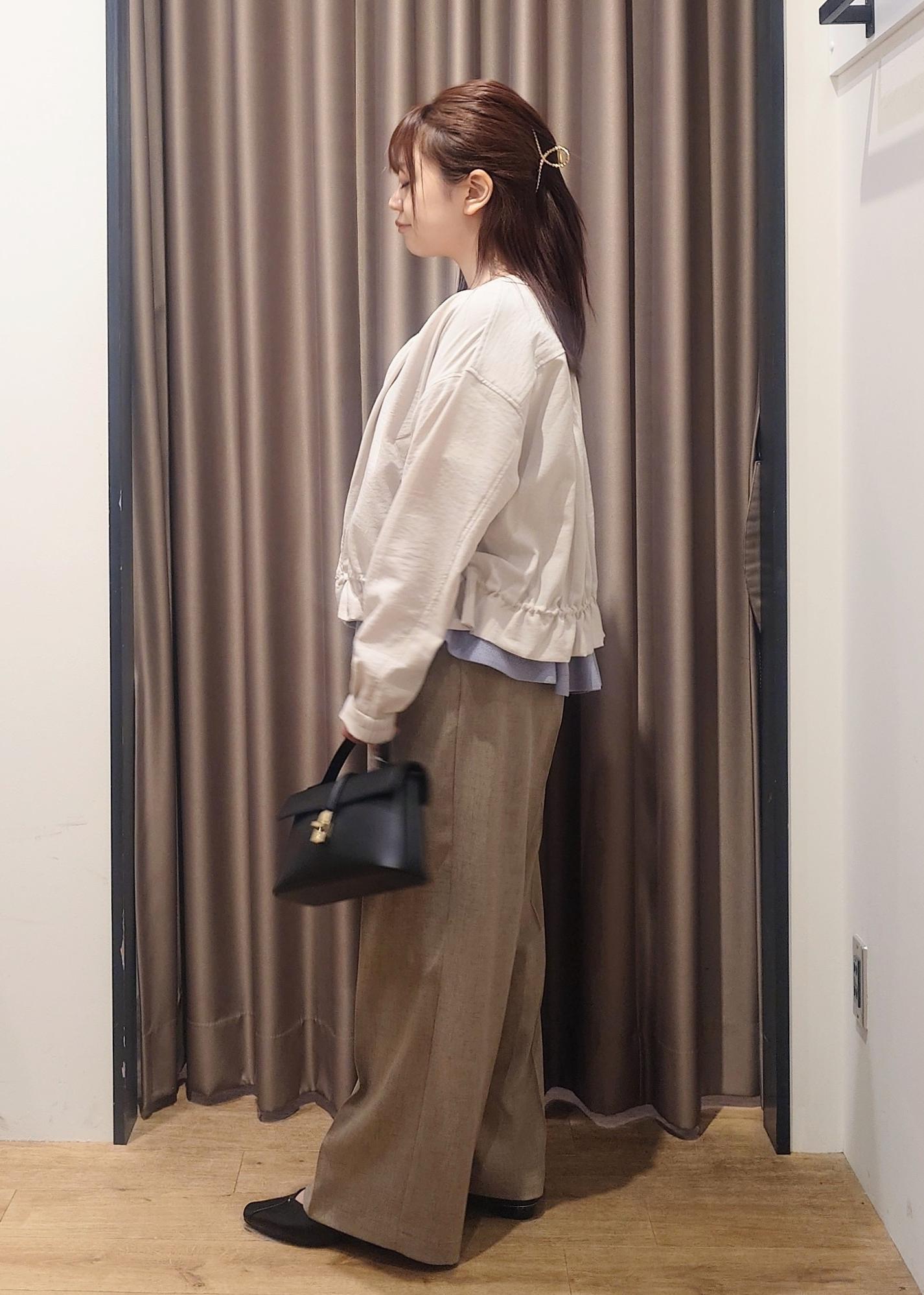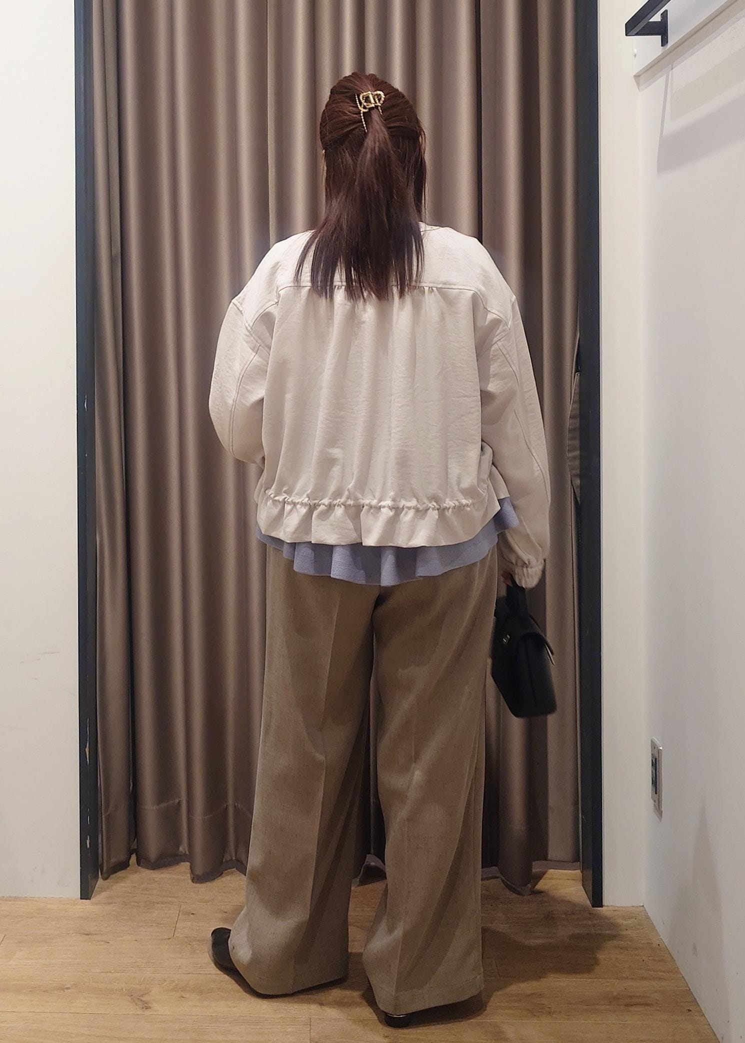 アウターを羽織ると後ろ姿がシンプルになりがちなので、インナートップスはあえて裾が少し見えるような丈感を選びました。