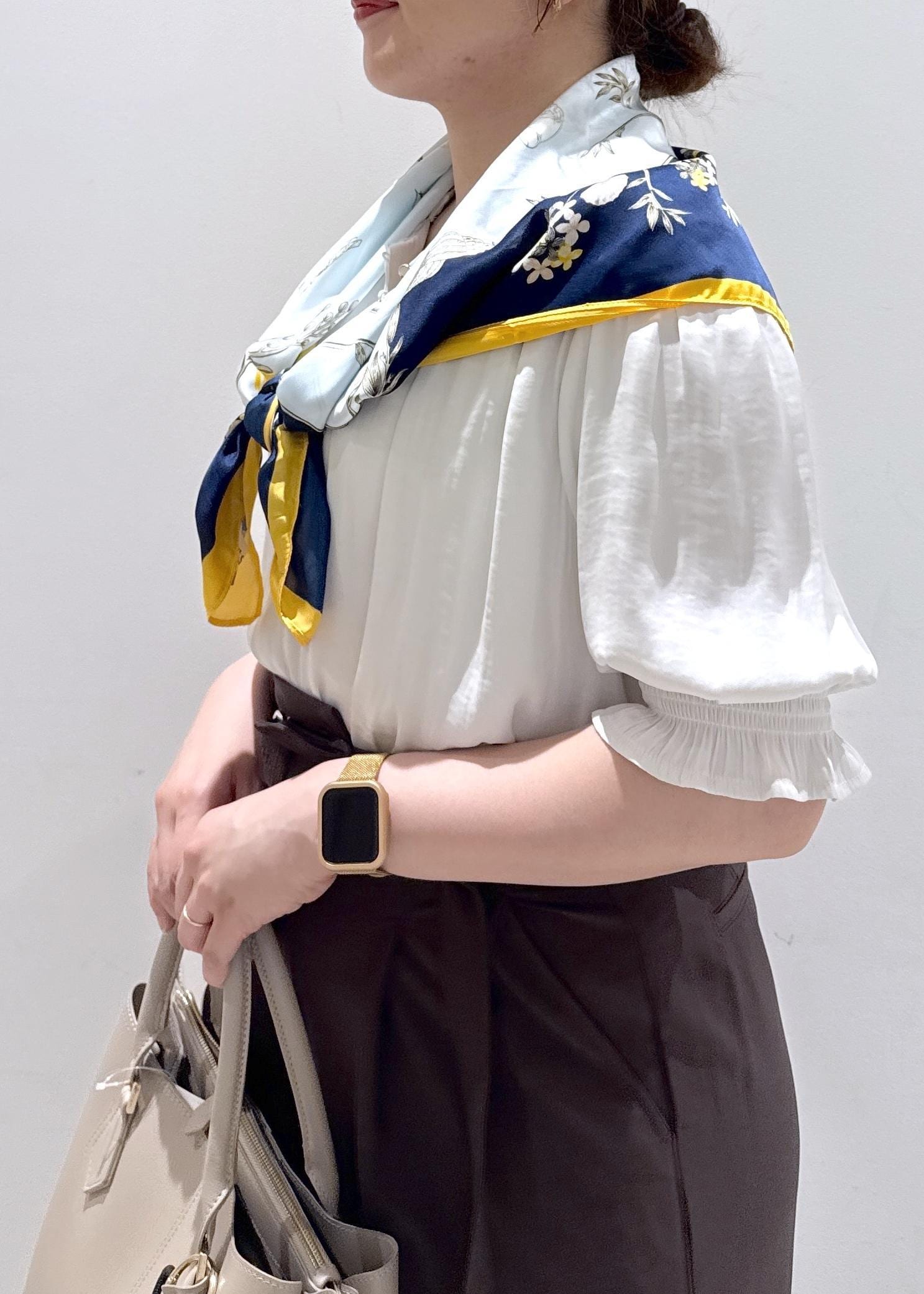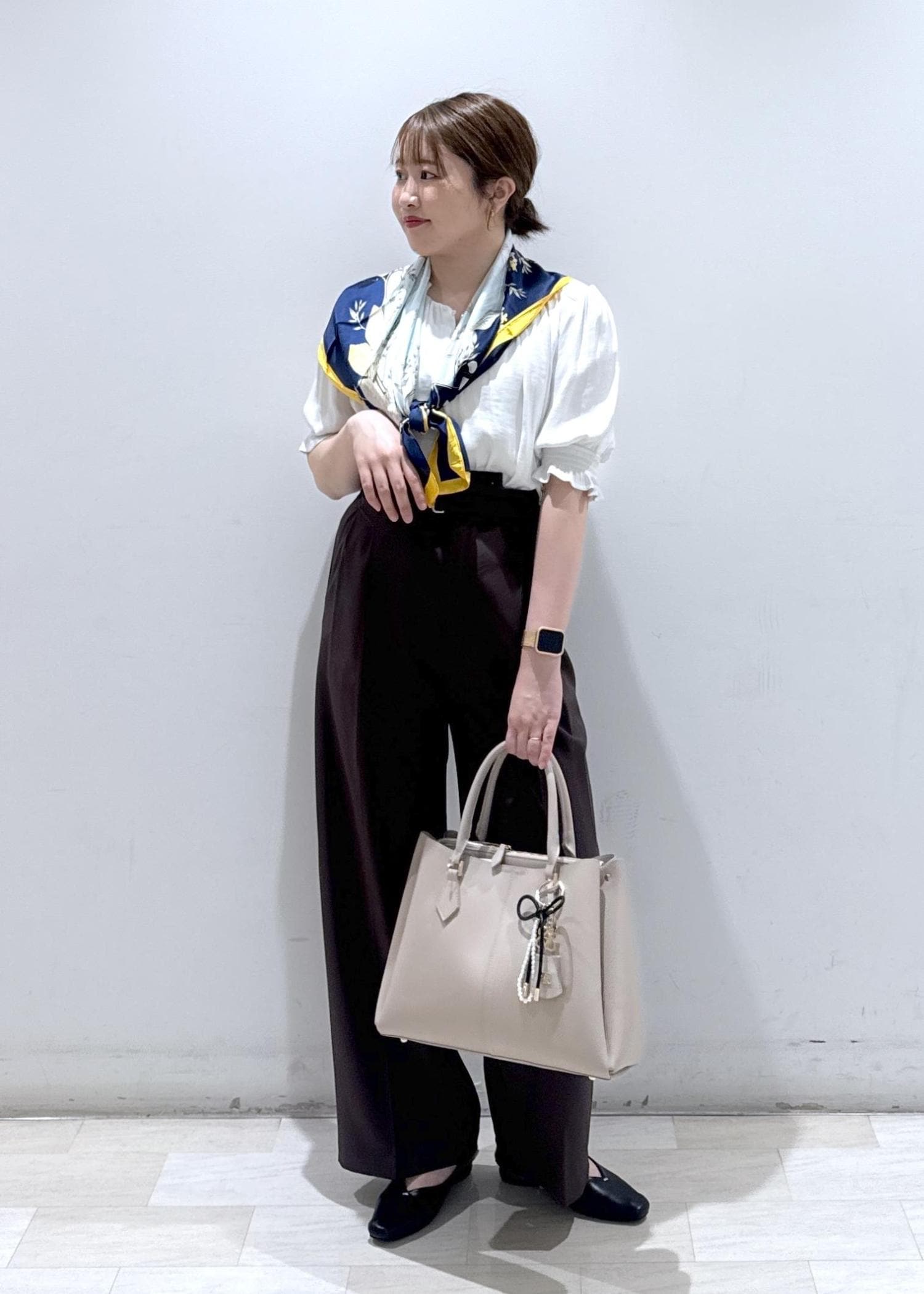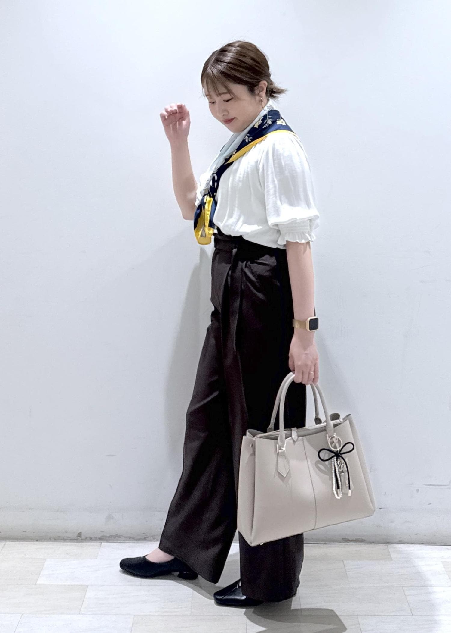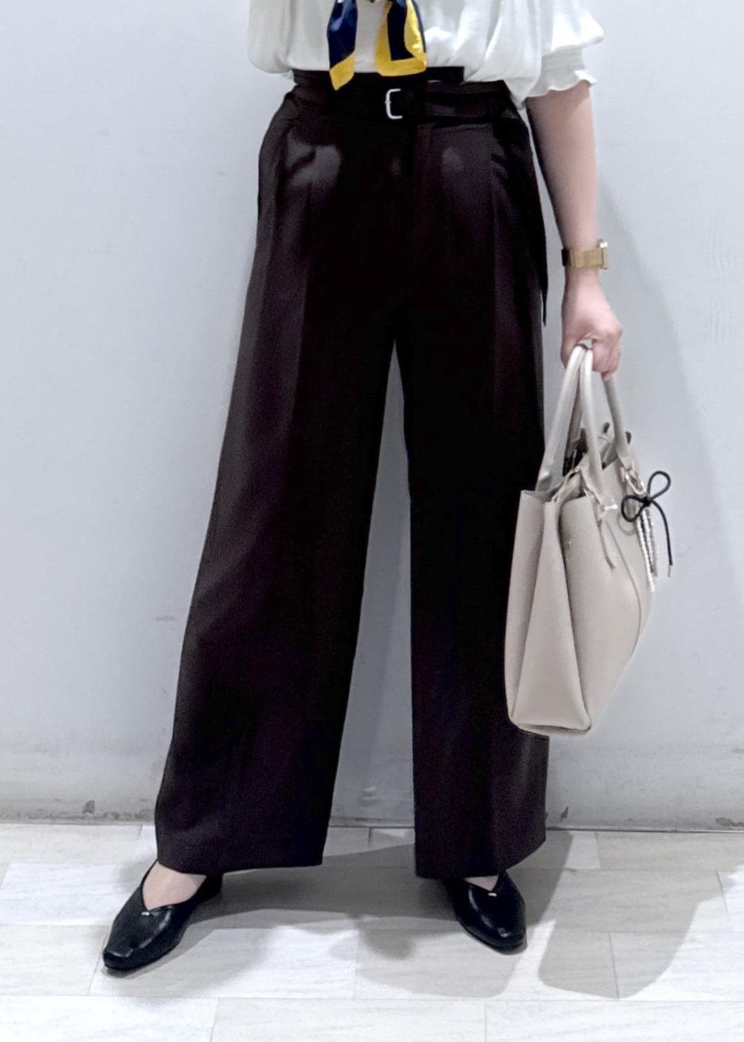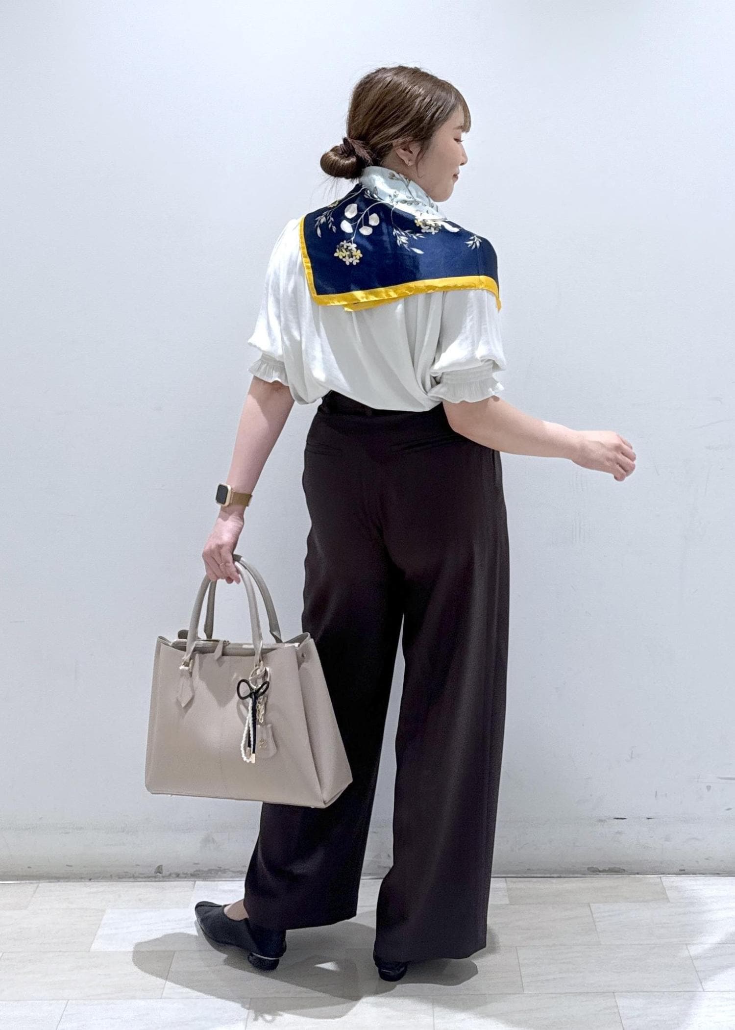 今回は新作で入荷しました、光沢感のあるエアリーサテンブラウスに、ディテールワイドパンツを合わせてお仕事で使える綺麗めなコーディネートにしてみました♪