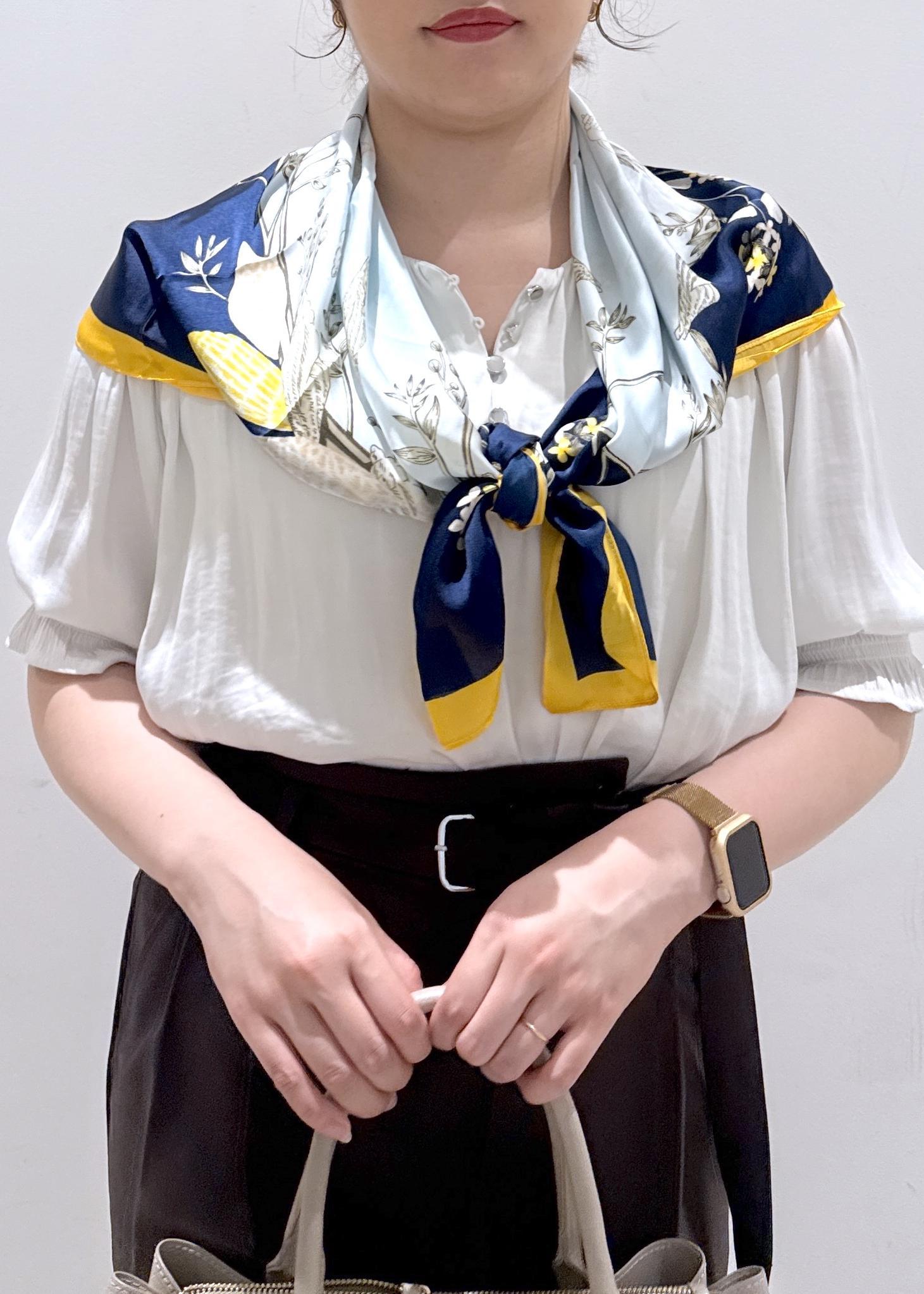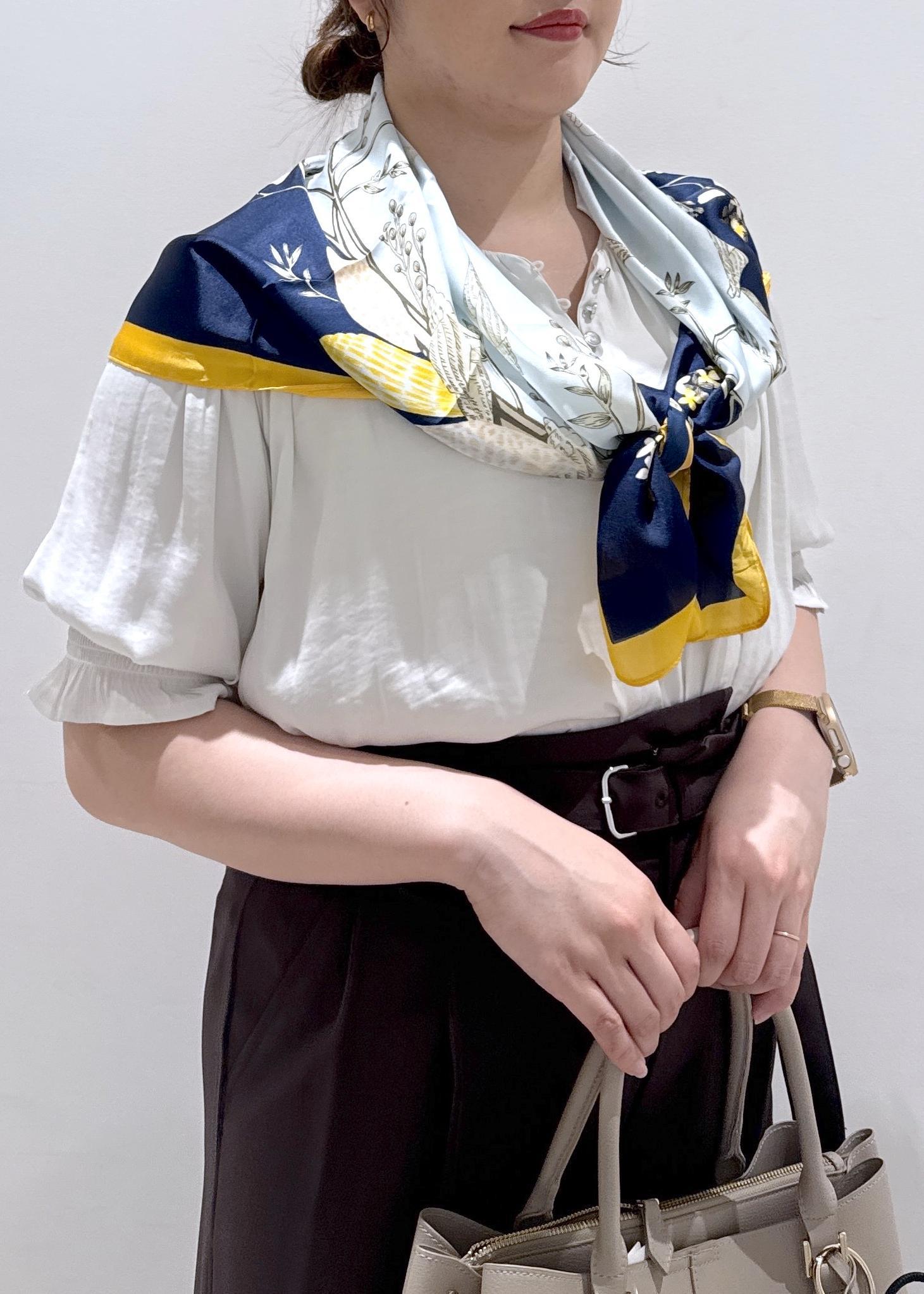 VISアソート柄スカーフ 90cmネイビー系 / F¥2,189レビュー90cmの正方形大判ストール。サラッとしたポリエステルの素材に色違いで柄が違うので可愛いです。大きめなサイズではあるので、肩にかけたり腰に巻いても余裕があり使いやすいです◎