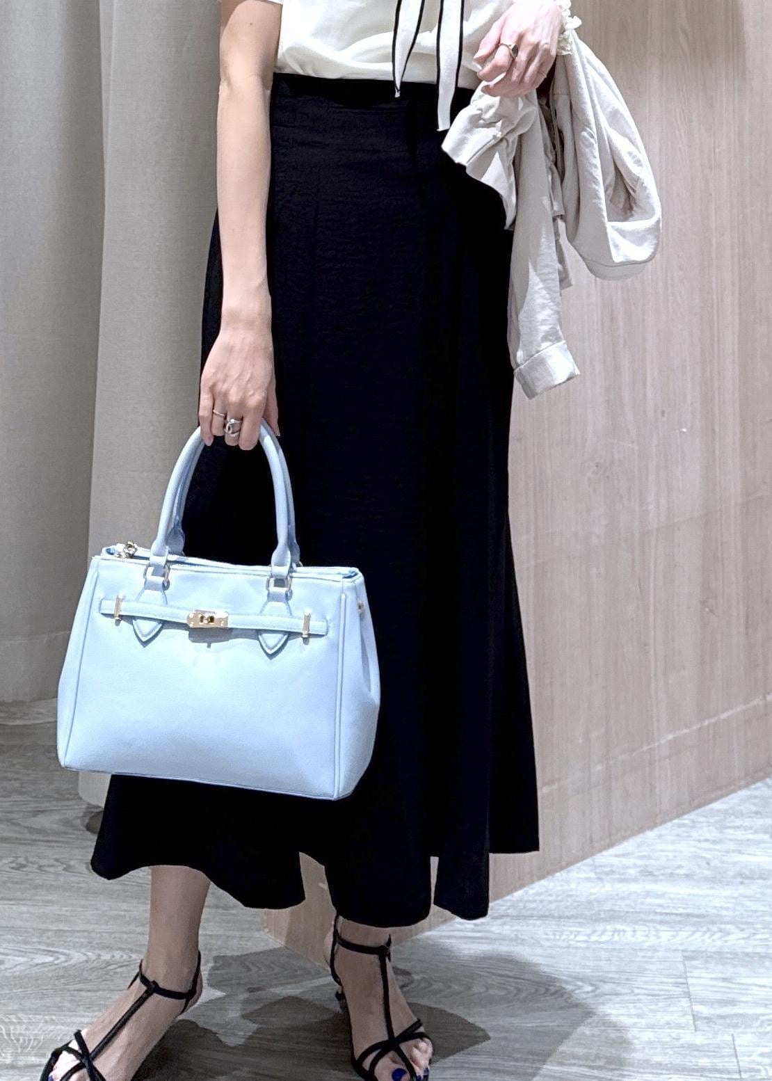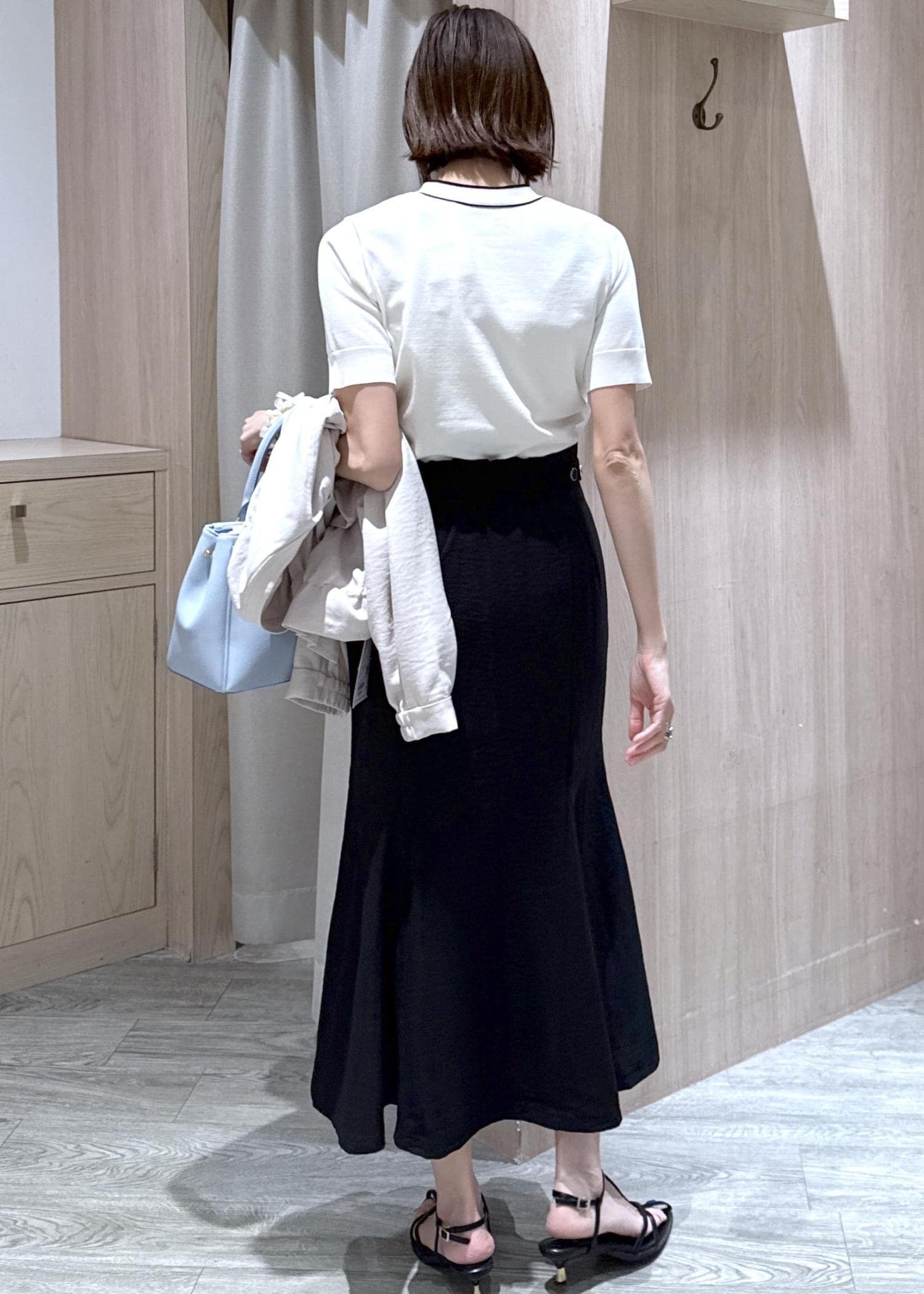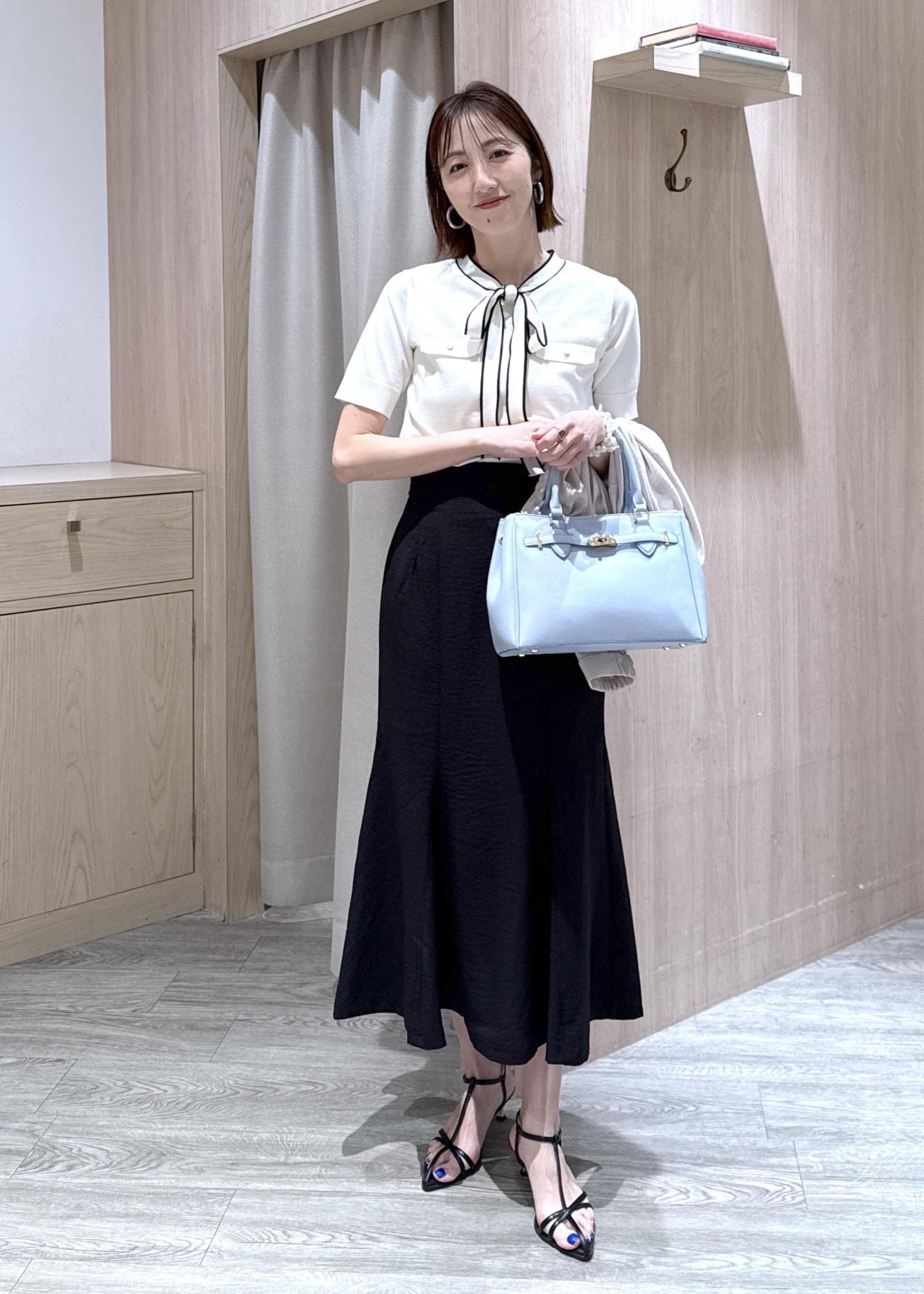 ボウタイニットにマーメイドスカートを合わせた、ON/OFF使えるキレイめコーデです☆