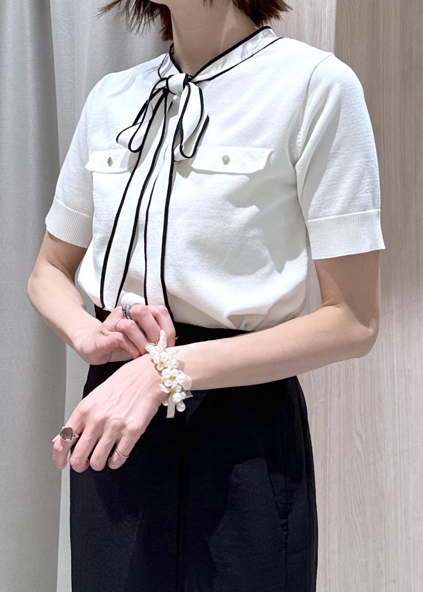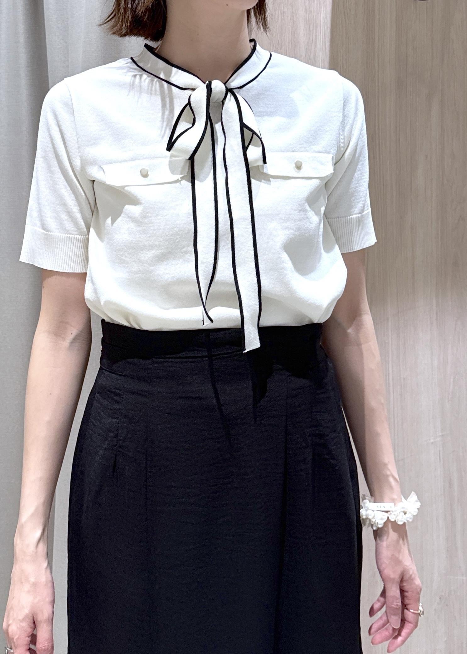 襟元がボウタイになっているニットなので、これ一枚でもジャケット等のインナーとしても重宝します! -