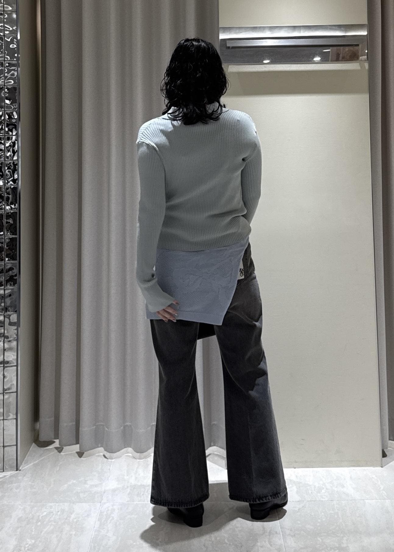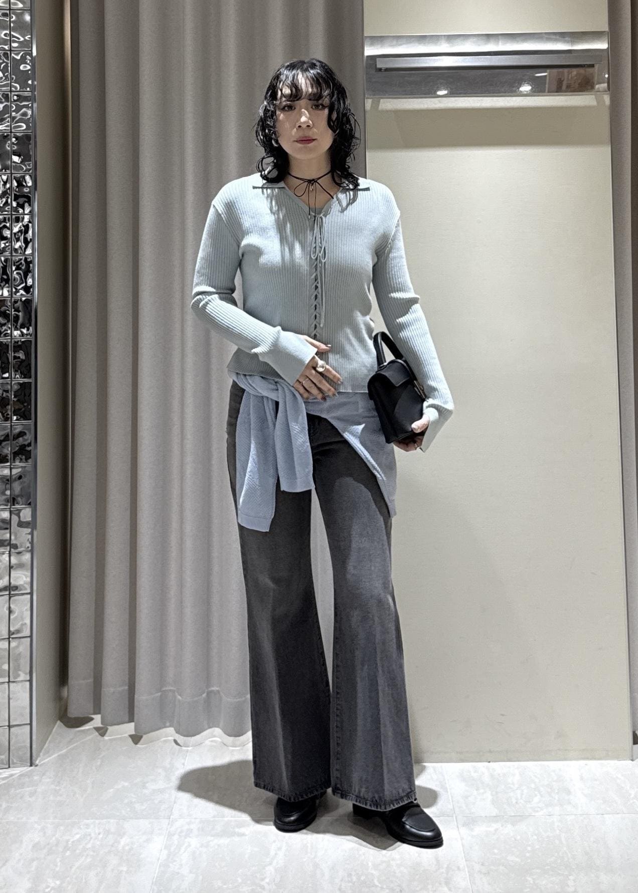 爽やかなブルーコーデ。鍵あみニットを腰巻きしてブルーを多めにしてみました♪