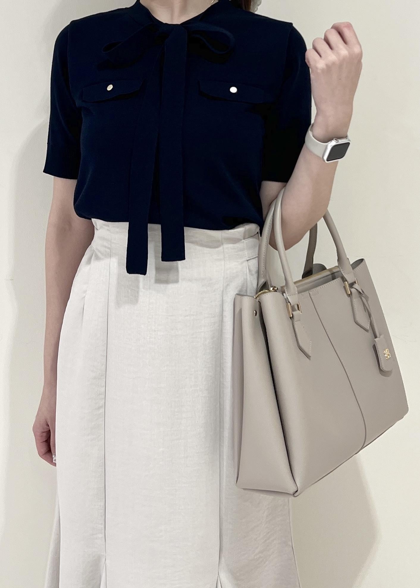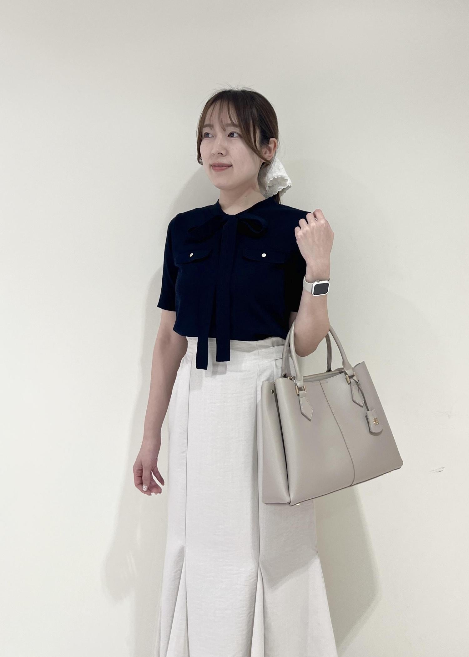 VISリボン付き半袖ニットプルオーバー/イージーケアネイビー / F¥5,489レビュー程よくゆとりのあるサイズ感です!着丈は腰にかかるくらいで、長すぎず短すぎず◎どんなボトムにも合わせやすい着丈でした。