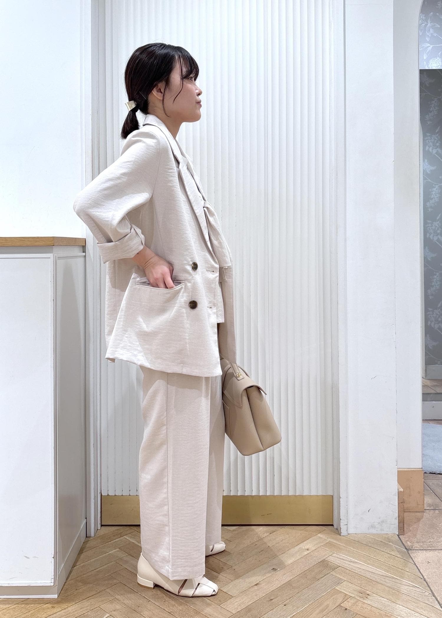 VIS美easyリネンライクテーラードジャケット/イージーケア・接触冷感・セットアップ対応キナリ / S¥7,909レビュー身長153cm Sサイズ着用。