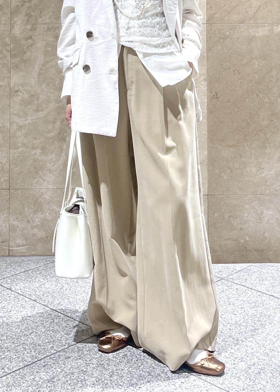 VISツータックワイドパンツ/イージーケアベージュ系 / M¥6,920レビュー身長158cm、普段Mサイズを着用しており、こちらもMサイズで着丈はゆるっと床につくぐらいの長め丈。