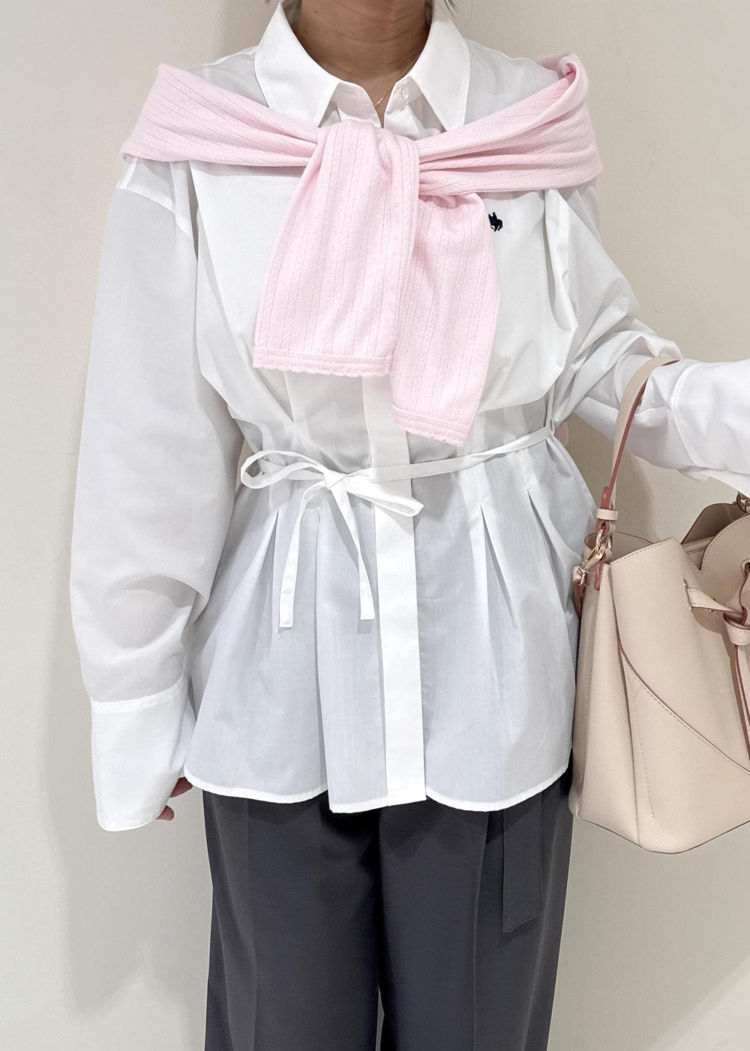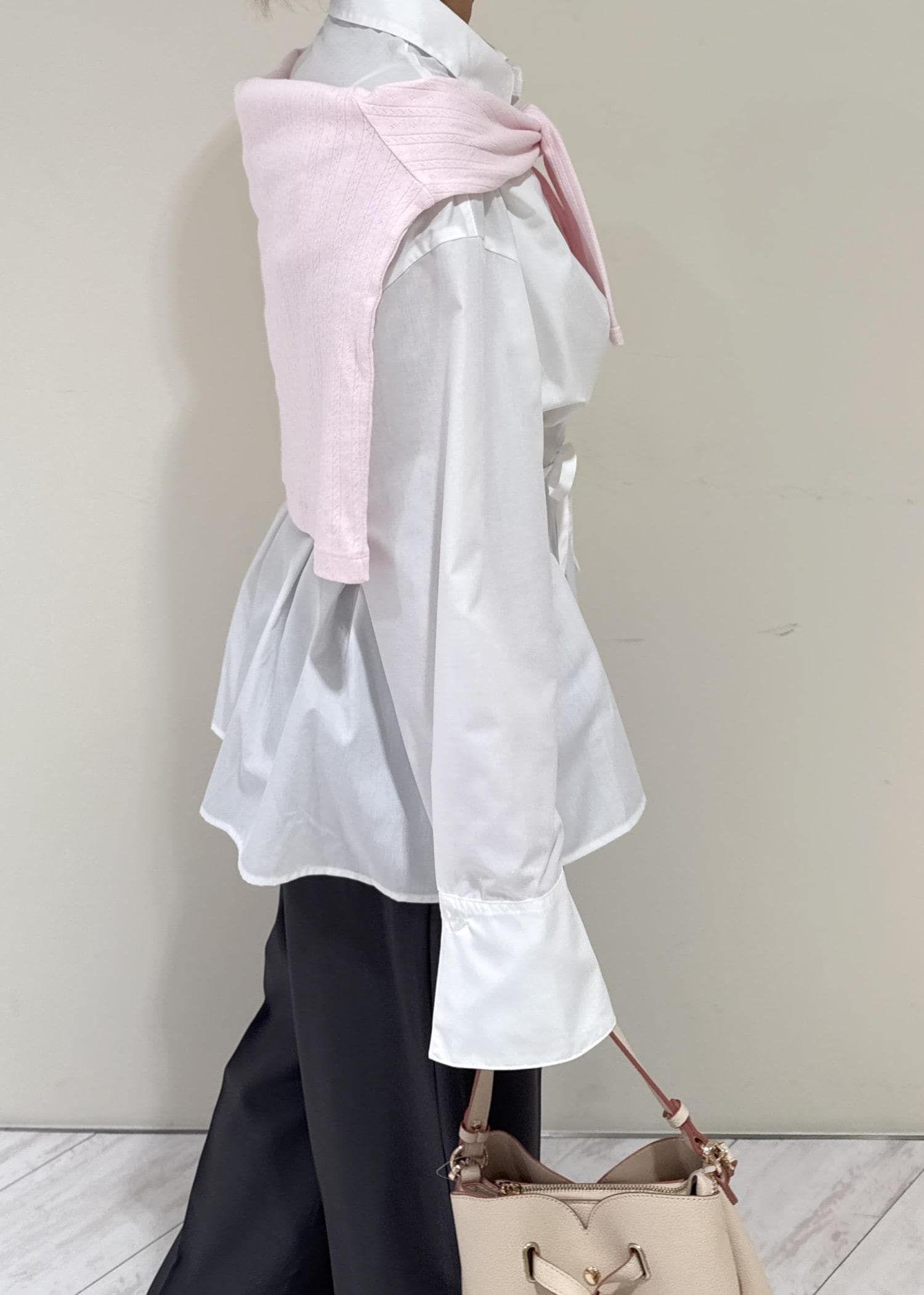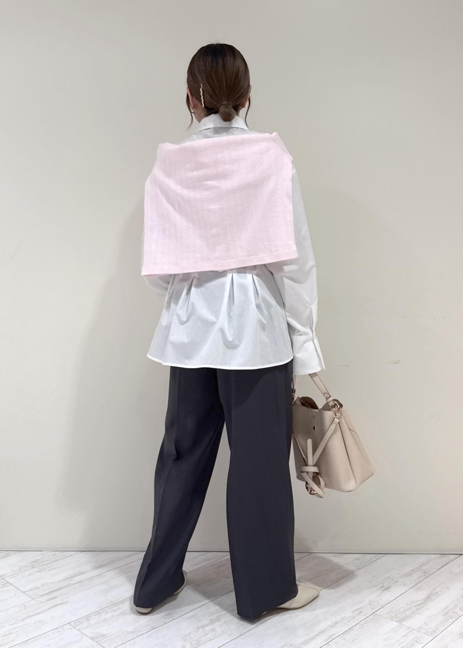 白のシャツにグレーのパンツを合わせたシンプルなコーディネートですが、ピンクのカーディガンを肩掛けし、春らしさをプラスするよう意識しました♩
