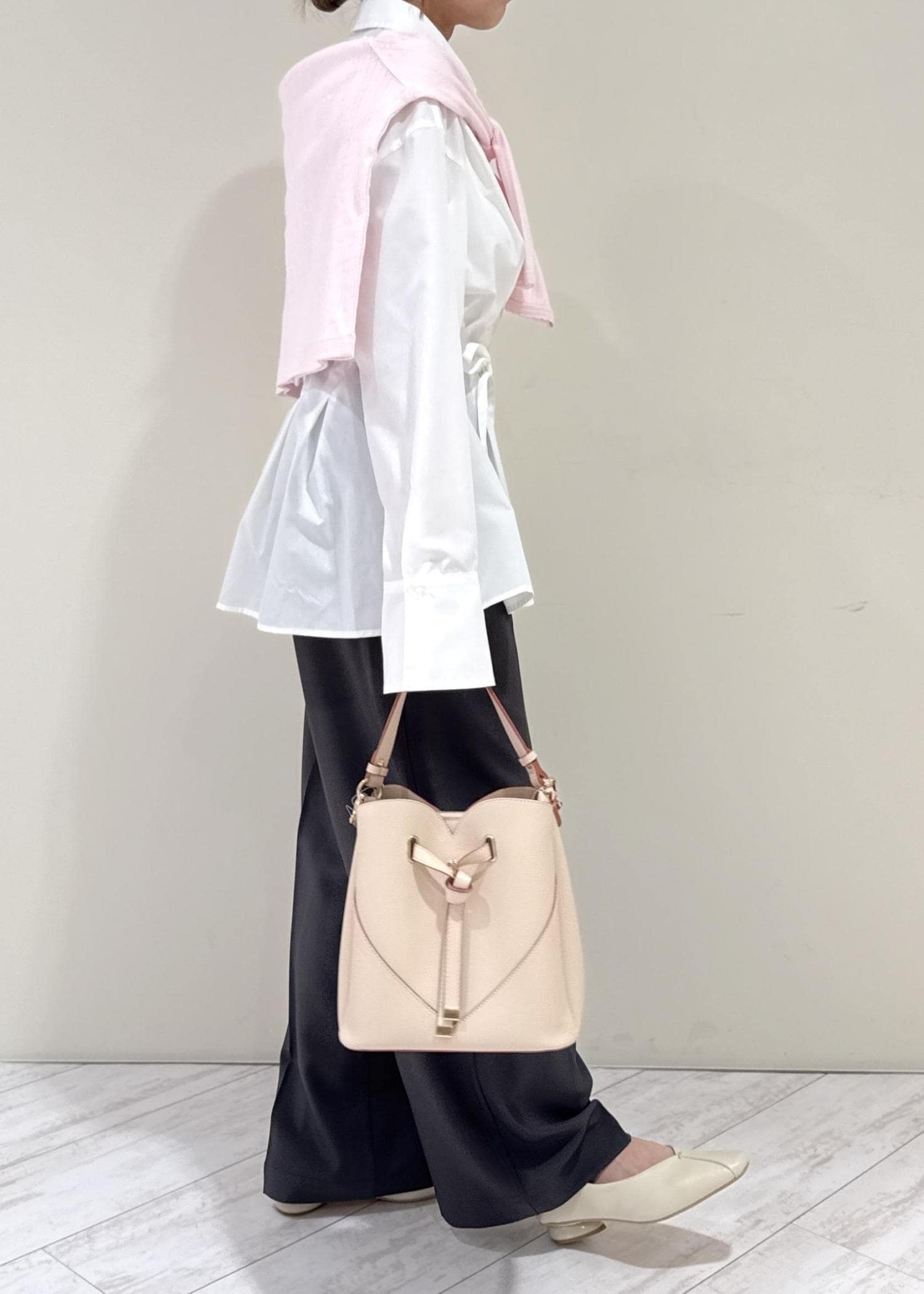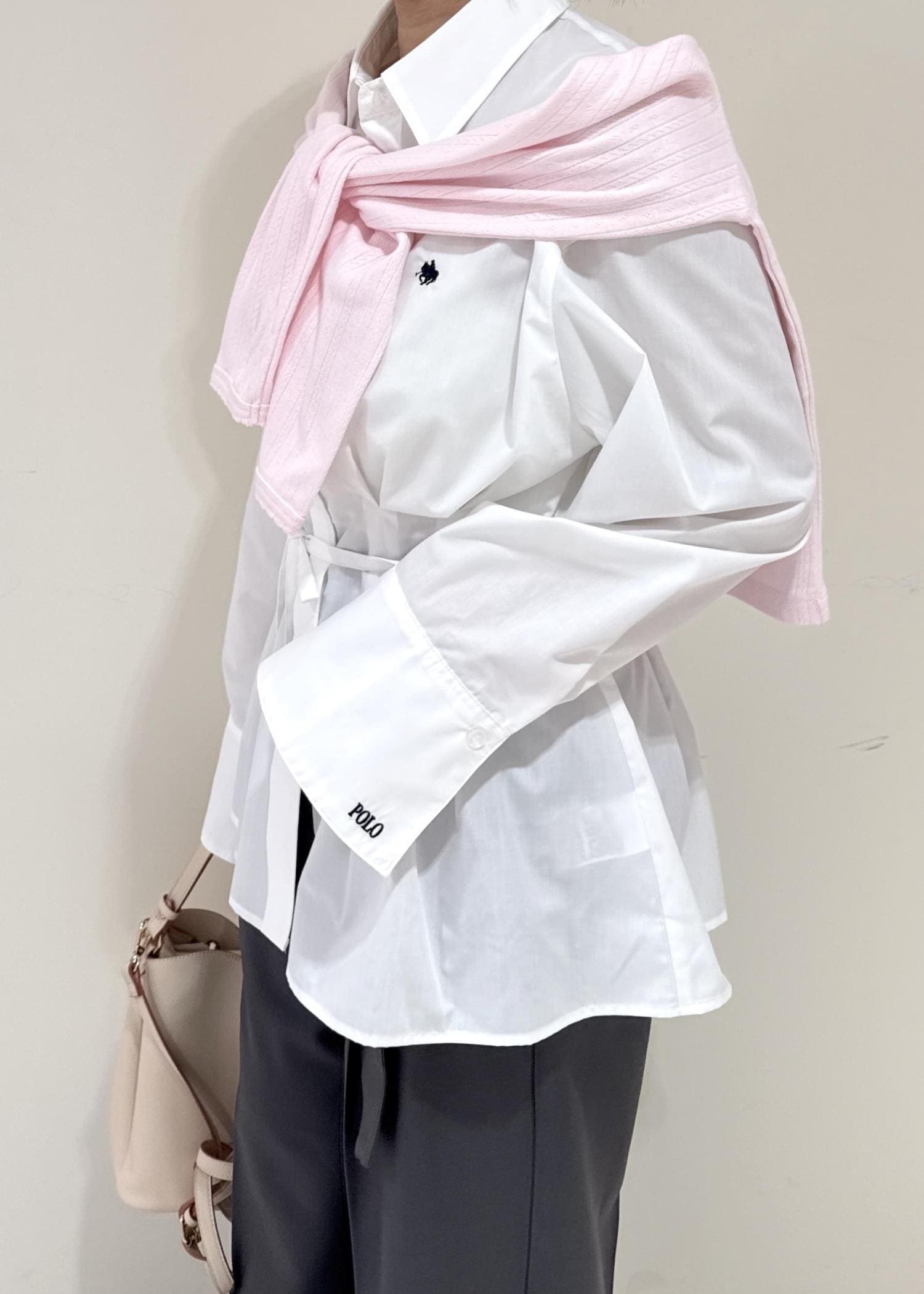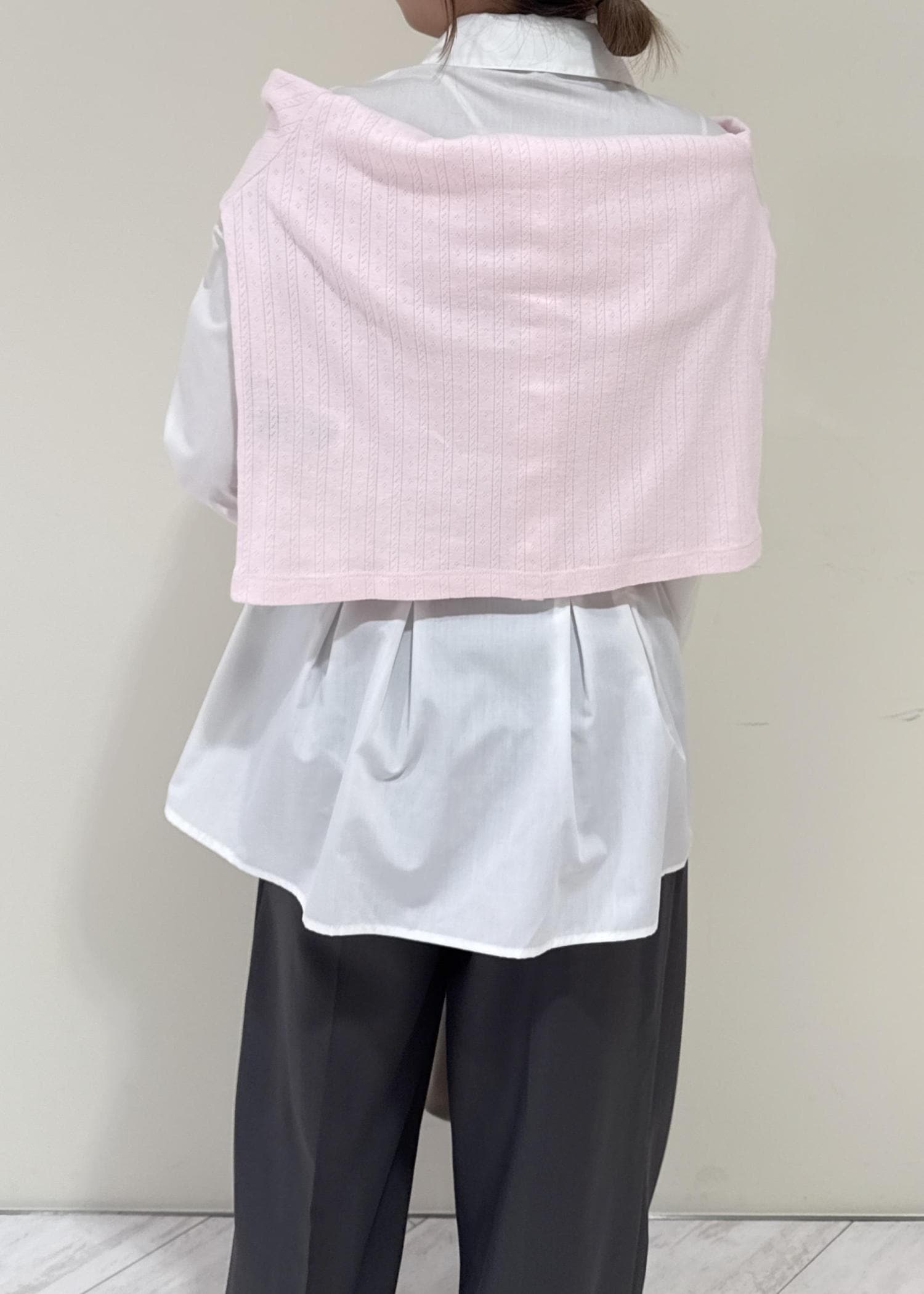白のシャツにグレーのパンツを合わせたシンプルなコーディネートですが、ピンクのカーディガンを肩掛けし、春らしさをプラスするよう意識しました♩