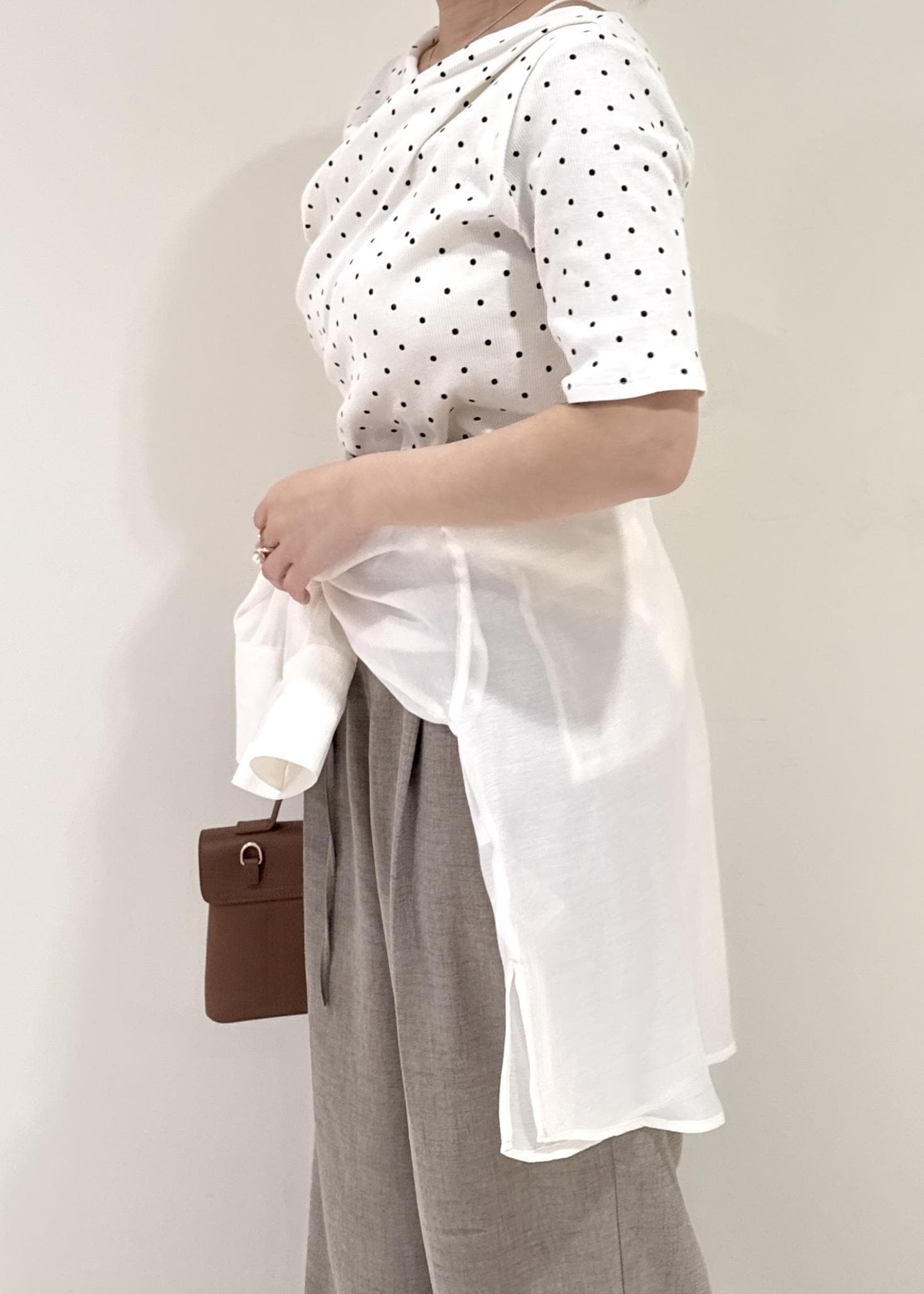 身長152cmだとややヒップが隠れるほどの丈感です。 -