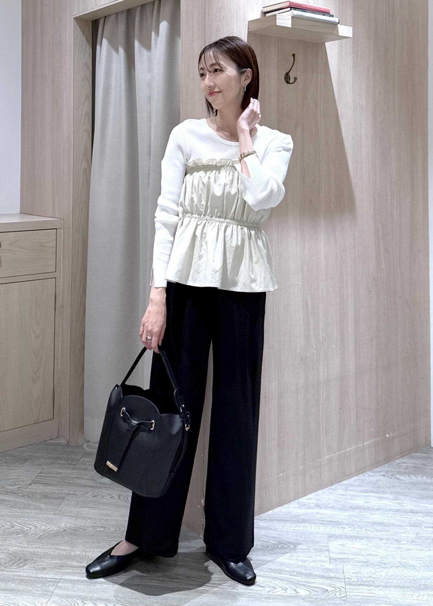 長袖トップスに黒のスラックスならどんな場所でも◎