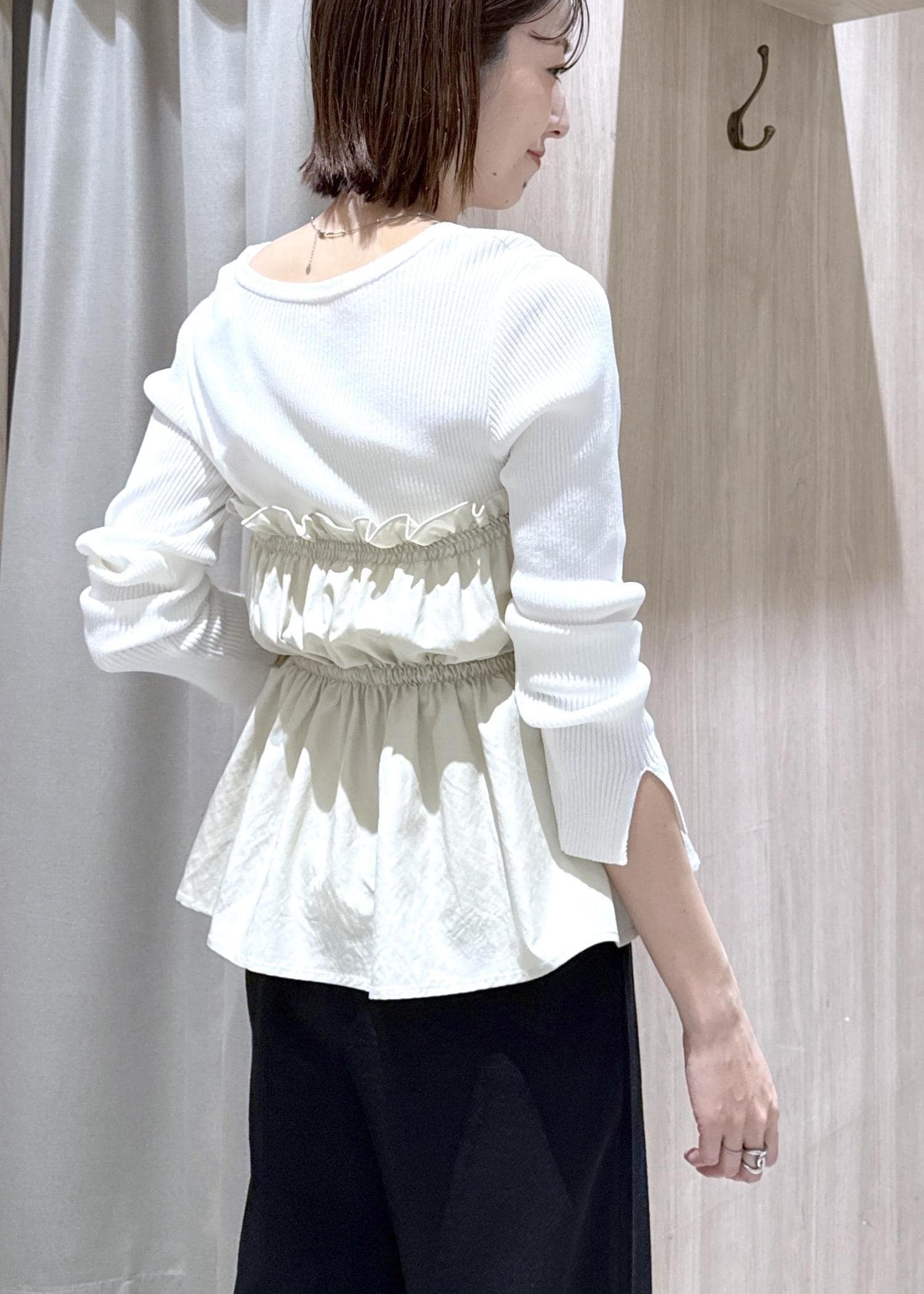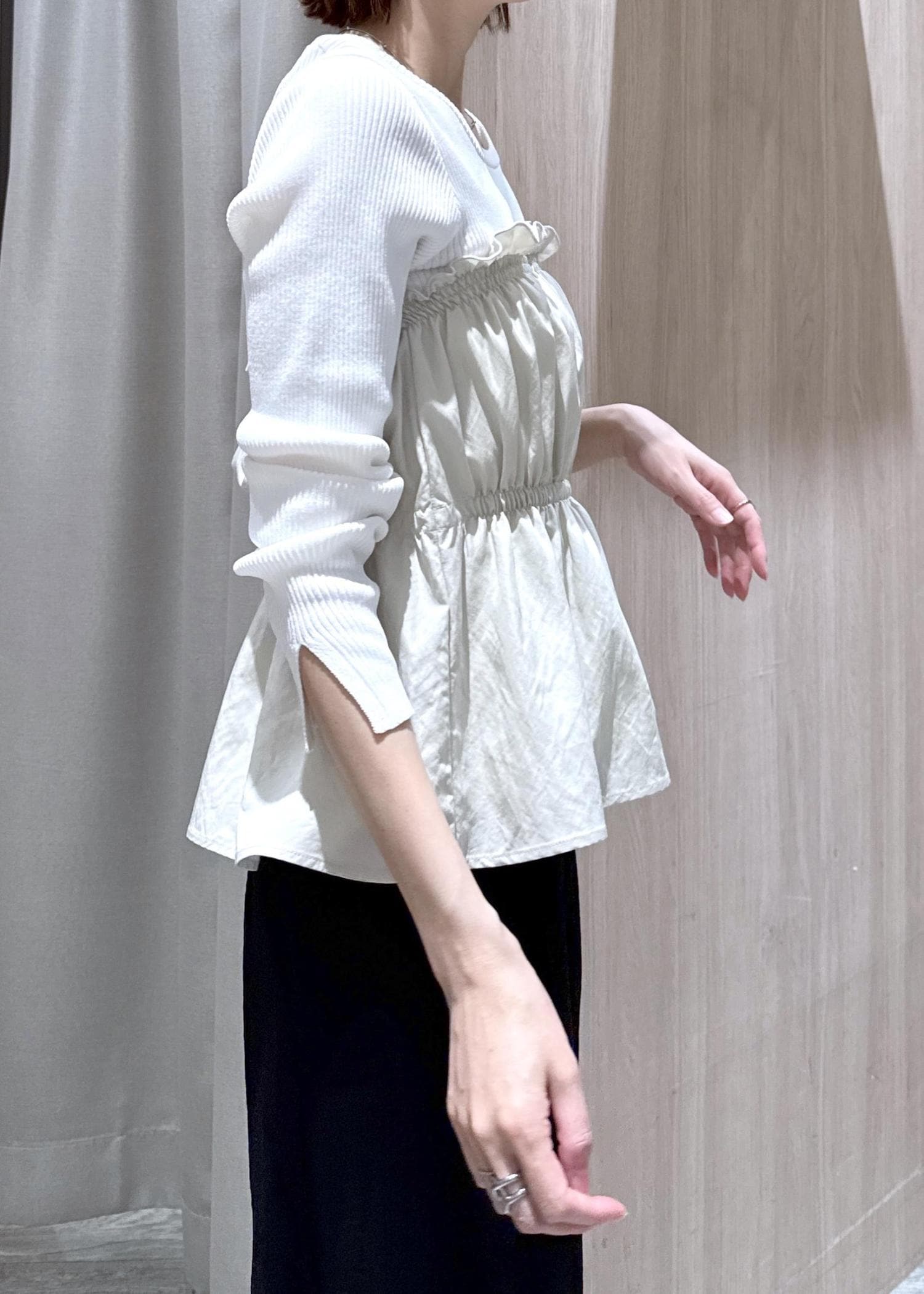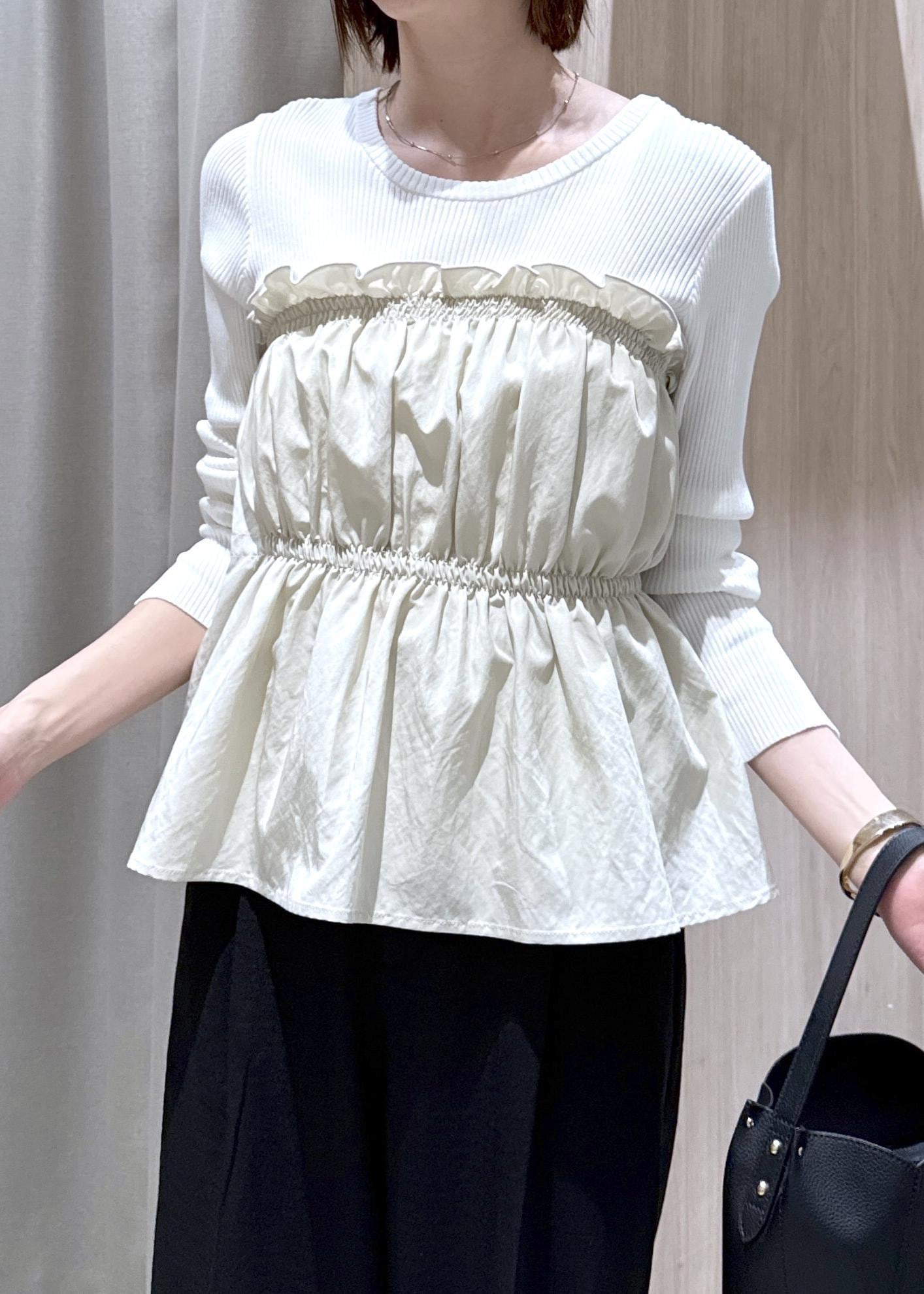 カットソー素材のニットにシャーリングビスチェがドッキングしてあるので、一枚で着映える1着!